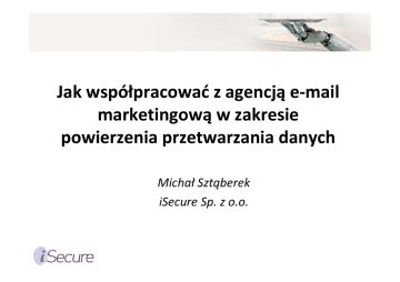 Jak współpracować z agencją e‐mail marketingową w zakresie powierzenia przetwarzania danych Michał Sztąberek iSecure Sp. z o.o. Agenda • Kilka podstawowych pojęć • Przegląd obowiązków spoczywających na administratorze danych • Zgoda na przetwarzanie danych osobowych w UODO i UŚUDE • Umowa powierzenia przetwarzania danych osobowych • Odpowiedzialność stron umowy Kilka podstawowych pojęć • dane osobowe ‐ wszelkie informacje dotyczące zidentyfikowanej lub możliwej do zidentyfikowania osoby fizycznej. Osobą możliwą do zidentyfikowania jest osoba, której tożsamość można określić bezpośrednio lub pośrednio, w szczególności przez powołanie się na numer identyfikacyjny albo jeden lub kilka specyficznych czynników określających jej cechy fizyczne, fizjologiczne, umysłowe, ekonomiczne, kulturowe lub społeczne. Ciekawostka: adres e‐mail, adres IP • przetwarzanie danych ‐ jakiekolwiek operacje wykonywane na danych osobowych, takie jak zbieranie, utrwalanie, przechowywanie, opracowywanie, zmienianie, udostępnianie i usuwanie, a zwłaszcza te, które wykonuje się w systemach informatycznych Kilka podstawowych pojęć • informacja handlowa ‐ każda informacja przeznaczona bezpośrednio lub pośrednio do promowania towarów, usług lub wizerunku przedsiębiorcy lub osoby wykonującej zawód, której prawo do wykonywania zawodu jest uzależnione od spełnienia wymagań określonych w odrębnych ustawach, z wyłączeniem informacji umożliwiającej porozumiewanie się za pomocą środków komunikacji elektronicznej z określoną osobą oraz informacja o towarach i usługach niesłużących osiągnięciu efektu handlowego pożądanego przez podmiot, który zleca jej rozpowszechnianie, w szczególności bez wynagrodzenia lub innych korzyści od producentów, sprzedawców i świadczących usługi Kilka podstawowych pojęć • administrator danych (ADO) – organ, jednostka organizacyjna, podmiot lub osoba decydująca o celach i środkach przetwarzania danych osobowych. Administratorem danych będzie na przykład firma będąca właścicielem bazy e‐mailowej, do której ma być robiona wysyłka marketingowa • procesor – podmiot (inna firma), któremu ADO powierzył dane osobowe w oparciu o pisemną umowę zgodnie z art. 31 ust. 1 UODO Przegląd obowiązków ADO • Legitymowanie się jedną z przesłanek dopuszczalności przetwarzania danych osobowych • Przestrzeganie zasad przetwarzania danych: adekwatność, celowość i czasowość • Dopełnienie obowiązku informacyjnego • Dopełnienie obowiązku zabezpieczenia danych od strony organizacyjnej • Dopełnienie obowiązku zabezpieczenia danych od strony technicznej • Legalny outsourcing przetwarzania danych osobowych Przegląd obowiązków ADO • Legalne udostępnianie danych osobowych • Rejestracja zbiorów w GIODO Zgoda na przetwarzanie danych osobowych w UODO • zgoda osoby, której dane dotyczą to oświadczenie woli, którego treścią jest zgoda na przetwarzanie danych osobowych tego, kto składa oświadczenie; zgoda nie może być domniemana lub dorozumiana z oświadczenia woli o innej treści [art. 7 pkt. 5] • zgoda jako jedna z pięciu przesłanek legalnego przetwarzania danych osobowych [art. 23 ust. 1 pkt. 1] • pisemna zgoda jeżeli przetwarzane mają być tzw. dane wrażliwe np. informacje o stanie zdrowia [art. 27 ust. 2 pkt. 1] Zgoda na przetwarzanie danych osobowych w UŚUDE • zgoda w UŚUDE [art. 4]: ‐ nie może być domniemana lub dorozumiana z oświadczenia woli o innej treści ‐ może być odwołana w każdym czasie ‐ konieczność wykazania uzyskania zgody dla celów dowodowych • konieczność uzyskania zgody na otrzymywanie informacji handlowych, w szczególności poprzez udostępnienie w tym celu adresu elektronicznego [art. 10 ust. 2] • odesłanie w zakresie przetwarzania danych do UODO, chyba że UŚUDE przewiduje inne reguły (wyjątki) [art. 16 ust. 1] Umowa powierzenia przetwarzania danych ADO samodzielne przetwarzanie danych outsourcing powierzenie przetwarzania Umowa powierzenia przetwarzania danych • Administrator danych może powierzyć innemu podmiotowi, w drodze umowy zawartej na piśmie, przetwarzanie danych [art. 31 ust. 1 UODO] • Elementy niezbędne umowy powierzenia: ‐ umowa sporządzona na piśmie ‐ określenie celu powierzenia (przeznaczenia danych np. świadczenie usług e‐mail marketingu na bazie danych należącej do ADO) ‐ określenie zakresu powierzenia (rodzaju danych) ‐ podjęcie środków zabezpieczających zbiór danych (środki organizacyjne i techniczne – Rozdział 5 UODO) Umowa powierzenia przetwarzania danych §2 1. Zleceniobiorca może przetwarzać dane osobowe przekazane przez Zleceniodawcę wyłącznie w zakresie oraz w celu zgodnym z niniejszą Umową. 2. W celu wykonania postanowień niniejszej Umowy Zleceniobiorca może przetwarzać dane osobowe wyłącznie w celu wykonywaniu usługi e‐mail marketingu polegającej na ……............ Umowa powierzenia przetwarzania danych §2 1. Zleceniobiorca może przetwarzać dane osobowe przekazane przez Zleceniodawcę wyłącznie w zakresie oraz w celu zgodnym z niniejszą Umową. 2. W celu wykonania postanowień niniejszej Umowy Zleceniobiorca może przetwarzać dane osobowe wyłącznie w celu wykonywaniu usługi e‐mail marketingu polegającej na ……............ 3. W celu wykonania obowiązków wynikających z niniejszej Umowy Zleceniobiorca może przetwarzać takie dane osobowe jak: imię, nazwisko i adres e‐mail. Umowa powierzenia przetwarzania danych §3 1. Zleceniobiorca jest zobowiązany do przestrzegania przepisów ustawy z dnia 29 sierpnia 1997 r. o ochronie danych osobowych (tekst jednolity: Dz. U. z 2002 r. Nr 101, poz. 926 ze zm.) oraz przepisów wykonawczych. 2. Zleceniobiorca oświadcza, że przed rozpoczęciem przetwarzania danych podejmie środki techniczne i organizacyjne mające na celu zabezpieczenie powierzonych da