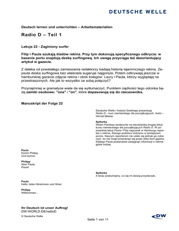 Deutsch lernen und unterrichten – Arbeitsmaterialien Radio D – Teil 1 Lekcja 22 - Zaginiony surfer Filip i Paula szukają śladów rekina. Przy tym dokonują specyficznego odkrycia: w basenie portu znajdują deskę surfingową. Ich uwagę przyciąga też dezorientujący artykuł w gazecie. Z daleka od powstałego zamieszania redaktorzy badają historię tajemniczego rekina. Zepsuta deska surfingowa bez właściela sugeruje najgorsze. Potem odkrywają jeszcze w hamburskiej gazecie zdjęcie rekina i obok kolegów: Laury i Paula, którzy wyglądają na przestraszonych. Ale jak to wszystko ze sobą połączyć? Przynajmniej w gramatyce wiele da się wytłumaczyć. Punktem ciężkości tego odcinka będą zaimki osobowe: "ona" i "on", które dopasowują się do rzeczownika. Manuskript der Folge 22 Deutsche Welle i Instytut Goethego prezentują: Radio D – kurs niemieckiego dla początkujących. Autor – Herrad Meese. Spikerka Witam Państwa serdecznie na dwudziestej drugiej lekcji kursu niemieckiego dla początkujących Radio D. W poprzedniej lekcji Paula i Filip nagrywali w Hamburgu reportaż o rekinie, którego podobno widziano w tamtejszem porcie. Naszym reporterom nie udało się jednak go zobaczyć, bo nie mogli przecisnąć się przez zbity tłum gapiów. Dlatego Paula postanawia zasięgnąć informacji o rekinie gdzie indziej. Paula Komm Philipp. Und tschüs. Philipp Aber Paula, Paula! Spikerka A teraz posłuchajmy, co się im dzisiaj przydarzyło. Paula Hallo, liebe Hörerinnen und Hörer. Philipp Willkommen... Ihr Deutsch ist unser Auftrag! DW-WORLD.DE/radioD © Deutsche Welle Seite 1 von 11 Deutsch lernen und unterrichten – Arbeitsmaterialien Radio D – Teil 1 Paula ... bei Radio D. Philipp Radio D... Paula ... die Reportage. Szene 1: Am Kai des Hamburger Hafens Paula Philipp, guck mal: Was ist denn das? Passant 3 Ein Surfbrett. Das ist ein Surfbrett. Philipp Das war ein Surfbrett. Paula Das ist ja kaputt. Das war bestimmt der Hai. Passant 3 Tja, meen Deern, das war der Hai. Paula Und der Surfer? Wo ist der Surfer? Passantin Tja, das weiß nu niemand, ne. Passant 3 Der ist weg. Die Polizei sucht ihn noch. Philipp Es gibt also ein Surfbrett, aber keinen Surfer? Passantin Ja, ist das nicht schrecklich? Spikerka Czy zauważyli Państwo, że Filip mówi o odkrytej przez Paulę desce surfingowej w czasie przeszłym? Passant 3 Ein Surfbrett. Das ist ein Surfbrett. Philipp Das war ein Surfbrett. Spikerka Filip mówi, że to była deska surfingowa. Mówi tak dlatego, bo deska jest zniszczona i nie nadaje się do użytku. Ihr Deutsch ist unser Auftrag! DW-WORLD.DE/radioD © Deutsche Welle Seite 2 von 11 Deutsch lernen und unterrichten – Arbeitsmaterialien Radio D – Teil 1 Paula Das ist ja kaputt. Spikerka Deska wygląda na pogryzioną przez rekina. Paula pozwala sobie w tej sytuacji na nieco makabryczny żart i mówi: „To na pewno był rekin“. Paula Das war bestimmt der Hai. Spikerka Paula żartuje, ale jeden z gapiów, mówiący silnym, hamburskim dialektem, jest święcie przekonany, że pogryziona deska to sprawka rekina. Passant 3 Tja, meen Deern, das war der Hai. Spikerka No dobrze, mamy pogryzioną deskę, ale co się stało z żeglarzem? Czyżby pożarł go rekin? Żeglarza nie ma, ale policja już go szuka… Paula Und der Surfer? Wo ist der Surfer? Passantin Tja, das weiß nu niemand, ne. Passant 3 Der ist weg. Die Polizei sucht ihn noch. Spikerka Paula i Filip postanawiają poszukać właściciela deski surfingowej na własną rękę. Najpierw jednak muszą się nieco posilić w kiosku z przekąskami.. Posłuchajmy scenki przy kiosku i spróbujmy ustalić, jaką rolę w rozmowie ze sprzedawczynią odgrywają słowa: FISCH czyli ryba i HAMBURGER, czyli kotlet z mielonej wołowiny. Szene 2: Kiosk am Hamburger Hafen (1) Verkäuferin Guten Tag. Was darf’s denn sein? Paula Ein Mineralwasser bitte. Philipp Einen Hamburger. Ihr Deutsch ist unser Auftrag! DW-WORLD.DE/radioD © Deutsche Welle Seite 3 von 11 Deutsch lernen und unterrichten – Arbeitsmaterialien Radio D – Teil 1 Verkäuferin Den haben wir nicht. Philipp Was? In Hamburg gibt’s keinen Hamburger? Verkäuferin Wir sind hier nu mal am Wasser, junger Mann. Und im Wasser leben Fische, keine Hamburger. Philipp Alles klar, Chefin. Ich nehme Fisch und Pommes. Verkäuferin Einmal oder zweimal? Paula Einmal. Verkäuferin Sechs Euro bitte. Spikerka Paula i Filip są w Hamburgu. Mieszkaniec Hamburga to – po niemiecku – Hamburger, co brzmi tak samo, jak kotlet hamburger z kiosku z przekąskami. Ta zbieżność wyrazów nadaje komiczny wydźwięk rozmowie pary naszych reporterów ze sprzedawczynią. Philipp Einen Hamburger. Verkäuferin Den haben wir nicht. Spikerka Filip udaje zdziwienie, że w Hamburgu nie ma „hamburgerów“. Philipp Was? In Hamburg gibt’s keinen Hamburger? Spikerka Sprzedawczyni poucza go, że jest w mieście nadmorskim… Verkäuferin Wir sind hier nu mal am Wasser, junger Mann. Spikerka …a w morzu żyją ryby a nie kotlety, zwane hamburgerami! Ihr Deutsch ist unser Auftrag! DW-WORLD.DE/radioD © Deutsche Welle Seite 4 von 11 Deutsch lernen und unterrichten – Arbeitsmaterialien Radio D – Teil 1 Verkäuferin Und im Wasser leben Fische, keine Hamburger. Spikerka Filip stara się udobruchać sprzedawczynię, mówiąc pojednawczo: „Wszystko jasne, Szefowo“ i zamawia to, czego w Hamburgu nie brakuje – smażoną rybę z frytkami. Philipp Alles klar, Chefin. Ich nehme Fisch und Pommes. Spikerka „Raz czy dwa razy?“ – pyta sprzedawczyni. Chodzi jej o to, czy ma podać jedną, czy dwie porcje ryby. Drugą – dla Pauli. Ale Paula nie jest głodna i zamawia tylko butelkę wody mineralnej. Verkäuferin Einmal oder zweimal? Paula Einmal. Spikerka Woda mineralna to Mineralwasser. Paula Ein Mineralwasser bitte. Spikerka Filip płaci sześć euro i zabiera się do jedzenia. Paula natomiast sączy swoją wodę i rozgląda się ze znudzeniem dookoła. Nagle wpada jej w oko gazeciarz, gło