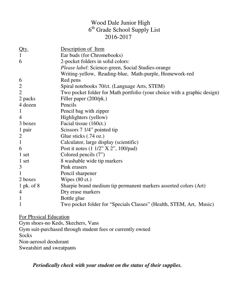 Wood Dale Junior High 6 Grade School Supply List 2016-2017