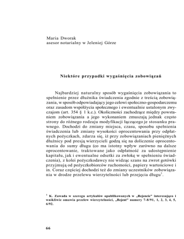 Maria Dworak asesor notarialny w Jeleniej Górze Niektóre przypadki wygaśnięcia zobowiązań Najbardziej naturalny sposób wygaśnięcia zobowiązania to spełnienie przez dłużnika świadczenia zgodnie z treścią zobowiązania, w sposób odpowiadający jego celowi społeczno-gospodarczemu oraz zasadom współżycia społecznego i ewentualnie ustalonym zwyczajom (art. 354 § 1 k.c.). Okoliczności zachodzące między powstaniem zobowiązania a jego wykonaniem zmuszają jednak często strony do różnego rodzaju modyfikacji łączącego je stosunku prawnego. Dochodzi do zmiany miejsca, czasu, sposobu spełnienia świadczenia lub zmiany wysokości oprocentowania przy odpłatnych pożyczkach, zdarza się, iż przy zobowiązaniach pieniężnych dłużnicy pod presją wierzycieli godzą się na doliczenie oprocentowania do sumy długu (co ma istotny wpływ zarówno na dalsze oprocentowanie, traktowane jako odpłatność za udostępnienie kapitału, jak i ewentualne odsetki za zwłokę w spełnieniu świadczenia), z kolei pożyczkodawcy nie widząc szans na zwrot gotówki przyjmują od pożyczkobiorców ruchomości, papiery wartościowe i in. Coraz częściej dochodzi też do zmiany uczestników zobowiązania w drodze przelewu wierzytelności lub przejęcia długu 1 . 1 K. Zawada w szeregu artykułów opublikowanych w „Rejencie" interesująco i wnikliwie omawia przelew wierzytelności, „Rejent" numery 7-8/91, 1, 2, 3, 4, 5, 6/92. 66 Niektóre przypadki wygaśnięcia zobowiązań W ostatnich latach powstało wiele tzw. lombardów (nazywanych niekiedy szumnie zakładami usług finansowych), z usług których korzysta wiele osób. Często nie wywiązują się one z obowiązku zwrotu pożyczonej sumy pieniędzy. Dochodzi wówczas niejednokrotnie do przenoszenia (w różnych formach prawnych, najczęściej w formie sprzedaży) na rzecz pożyczkodawców własności co cenniejszych rzeczy ruchomych, a nawet nieruchomości należących do pożyczkobiorcy. Zawierane w takich okolicznościach umowy pozostają zatem w ścisłym związku z wcześniejszą umową pożyczki. Wszystko to powoduje, że coraz częściej sięgamy do tych przepisów prawnych dotyczących wygaśnięcia zobowiązania, które choć od dawna obowiązują, nie były w praktyce wykorzystywane. W wymienionych wyżej sytuacjach zastosowanie mogą znaleźć zwłaszcza takie instytucje, jak świadczenie w miejsce wypełnienia (datio in solutum) oraz odnowienie zobowiązania ( n o v a t i o ) . Dodajmy, że obie te instytucje zwykle omawiane są w literaturze bardzo ogólnie, przy okazji rozważań dotyczących wygaśnięcia zobowiązań 2 . 2 K. Gandor, [w:] System prawa cywilnego. Prawo zobowiązań, część ogólna (pod red. Z. Radwańskiego), Warszawa 1981, s. 849 i n.; A. Ohanowicz, J. Górski, Zarys prawa zobowiązań, Warszawa 1970, s. 212-226; Z. Radwański, Prawo zobowiązań, Warszawa 1986, s. 281-283; W. Czachórski, Zobowiązania - zarys wykładu, Warszawa 1983, s. 279-280, 283-285; J. Skąpski, [w:] S. Grzybowski, J. Skąpski, M. Sośniak, S. Włodyka, S. Wójcik, Prawo cywilne, Warszawa 1972, s. 213, 233; A. Oleszko, Pytania i odpowiedzi, „Rejent" nr 11/92, s. 81-84. Gdy idzie o literaturę dotyczącą uregulowania zawartego w kodeksie zobowiązań, zob. zwłaszcza: F. Zoll, Zobowiązania w zarysie według polskiego kodeksu zobowiązań, Warszawa 1945, (autor omawia obie instytucje w rozdziale „Wygaśnięcie zobowiązań", przy czym datio in solutum w ramach problematyki wykonania zobowiązań, zaś odnowienie - j a k o samodzielną podstawę wygaśnięcia zobowiązań, obok wykonania zobowiązania, potrącenia, niemożliwości świadczenia, wygaśnięcia lub zmiany zobowiązania ze względu na nadzwycząjne wypadki, zwolnienia z długu i rozwiązania umowy...); R Longchamps de Berier, Zobowiązania, w opracowaniu J. Górskiego, Poznań 1948, s. 324-325, 337-338, 339-404; Encyklopedia Podręczna Prawa Prywatnego pod red. F. Zolla i J. Wasilkowskiego, tom drugi, s. 1089-1100. 67 REJENT Nr 10 - październik 1993 r. II. Świadczenie w miej sce wypełnienia (zwane również świadczeniem w miejsce wykonania) opiera się na umowie, mocą której strony stosunku obligacyjnego (wierzyciel i dłużnik) rezygnują z umorzenia zobowiązania poprzez spełnienie umówionego (właściwego) świadczenia, a dłużnik, za zgodą wierzyciela, mając na celu zwolnienie się z zobowiązania, spełnia inne świadczenie. Kodeks cywilny reguluje się tę instytucję w przepisie art. 453 k.c., zawartym w tytule VII księgi III - Wykonanie zobowiązań i skutki ich niewykonania. Ponieważ dłużnik wypełnia inne świadczenia w celu zwolnienia się z zobowiązania, samo wypełnienie owego innego świadczenia powoduje wygaśnięcie pierwotnego zobowiązania między stronami (wraz z zabezpieczeniami). Skoro zaś świadczenie w miejsce wypełnienia polega na spełnieniu innego świadczenia, którego przedmiot może mieć wady (fizyczne lub prawne), kodeks cywilny stanowi, że dłużnik obowiązany jest wówczas do rękojmi za wady według przepisów o rękojmi przy sprzedaży. Godnym podkreślenia jest, że mocą świadczenia w miejsce wypełnienia pierwotne zobowiązanie między stronami wygasa i nie ma w zasadzie możliwości „reanimowania go"3. Gdyby zatem przedmiot świadczenia w miejsce wypełnienia posiadał wady fizyczne lub prawne, wierzyciel ma w stosunku do dłużnika roszczenia z tytułu rękojmi. Nie może natomiast żądać pierwotnie umówionego świadczenia, ponieważ godząc się na datio in solutum dał w zamian swoją wierzytelność i doprowadził w ten sposób do wygaśnięcia pierwotnego zobowiązania, jak też związanych z nim zabezpieczeń (zastaw, hipoteka, poręczenie). Jeszcze raz podkreślić trzeba, że koniecznym warunkiem wygaśnięcia w omawianym przypadku zobowiązania jest rzeczywiste spełnienie przez dłużnika świadczenia w miejsce wypełnie- 3 Chyba że wierzyciel skorzysta z prawa odstąpienia od u