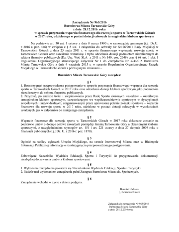 Zarządzenie Nr 965/2016 Burmistrza Miasta Tarnowskie Góry z dnia 28.12.2016 roku w sprawie przyznania wsparcia finansowego dla rozwoju sportu w Tarnowskich Górach w 2017 roku, udzielonego w postaci dotacji celowych tarnogórskim klubom sportowym Na podstawie art. 30 ust. 1 ustawy z dnia 8 marca 1990 r. o samorządzie gminnym (t.j.: Dz.U. z 2016 r. poz. 446) w związku z § 8 ust. 1 załącznika do uchwały Nr X/126/2011 Rady Miejskiej w Tarnowskich Górach z dnia 25 maja 2011 r. w sprawie finansowego wspierania rozwoju sportu w Tarnowskich Górach oraz określenia warunków i trybu udzielania dotacji podmiotom niezaliczanym do sektora finansów publicznych (Dz. Urz. Woj. ŚLA z 2011 r. Nr 140, poz. 2649) oraz § 68 ust. 1 pkt. 1 Regulaminu Organizacyjnego stanowiącego Załącznik Nr 1 do Zarządzenia Nr 324/2015 Burmistrza Miasta Tarnowskie Góry z dnia 4 września 2015 r. w sprawie Regulaminu Organizacyjnego Urzędu Miejskiego w Tarnowskich Górach z późniejszymi zmianami – Burmistrz Miasta Tarnowskie Góry zarządza: §1 1. Rozstrzygnąć przeprowadzone postępowanie w sprawie przyznania finansowego wsparcia dla rozwoju sportu w Tarnowskich Górach w 2017 roku oraz udzielenia dotacji klubom sportowym jako podmiotom niezaliczanym do sektora finansów publicznych. 2. Przyznać, po analizie treści i zaopiniowaniu przez Radę Sportu złożonych wniosków – określonym tarnogórskim klubom sportowym, uczestniczącym we współzawodnictwie sportowym w dyscyplinach zespołowych i indywidualnych, zorganizowanym przez uprawnione polskie związki sportowe – wsparcie finansowe dla rozwoju sportu w 2017 roku, udzielone w postaci dotacji celowych w wysokościach ustalonych, jak w załączniku do niniejszego zarządzenia. §2 Wsparcie finansowe dla rozwoju sportu w Tarnowskich Górach w 2017 roku dokonane zostanie na podstawie umów o dotacje celowe zawartych pomiędzy Gminą Tarnowskie Góry a określonymi klubami sportowymi, z uwzględnieniem wymogów art. 151 i art. 221 ustawy z dnia 27 sierpnia 2009 roku o finansach publicznych (t.j.: Dz. U. z 2016 r. poz. 1870). §3 Ogłosić na tablicy ogłoszeń Urzędu Miejskiego, na stronie internetowej Miasta oraz w Biuletynie Informacji Publicznej informację o rozstrzygnięciu przeprowadzonego postępowania. §4 Zobowiązać Naczelnika Wydziału Edukacji, Sportu i Turystyki do przygotowania dokumentacji niezbędnej do zawarcia umów z klubami sportowymi. §5 1. Wykonanie zarządzenia powierza się Naczelnikowi Wydziału Edukacji, Sportu i Turystyki. 2. Nadzór nad wykonaniem zarządzenia pełni Zastępca Burmistrza Miasta ds. Społecznych. Zarządzenie wchodzi w życie z dniem podjęcia. §6 Burmistrz Miasta (-) Arkadiusz Czech Załącznik do zarządzenia Nr 965/2016 Burmistrza Miasta Tarnowskie Góry z dnia 28.12.2016 roku Kwoty dotacji przyznanych Klubom Sportowym na podstawie Uchwały Nr X/126/2011 Rady Miejskiej w Tarnowskich Górach z dnia 25 maja 2011 r. w sprawie finansowego wspierania rozwoju sportu w Tarnowskich Górach oraz określenia warunków i trybu udzielania dotacji podmiotom niezaliczanym do sektora finansów publicznych Lp. Nazwa klubu sportowego Wnioskowana kwota dotacji [zł] Przyznana kwota dotacji [zł] 141 180 100 366 97 875 39 512 157 300 157 300 40 543 17 713 UKS „UNIA STRZYBNICA” 117 600 33 857 6 SSz „STRZYBNICZANKA” 35 550 15 587 7 TS „ISKRA" Lasowice 56 870 25 449 8 TS „GWAREK" 253 520 64 848 9 MKS „PARK WODNY" 444 000 160 163 10 UKS Judo „AHINSA" 56 600 42 087 11 TS „TARNOWICZANKA" 68 500 33 418 12 KS „GÓRNIK" Bobrowniki Śl. 81 800 44 420 13 TKS „KARATE" 211 000 129 576 14 UKS „TRÓJKA” 56 170 22 848 15 UKS „GWIAZDA” 50 820 21 699 16 LKS „ZGODA” Repty Śl. 75 240 25 360 17 KORiS ,,ŚLĄSK” 27 680 0 18 UKS „G4” 35 720 8 462 19 SDC TARNOWSKIE GÓRY 20 500 0 20 RAZEM 2 028 468 942 665 1 UKHT „ÓSEMKA" 2 KKS TARNOWSKIE GÓRY 3 MKS „SKARBEK" 4 UKS „DWÓJKA" 5 Burmistrz Miasta (-) Arkadiusz Czech