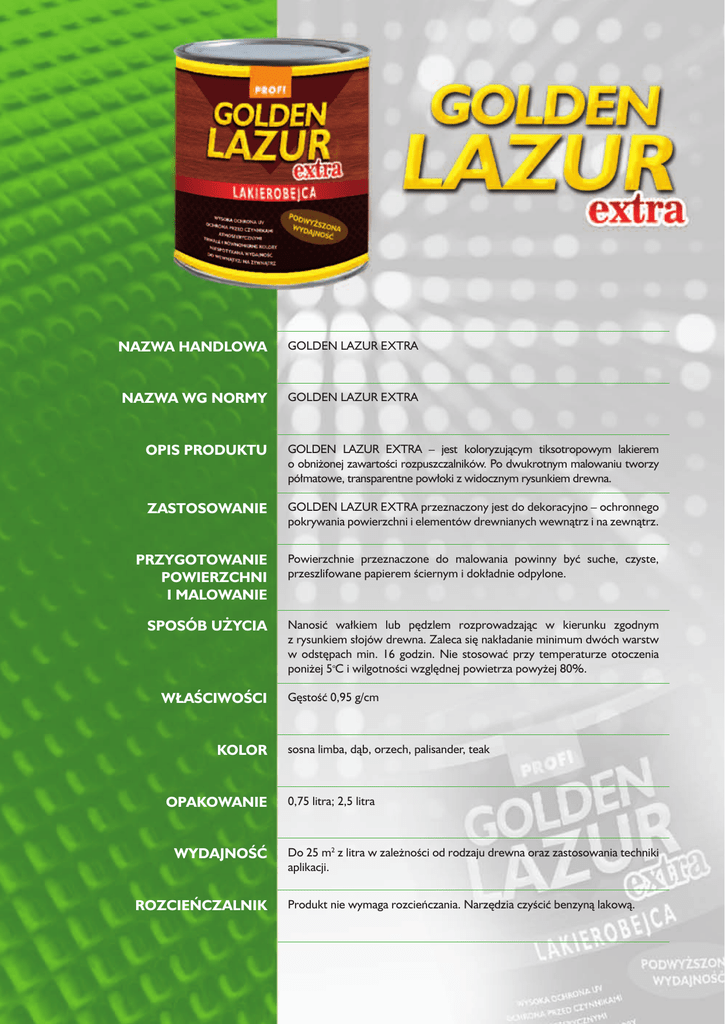NAZWA HANDLOWA GOLDEN LAZUR EXTRA NAZWA WG NORMY GOLDEN LAZUR EXTRA OPIS PRODUKTU GOLDEN LAZUR EXTRA – jest koloryzującym tiksotropowym lakierem o obniżonej zawartości rozpuszczalników. Po dwukrotnym malowaniu tworzy półmatowe, transparentne powłoki z widocznym rysunkiem drewna. ZASTOSOWANIE GOLDEN LAZUR EXTRA przeznaczony jest do dekoracyjno – ochronnego pokrywania powierzchni i elementów drewnianych wewnątrz i na zewnątrz. PRZYGOTOWANIE POWIERZCHNI I MALOWANIE Powierzchnie przeznaczone do malowania powinny być suche, czyste, przeszlifowane papierem ściernym i dokładnie odpylone. SPOSÓB UŻYCIA Nanosić wałkiem lub pędzlem rozprowadzając w kierunku zgodnym z rysunkiem słojów drewna. Zaleca się nakładanie minimum dwóch warstw w odstępach min. 16 godzin. Nie stosować przy temperaturze otoczenia poniżej 5oC i wilgotności względnej powietrza powyżej 80%. WŁAŚCIWOŚCI KOLOR OPAKOWANIE WYDAJNOŚĆ ROZCIEŃCZALNIK Gęstość 0,95 g/cm sosna limba, dąb, orzech, palisander, teak 0,75 litra; 2,5 litra Do 25 m2 z litra w zależności od rodzaju drewna oraz zastosowania techniki aplikacji. Produkt nie wymaga rozcieńczania. Narzędzia czyścić benzyną lakową. PARAMETRY TECHNICZNE Dyspersja specjalnych transparentnych pigmentów nieorganicznych w roztworze żywicy alkidowej w rozpuszczalniku, bezaromatyczna oraz z dodatkiem specjalnych domieszek WSKAZÓWKI BHP I PPOŻ. Preparat z domieszką biobójczą. Zawiera butanonoxim. Może wywołać reakcję uczuleniową. Szkodliwy dla organizmów wodnych, może wywołać długotrwałe niekorzystne skutki w środowisku wodnym. Wskazówki ogólne: O ile pojawią się problemy zdrowotne albo w przypadku wątpliwości zwrócić się o pomoc lekarską. Przy inhalacji: Wyprowadzić poszkodowanego na świeże powietrze. Przy przedostaniu się do oczu: 10 – 15 minut wypłukiwać strumieniem wody i zwrócić się do lekarza. Przy spożyciu: Nie wywoływać wymiotów, natychmiast wypłukać usta i wypić 0,5 l wody, jak najszybciej doprowadzić poszkodowanego do lekarza. Przy kontakcie ze skórą: Zabrudzone i przemoczone ubranie natychmiast zdjąć, naskórek zmyć wodą i mydłem. TRANSPORT I PRZECHOWYWANIE Składować w suchym miejscu przy temperaturze od +5 do +25oC.