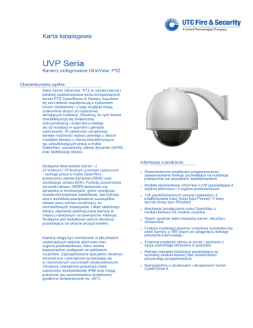 Karta katalogowa UVP Seria Kamery zintegrowane UltraView, PTZ Charakterystyka ogólna Seria kamer UltraView PTZ to udoskonalona i bardziej zaawansowana seria zintegrowanych kamer PTZ CyberDome II. Kamery kopułowe tej serii dobrze współpracują z systemami innych dostawców i z tego względu mogą znakomicie służyć do rozbudowy istniejących instalacji. Obudowy do tych kamer charakteryzują się zwiększoną wytrzymałością i dzięki temu nadają się do instalacji w szerokim zakresie zastosowań. W zależności od aplikacji, istnieje możliwość wyboru jednego z dwóch modułów kamery o różnej charakterystyce, np. umożliwiających pracę w trybie Dzień/Noc, poszerzony zakres dynamiki (WDR) oraz stabilizację obrazu. Informacja o produkcie Dostępne dwa moduły kamer - z 27-krotnym i 37-krotnym zoomem optycznym - cechuje praca w trybie Dzień/Noc, poszerzony zakres dynamiki (WDR) oraz stabilizacja obrazu (EIS). Funkcja poszerzenia dynamiki obrazu (WDR) doskonale się sprawdza w lokalizacjach, gdzie występuje wysoko-kontrastowe oświetlenie, zaś cyfrowy zoom umożliwia powiększenie szczegółów obrazu poza zakres uzyskiwany ze standardowych obiektywów. Układ stabilizacji obrazu zapewnia stabilną pracę kamery w miejscu narażonym na zewnętrzne wibracje. Dostępna jest dodatkowa osłona obudowy pozwalająca na ukrycie pozycji kamery. E Wszechstronne możliwości programowania i zaawansowane funkcje pozwalające na instalację praktycznie we wszystkich zastosowaniach E Modele standardowe UltraView (UVP) posiadające 4 wejścia alarmowe i 2 wyjścia przekaźnikowe E 128 predefiniowanych pozycji (presetów), 4 predfiniowane trasy (trasy typu Preset) i 4 trasy ręczne (trasy typu Shadow) E Możliwość przełączania trybu Dzień/Noc z modułu kamery lub modułu czujnika E Wybór spośród wielu modułów kamer, obudów i akcesoriów E Funkcja szybkiego powrotu umożliwia automatyczny Kamery mogą być montowane w obudowach zawierających wejścia alarmowe oraz wyjścia przekaźnikowe, które można bezpośrednio podłączać do pobliskich czujników. Zaprojektowane specjalnie obudowy wewnętrzne i zewnętrzne sprawdzają się w różnorodnych warunkach środowiskowych. Obudowy zewnętrzne posiadają klasę odporności środowiskowej IP66 oraz mogą pracować (po zamontowaniu dodatkowej grzałki) w temperaturach do -40°C. obrót kamery o 180 stopni po osiągnięciu dolnego położenia krańcowego E Zmienna prędkość obrotu w pionie i poziomie z opcją powolnego obracania w poziomie E Pamięć ustawień lokalizacji pozwalająca na wymianę modułu kamery bez konieczności ponownego programowania E Kompatybilne z obudowami i akcesoriami kamer CyberDome II UVP Seria Kamery zintegrowane UltraView, PTZ Specyfikacja Charakterystyka ogólna E Zakres temperatur pracy: od 0°C do 60°C; z grzałką od -40°C do 60°C, dla kamer wandaloodpornych z grzałką i wentylatorem od -25°C do 60°C E Zasilanie: 25W uruchomienie, 20W praca; z grzałką: 93W uruchomienie, 45W praca E Prędkość obrotu w poziomie, ręczna: od 0.5 do 200°/s E Prędkość obrotu w pionie, ręczna: od 0.5 do 120°/s E Max. prędkość w pionie / poziomie: 340°/s E Ustawienia zdefiniowane (presety): 128 z 24 znakowymi nazwami E Trasy predefiniowane (typu preset): 4 trasy z 64 pozycjami (presetami) każda E Protokoły: Digiplex RS422, Impac RS485, ASCII RS422, Pelco D, Pelco P, Pelco Coaxitron, Ultrak, AD 4800, AD Manchester, BBV, Bosch Biphase, Bosch RS232, KD6, Panasonic, VCL, Vicon Specyfikacja kamery Kamera: 27x Dzień/Noc z WDR E E E E E E E Przetwornik obrazu: 1/4" CCD Zoom: Optyczny 27x; cyfrowy 12x Rozdzielczość: 540 TVL PAL Obiektyw: od 3.25 mm (szeroki) do 88 mm (tele); od F1.5 do F3.8 Czułość: 0.6 lux, 1/50 sek. PAL Czułość, ICR-off: 0.01 lux, 1/3 sek. PAL Migawka elektroniczna: od 1/50 do 1/90,000 sek., PAL Kamera: 37x Dzień/Noc z WDR E E E E E E E Przetwornik obrazu: 1/4" CCD Zoom: Optyczny 37x; cyfrowy 12x Rozdzielczość: 540 TVL PAL Obiektyw: 3.5 mm (szeroki) do 129 mm (tele); F1.5 do F4.1 Czułość: 0.6 lux , 1/50 sek. PAL Czułość, ICR-off: 0.01 lux, 1/3 sek. PAL Migawka elektroniczna: od 1/50 do 1/90,000 sek., PAL Rysunek Jak zamawiać UVP Seria Kamery zintegrowane UltraView, PTZ UTC Fire & Security zastrzega sobie prawo do zmian specyfikacji produktu bez uprzedzenia. Aktualne specyfikacje produktów można znaleźć na stronie www.gesecurity.pl lub kontaktując się z regionalnym przedstawicielem handlowym. IPS-PL-UVP Seria-2011-12-1 07:27:12 Released : 01-DEC-11