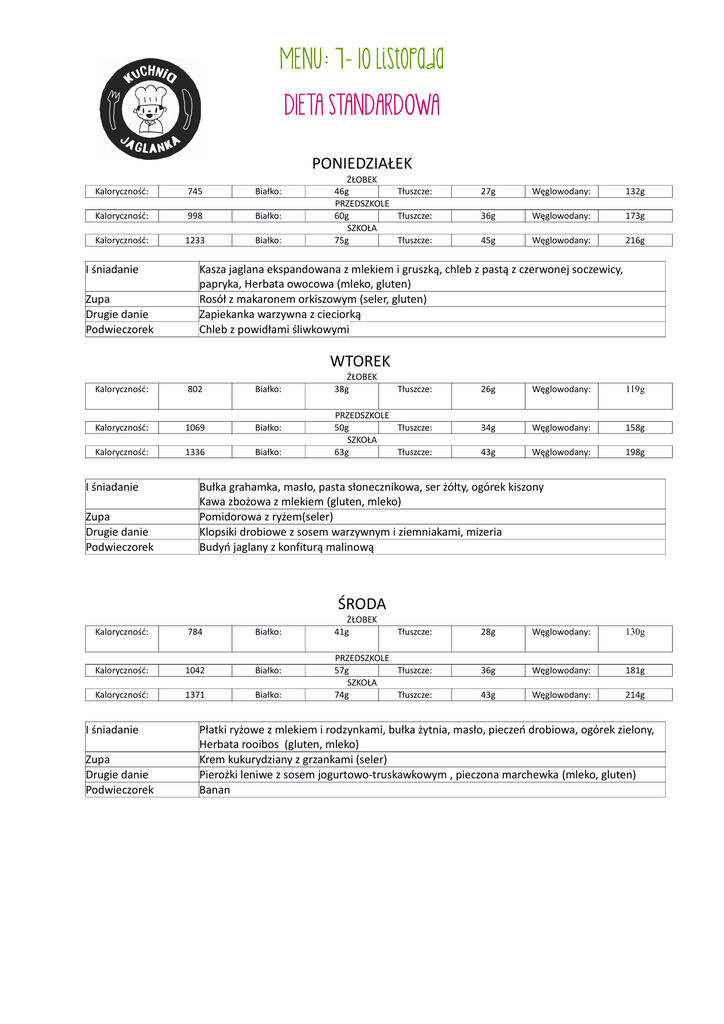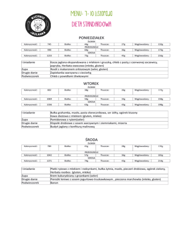 MENU: 7- 10 listopada DIETA STANDARDOWA PONIEDZIAŁEK Kaloryczność: 745 Białko: Kaloryczność: 998 Białko: Kaloryczność: 1233 Białko: I śniadanie Zupa Drugie danie Podwieczorek ŻŁOBEK 46g Tłuszcze: PRZEDSZKOLE 60g Tłuszcze: SZKOŁA 75g Tłuszcze: 27g Węglowodany: 132g 36g Węglowodany: 173g 45g Węglowodany: 216g Kasza jaglana ekspandowana z mlekiem i gruszką, chleb z pastą z czerwonej soczewicy, papryka, Herbata owocowa (mleko, gluten) Rosół z makaronem orkiszowym (seler, gluten) Zapiekanka warzywna z cieciorką Chleb z powidłami śliwkowymi WTOREK Kaloryczność: 802 Białko: Kaloryczność: 1069 Białko: Kaloryczność: 1336 Białko: I śniadanie Zupa Drugie danie Podwieczorek ŻŁOBEK 38g Tłuszcze: PRZEDSZKOLE 50g Tłuszcze: SZKOŁA 63g Tłuszcze: 26g Węglowodany: 119g 34g Węglowodany: 158g 43g Węglowodany: 198g Bułka grahamka, masło, pasta słonecznikowa, ser żółty, ogórek kiszony Kawa zbożowa z mlekiem (gluten, mleko) Pomidorowa z ryżem(seler) Klopsiki drobiowe z sosem warzywnym i ziemniakami, mizeria Budyń jaglany z konfiturą malinową ŚRODA Kaloryczność: 784 Białko: Kaloryczność: 1042 Białko: Kaloryczność: 1371 Białko: I śniadanie Zupa Drugie danie Podwieczorek ŻŁOBEK 41g Tłuszcze: PRZEDSZKOLE 57g Tłuszcze: SZKOŁA 74g Tłuszcze: 28g Węglowodany: 130g 36g Węglowodany: 181g 43g Węglowodany: 214g Płatki ryżowe z mlekiem i rodzynkami, bułka żytnia, masło, pieczeń drobiowa, ogórek zielony, Herbata rooibos (gluten, mleko) Krem kukurydziany z grzankami (seler) Pierożki leniwe z sosem jogurtowo-truskawkowym , pieczona marchewka (mleko, gluten) Banan MENU: 7- 10 listopada CZWARTEK Kaloryczność: 852 Białko: Kaloryczność: 1085 Białko: Kaloryczność: 1314 Białko: I śniadanie Zupa Drugie danie Podwieczorek ŻŁOBEK 42g Tłuszcze: PRZEDSZKOLE 56g Tłuszcze: SZKOŁA 69g Tłuszcze: 27g Węglowodany: 118g 34g Węglowodany: 156g 43g Węglowodany: 194g Chleb żytni, masło, pasztet drobiowy, jajecznica ze szczypiorem, pomidor Kakao (mleko gluten) Jarzynowa (seler) Gulasz wołowy z brązową soczewicą, kasza gryczana, buraczki Ciasto jogurtowe z owocami (mleko, gluten) MENU: 7- 10 listopada DIETA WEGETARIAŃSKA PONIEDZIAŁEK Kaloryczność: 741 Białko: Kaloryczność: 994 Białko: Kaloryczność: 1229 Białko: I śniadanie Zupa Drugie danie Podwieczorek ŻŁOBEK 40g Tłuszcze: PRZEDSZKOLE 54g Tłuszcze: SZKOŁA 71g Tłuszcze: 27g Węglowodany: 132g 36g Węglowodany: 173g 45g Węglowodany: 216g Kasza jaglana ekspandowana z mlekiem i gruszką, chleb z pastą z czerwonej soczewicy, papryka, Herbata owocowa (mleko, gluten) Rosół jarski z makaronem orkiszowym (seler, gluten) Zapiekanka warzywna z cieciorką Chleb z powidłami śliwkowymi WTOREK Kaloryczność: 822 Białko: Kaloryczność: 1089 Białko: Kaloryczność: 1356 Białko: I śniadanie Zupa Drugie danie Podwieczorek ŻŁOBEK 36g Tłuszcze: PRZEDSZKOLE 48g Tłuszcze: SZKOŁA 61g Tłuszcze: 26g Węglowodany: 119g 34g Węglowodany: 158g 43g Węglowodany: 198g Bułka grahamka, masło, pasta słonecznikowa, ser żółty, ogórek kiszony Kawa zbożowa z mlekiem (gluten, mleko) Pomidorowa z ryżem(seler) Kotlety soczewicowe z sosem warzywnym i ziemniakami, mizeria Budyń jaglany z konfiturą malinową (mleko) ŚRODA Kaloryczność: 784 Białko: Kaloryczność: 1042 Białko: Kaloryczność: 1371 Białko: I śniadanie Zupa Drugie danie Podwieczorek ŻŁOBEK 41g Tłuszcze: PRZEDSZKOLE 57g Tłuszcze: SZKOŁA 74g Tłuszcze: 25g Węglowodany: 130g 33g Węglowodany: 181g 40g Węglowodany: 214g Płatki ryżowe na mleku z rodzynkami, Bułka żytnia, masło, hummus, ogórek zielony, Herbata rooibos (gluten, mleko) Krem kukurydziany z grzankami(seler) Pierożki leniwe z sosem jogurtowo-truskawkowym , pieczona marchewka (mleko, gluten) Banan MENU: 7- 10 listopada CZWARTEK Kaloryczność: 852 Białko: Kaloryczność: 1085 Białko: Kaloryczność: 1314 Białko: I śniadanie Zupa Drugie danie Podwieczorek ŻŁOBEK 42g Tłuszcze: PRZEDSZKOLE 56g Tłuszcze: SZKOŁA 69g Tłuszcze: 21g Węglowodany: 128g 34g Węglowodany: 171g 43g Węglowodany: 1214g Chleb żytni, masło, pasta brokułowa, jajecznica ze szczypiorem, pomidor Kakao (mleko, gluten, jajko) Jarzynowa (seler) Gulasz warzywny z brązową soczewicą, kasza gryczana , buraczki Ciasto jogurtowe z owocami MENU: 7- 10 listopada DIETA WEGAŃSKA Kaloryczność: 741 Białko: Kaloryczność: 994 Białko: Kaloryczność: 1229 Białko: I śniadanie Zupa Drugie danie Podwieczorek ŻŁOBEK 40g Tłuszcze: PRZEDSZKOLE 54g Tłuszcze: SZKOŁA 71g Tłuszcze: 27g Węglowodany: 132g 36g Węglowodany: 173g 45g Węglowodany: 216g Kasza jaglana ekspandowana z mlekiem roślinnym i gruszką, chleb z pastą z czerwonej soczewicy, papryka, Herbata owocowa (gluten) Rosół jarski z makaronem orkiszowym (seler, gluten) Zapiekanka warzywna z cieciorką Chleb z powidłami śliwkowymi WTOREK Kaloryczność: 822 Białko: Kaloryczność: 1089 Białko: Kaloryczność: 1356 Białko: I śniadanie Zupa Drugie danie Podwieczorek ŻŁOBEK 36g Tłuszcze: PRZEDSZKOLE 48g Tłuszcze: SZKOŁA 61g Tłuszcze: 26g Węglowodany: 119g 34g Węglowodany: 158g 43g Węglowodany: 198g Bułka grahamka, pasta słonecznikowa, konfitura wiśniowa, ogórek kiszony Kawa zbożowa z mlekiem roślinnym Pomidorowa z ryżem(seler) Kotlety soczewicowe z sosem warzywnym i ziemniakami, mizeria Budyń jaglany na mleku roślinnym z konfiturą malinową ŚRODA Kaloryczność: 784 Białko: Kaloryczność: 1042 Białko: Kaloryczność: 1371 Białko: I śniadanie Zupa Drugie danie Podwieczorek ŻŁOBEK 41g Tłuszcze: PRZEDSZKOLE 57g Tłuszcze: SZKOŁA 74g Tłuszcze: 25g Węglowodany: 130g 33g Węglowodany: 181g 40g Węglowodany: 214g Płatki ryżowe na mleku roślinnym z rodzynkami, Bułka żytnia, hummus, ogórek zielony, Herbata rooibos (gluten) Krem kukurydziany z grzankami (seler) Pierożki leniwe z sosem truskawkowym, pieczona marchewka (gluten) Banan MENU: 7- 10 listopada CZWARTEK Kaloryczność: 843 Białk