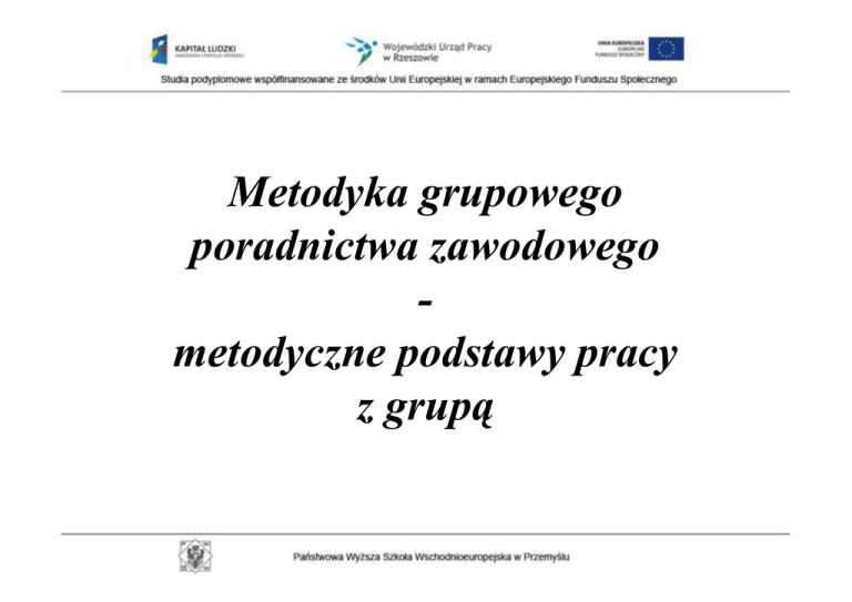 Metodyka grupowego poradnictwa zawodowego metodyczne podstawy pracy z grupą Grupa to: „ dwie lub więcej osób, przebywające w tym samym miejscu i w tym samym czasie” (KoŜusznik, 1998) Cechy grupy wspólny cel działania struktura społeczna kategoryzacja wzajemne oddziaływanie przestrzeganie norm Cele porady grupowej - stworzenie warunków do efektywnego uczenia się, - poszukiwania twórczych rozwiązań, - oceny siebie, swoich mocnych i słabych stron, - zdobycie umiejętności ułatwiających pełnienie ról społecznych i zawodowych, - zdefiniowanie i opracowanie rozwiązań własnego problemu zawodowego. Warunki pracy grupowej - stworzenie przyjemnej i akceptującej atmosfery - aktywne uczestnictwo w pracy grupy - dostrzeganie i akceptowanie intelektualnych i emocjonalnych aspektów postaw i zachowań uczestników - uzyskanie wglądu w to, jak działa grupa - duŜa ilość pomocnych, wyjaśniających i zachęcających komentarzy ze strony prowadzącego Dynamika grupy to wszystkie relacje i interakcje zachodzące pomiędzy członkami grupy. Składa się na nią wiele elementów które oddziałują na siebie nawzajem: - komunikacja między członkami grupy - normy - podejmowanie decyzji - wychodzenie naprzeciw problemom - rozwiązywanie konfliktów Inne czynniki wpływające na przebieg pracy grupy Cele grupy Spójność Napięcie Struktura grupy Projekcja Powstawanie podgrup Role w grupie Tworzenie grupy – etap przygotowań 1. zaplanowanie zadań 2. sformułowanie celów 3. określenie własnych oczekiwań 4. uzasadnienie powstania grupy Planowanie porady Określ zakres materiału Określ priorytety dotyczące treści sesji Zdecyduj, jaka metodę zastosujesz – prezentacja, dyskusje, grupy dyskusyjne, ćwiczenia aktywizujące itp. Napisz plan i konspekt Zdecyduj jakich pomocy szkoleniowych będziesz potrzebował Przygotuj wszystkie materiały szkoleniowe Zapoznaj się z otoczeniem Teoretyczny model prowadzenia grupy Myśli Uczucia Zachowania Przebieg porady grupowej Faza wstępna – inicjacyjna (doradca – lider, autorytet) Faza przejściowa – uczenie się ról grupowych (doradca – arbiter) Faza konstruktywnej współpracy (doradca – organizator) Faza zakończenia pracy grupy – ocena osiągnięć (doradca – oceniający) Role w grupie Rola to zespół oczekiwanych zachowań, opisanych na: - poziomie oczekiwań co do zachowań, które dana osoba uznała za właściwe dla danej roli, - poziomie oczekiwań społecznych związanych z rolą Role zadaniowe - ukierunkowane na wykonywanie zadań Przedstawiający poglądy i informacje (opiniodawca) Szukający informacji i poglądów Podejmujący inicjatywę (inicjator) Dyrygent (krytyk) Rozwijający idee Role społeczne - ukierunkowane na atmosferę i klimat w grupie Inspirator Pomagający i pochwalający Szukający zgody i harmonii Obserwator zajść/procesu Zawór bezpieczeństwa Dostosowujący się Otwierający drzwi Zachęcający Role indywidualne - przeszkadzające Niezgodny, prowokujący Przesadzający Dominujący Odwodzący od celu Napastnik UjeŜdŜacz ( bat koński) Trzymający się z dala Pajac Barani łeb Kreowanie roli lidera w grupie Umiejętność aktywnego słuchania Umiejętność zespalania grupy Umiejętności rozwijające proces grupowy, prowokujące podejmowanie problemów i ich wyjaśnianie Metody wykorzystywane w poradzie grupowej grupy dyskusyjne / dyskusje grupy zadaniowe (syndykaty) mini wykład metody projekcyjne – case study metody plastyczne odgrywanie roli/scenki/dramy studium przypadku burza mózgów Zachowania obniŜające efektywność pracy grupy Trudny uczestnik Trudne zachowanie