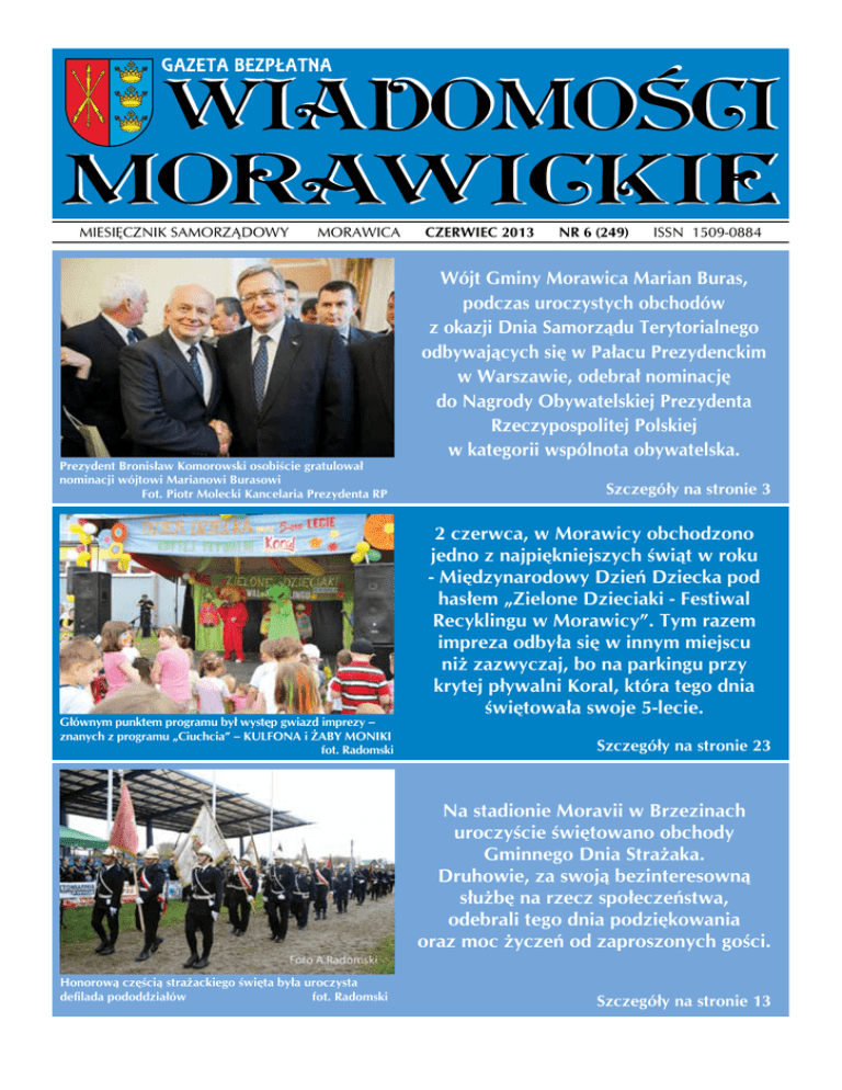 MIESIĘCZNIK SAMORZĄDOWY MORAWICA Prezydent Bronisław Komorowski osobiście gratulował nominacji wójtowi Marianowi Burasowi Fot. Piotr Molecki Kancelaria Prezydenta RP Głównym punktem programu był występ gwiazd imprezy – znanych z programu „Ciuchcia” – KULFONA i ŻABY MONIKI fot. Radomski czerwiec 2013 NR 6 (249) ISSN 1509-0884 Wójt Gminy Morawica Marian Buras, podczas uroczystych obchodów z okazji Dnia Samorządu Terytorialnego odbywających się w Pałacu Prezydenckim w Warszawie, odebrał nominację do Nagrody Obywatelskiej Prezydenta Rzeczypospolitej Polskiej w kategorii wspólnota obywatelska. Szczegóły na stronie 3 2 czerwca, w Morawicy obchodzono jedno z najpiękniejszych świąt w roku - Międzynarodowy Dzień Dziecka pod hasłem „Zielone Dzieciaki - Festiwal Recyklingu w Morawicy”. Tym razem impreza odbyła się w innym miejscu niż zazwyczaj, bo na parkingu przy krytej pływalni Koral, która tego dnia świętowała swoje 5-lecie. Szczegóły na stronie 23 Na stadionie Moravii w Brzezinach uroczyście świętowano obchody Gminnego Dnia Strażaka. Druhowie, za swoją bezinteresowną służbę na rzecz społeczeństwa, odebrali tego dnia podziękowania oraz moc życzeń od zaproszonych gości. Honorową częścią strażackiego święta była uroczysta defilada pododdziałów fot. Radomski Szczegóły na stronie 13 Czerwiec 2013 nr 6/2013 (249) WIADOMOŚCI MORAWICKIE W tym miesiącu w numerze: Zgłaszanie awarii oświetlenia ulicznego ............................... 2 Wójt Marian Buras odebrał wyjątkową nominację w Pałacu Prezydenckim ........................................................... 3 Statuetka „Super Gminy Roku” trafiła do Morawicy ........... 4 Bądź eko – bądź trendy ............................................................ 5 240 tysięcy dofinansowania dla Gminnej Biblioteki Publicznej w Morawicy .......................................... 7 Sukces młodych artystów z Gminy Morawica - „Małe Wolanecki”, „Brzezina” z Brzezin i Anna Woś z Brzezin na podium ........................................... 8 WAKACJE W „KORALU” Z okazji imienin biesiadowały Zosie ................................. 9 III Gminny Konkurs Recytatorski w Zespole Szkół w Obicach ................................................................................... 9 II miejsce dla Magdaleny Chołuj na Międzynarodowym Festiwalu „Majowa Nutka” ............ 10 W krytej pływalni „KORAL” w Morawicy w dniach od 29 czerwca do 1 września 2013r. czas wodnej uciechy o 30 gratisowych minut wydłużamy Delegacja z ośmiu państw w szkole w Morawicy ............... 11 a dodatkowo... za dwa bilety według cennika rozliczamy Straż Gminna dla Szkoły .......................................................... 16 a za trzeci tylko 1 zł pobieramy. Zapraszamy !!! LETNIA PROMOCJA W HALI „BILCZA” W okresie od 1 czerwca do 31 sierpnia 2013r. wynajmując halę po godzinie 16.30 otrzymasz 50% rabatu. W okresie od 1 lipca do 31 sierpnia 2013r. wynajmując halę do godziny 16.30 grasz 2 godziny w cenie 1 godziny. Zapraszamy !!! Gminne Obchody Dnia Strażaka ............................................... 13 Kolejne sukcesy na skalę kraju dla PIRAMIDY .................... 14 V Wojewódzki Konkurs „Jan Paweł II - Patron Najgodniejszy” ..................................... 15 Wyjątkowa nominacja dla Morawicy ..................................... 17 Wieczornica na 150. rocznicę Powstania Styczniowego ..... 18 Świętokrzyski Turniej Innowacji i Kreatywności dla gimnazjalistów .................................................................... 19 Powiatowe Zawody w piłce nożnej dziewcząt szkół gimnazjalnych w Zespole Szkół w Obicach ............... 19 Wyniki drużyn Moravii ............................................................. 20 Liga mocno przyspieszyła ....................................................... 21 Zielone Dzieciaki - festiwal recyklingu w Morawicy .......................................... 23 Zgłoszenie awarii wodociągów i kanalizacji Zakład Gospodarki Komunalnej tel. 311-47-95 tel. 311-46-91 lub 93 w. 236 dzwonić można w godz. 7.30 - 15.30 Oczyszczalnia Ścieków w Brzezinach tel. 311-49-28 czynna całą dobę Zgłaszanie awarii oświetlenia ulicznego Urząd Gminy w Morawicy informuje, że została podpisana umowa na „Konserwacje oświetlenia ulicznego na terenie gminy Morawica” z Zakładem Gospodarki Komunalnej w Morawicy. W związku z tym, ulegają zmianie zasady zgłaszania awarii oświetlenia ulicznego. Awarie należy zgłaszać telefonicznie. Zgłoszenia awarii oświetlenia ulicznego przyjmowane będą przez Zakład Gospodarki Komunalnej w Morawicy pod nr 41 311 47 95 od 7:30 do 15:30, oraz całodobowo pod nr tel. 41 311 49 28. Ośrodek Tradycji Garncarstwa w Chałupkach zaprasza Od wtorku do niedzieli w godz. 10-16. Ekspozycja stała: wystawa wyrobów garncarskich garncarzy z Chałupek i zaprzyjaźnionych miejscowości, miejsce pracy garncarza. Bilety: 4 zł - osoba dorosła i 2 zł - uczniowie i studenci. Rezerwacji wycieczek można dokonać telefonicznie 041-311-87-02 (u przewodnika ośrodka). Wiadomości Morawickie Miesięcznik Samorządowy. Wydawca: Urząd Gminy w Morawicy. ISSN 1509-0884 Adres redakcji: ul. Kielecka 38, 26-026 Morawica, tel./fax: 311 46 90, e-mail:gmina@morawica,pl; www.morawica.pl Redaktor naczelny: Agnieszka Olech - Mońska. Stali współpracownicy: Paweł Marcjan, Teresa Badowska, Jacek Kubicki, Krzysztof Kubicki, Małgorzata Bielawska, Monika Malicka, Marianna Parlicka-Słowik, Marcin Dziewięcki, Edyta Włodarska, Andrzej Radomski, Bartosz Kruk, Przemysław Strójwąs. Skład i druk: STUDIO Jeden s.c., tel. 24 268 24 41 Czerwiec 2013 nr 6/2013 (249) WIADOMOŚCI MORAWICKIE Wójt Marian Buras odebrał wyjątkową nominację w Pałacu Prezydenckim 28 maja, wójt Gminy Morawica Marian Buras, podczas uroczystych obchodów z okazji Dnia Samorządu Terytorialnego odbywających si