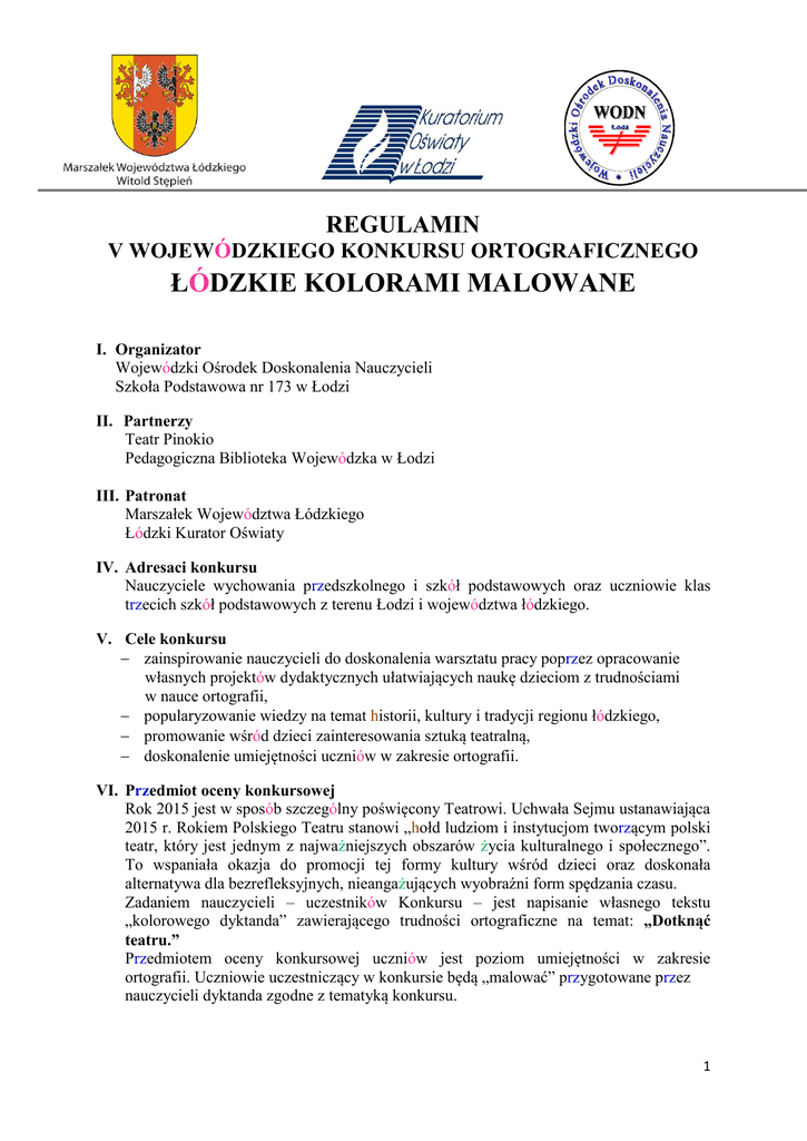 REGULAMIN V WOJEWÓDZKIEGO KONKURSU ORTOGRAFICZNEGO ŁÓDZKIE KOLORAMI MALOWANE I. Organizator Wojewódzki Ośrodek Doskonalenia Nauczycieli Szkoła Podstawowa nr 173 w Łodzi II. Partnerzy Teatr Pinokio Pedagogiczna Biblioteka Wojewódzka w Łodzi III. Patronat Marszałek Województwa Łódzkiego Łódzki Kurator Oświaty IV. Adresaci konkursu Nauczyciele wychowania przedszkolnego i szkół podstawowych oraz uczniowie klas trzecich szkół podstawowych z terenu Łodzi i województwa łódzkiego. V. Cele konkursu zainspirowanie nauczycieli do doskonalenia warsztatu pracy poprzez opracowanie własnych projektów dydaktycznych ułatwiających naukę dzieciom z trudnościami w nauce ortografii, popularyzowanie wiedzy na temat historii, kultury i tradycji regionu łódzkiego, promowanie wśród dzieci zainteresowania sztuką teatralną, doskonalenie umiejętności uczniów w zakresie ortografii. VI. Przedmiot oceny konkursowej Rok 2015 jest w sposób szczególny poświęcony Teatrowi. Uchwała Sejmu ustanawiająca 2015 r. Rokiem Polskiego Teatru stanowi „hołd ludziom i instytucjom tworzącym polski teatr, który jest jednym z najważniejszych obszarów życia kulturalnego i społecznego”. To wspaniała okazja do promocji tej formy kultury wśród dzieci oraz doskonała alternatywa dla bezrefleksyjnych, nieangażujących wyobraźni form spędzania czasu. Zadaniem nauczycieli – uczestników Konkursu – jest napisanie własnego tekstu „kolorowego dyktanda” zawierającego trudności ortograficzne na temat: „Dotknąć teatru.” Przedmiotem oceny konkursowej uczniów jest poziom umiejętności w zakresie ortografii. Uczniowie uczestniczący w konkursie będą „malować” przygotowane przez nauczycieli dyktanda zgodne z tematyką konkursu. 1 VII.Przebieg konkursu Konkurs realizowany jest w dwóch kategoriach: 1. Dla nauczycieli 2. Dla uczniów Kategoria 1. Nauczyciele Opis zadania Zadaniem nauczycieli jest napisanie własnego tekstu „kolorowego” dyktanda zawierającego trudności ortograficzne. Uczestnik może zgłosić jeden tekst, nie przekraczający 2 stron formatu A4 (czcionka 14 Times New Roman, interlinia 1,5 pkt.) W tekście dyktanda powinny występować wszystkie trudności ortograficzne, które należy napisać boldem. Każda praca powinna być oznaczona metryczką zawierającą następujące informacje: imię i nazwisko nauczyciela, adres korespondencyjny, adres mailowy oraz telefon kontaktowy. Prace konkursowe powinny być: autorskie, poprawne merytorycznie, uprzednio nigdzie niepublikowane, nie mogą być przedrukiem ani opracowaniem cudzego utworu. Ocena prac konkursowych przesłanych przez nauczycieli zostanie przeprowadzona przez Komisję Konkursową powołaną przez Dyrektora Wojewódzkiego Ośrodka Doskonalenia Nauczycieli w Łodzi. Komisja będzie oceniać walory prac pisemnych oraz ich zgodność z tematyką konkursu. Zwycięskie dyktando będzie „malowane” przez uczniów - uczestników etapu II - wojewódzkiego (finału). Uwaga! Organizatorzy zastrzegają sobie prawo do edycji tekstów. Zgłoszenie pracy do konkursu oznacza, że uczestnik zapoznał się z regulaminem konkursu i wyraża zgodę na jego warunki. Termin nadsyłania prac (tekstów dyktand) przez nauczycieli – do 14 listopada 2015 r. wyłącznie drogą elektroniczną na adres: [email protected] Nadesłane przez nauczycieli prace będą oceniane w siedzibie WODN Łódź. Kategoria 2. Uczniowie Przebieg konkursu Etap I – szkolny Eliminacje konkursowe na I etapie przeprowadzi Szkolna Komisja Konkursowa powołana przez Dyrektora Szkoły, która, po dokonaniu oceny prac wytypuje 2 uczniów z klas trzecich do udziału w wojewódzkim etapie konkursu. 2 Etap II – wojewódzki Eliminacje konkursowe na II etapie zostaną przeprowadzone przez Komisję Konkursową, w skład której wejdą konsultanci i doradcy metodyczni powołani przez Dyrektora WODN w Łodzi. Uczniowie – uczestnicy rozgrywek finałowych, którzy napiszą tekst dyktanda bezbłędnie, otrzymają Dyplom z tytułem Mistrza Kolorowej Ortografii. Ponadto wśród Mistrzów Kolorowej Ortografii zostanie wyłoniony zwycięzca. Uwaga! W przypadku bezbłędnego „namalowania” dyktanda przez 2 lub więcej uczestników, w celu wyłonienia zwycięzcy, przewiduje się dogrywkę. Jeśli żaden z uczestników nie napisze dyktanda bezbłędnie, tytuł Mistrza Kolorowej Ortografii otrzyma osoba, która popełni najmniej błędów. Terminarz konkursu dla uczniów I etap – zgodnie z terminarzem ustalonym przez szkołę; zgłoszenie dwóch uczniów z klas III do rozgrywek finałowych – od 30 września 2015 r. do 23 listopada 2015 r. II etap (finał) – 10 grudnia 2015 r. Sposób zgłaszanie uczniów do II etapu konkursu (finału): Kartę zgłoszenia uczestnictwa uczniów w konkursie (w załączeniu) należy przesłać drogą elektroniczną na adres [email protected] oraz faksem (42 636 61 46). Z powodu ograniczonej liczby miejsc obowiązuje zasada przyjmowania zgłoszeń według kolejności. Szkoła może zgłosić do finału 2 uczniów. Miejsce przeprowadzenia eliminacji konkursowych Etap I szkolny – odbywa się w macierzystych placówkach uczestników konkursu. Etap II wojewódzki (finał) – przeprowadzony będzie w siedzibie Wojewódzkiego Ośrodka Doskonalenia Nauczycieli w Łodzi. O dokładnej godzinie rozpoczęcia eliminacji finałowych szkoły zostaną poinformowane po zakwalifikowaniu uczniów do udziału w konkursie. VIII. Kontakt Informacji dotyczących konkursu udziela Kierownik projektu: Bogusława Rajska, nauczyciel – konsultant WODN Łódź, tel. 42 636 99 08 IX. Sposób i termin ogłoszenia wyników Wyniki Konkursu dla nauczycieli na tekst dyktanda oraz Konkursu dla uczniów będą podane do wiadomości uczestników 11 grudnia 2015 r. oraz zostaną zamieszczone na stronie internetowej www.wodn.lodz.pl (w zakładce KONKURSY). 3 X. Nagrody Uczniowie – laureaci konkursu otrzymają Dyplomy Mistrza Kolorowej Ortografii. Nauc