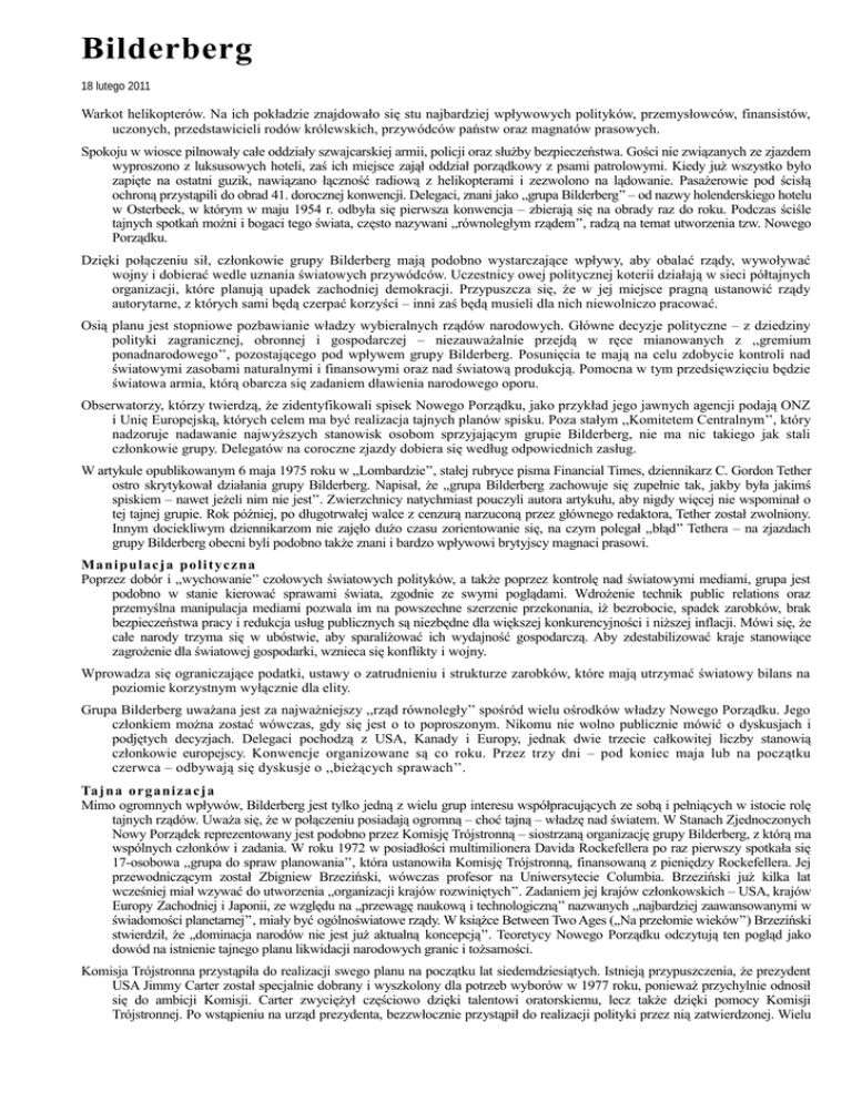 Bilderberg 18 lutego 2011 Warkot helikopterów. Na ich pokładzie znajdowało się stu najbardziej wpływowych polityków, przemysłowców, finansistów, uczonych, przedstawicieli rodów królewskich, przywódców państw oraz magnatów prasowych. Spokoju w wiosce pilnowały całe oddziały szwajcarskiej armii, policji oraz służby bezpieczeństwa. Gości nie związanych ze zjazdem wyproszono z luksusowych hoteli, zaś ich miejsce zajął oddział porządkowy z psami patrolowymi. Kiedy już wszystko było zapięte na ostatni guzik, nawiązano łączność radiową z helikopterami i zezwolono na lądowanie. Pasażerowie pod ścisłą ochroną przystąpili do obrad 41. dorocznej konwencji. Delegaci, znani jako ,,grupa Bilderberg’’ – od nazwy holenderskiego hotelu w Osterbeek, w którym w maju 1954 r. odbyła się pierwsza konwencja – zbierają się na obrady raz do roku. Podczas ściśle tajnych spotkań możni i bogaci tego świata, często nazywani ,,równoległym rządem’’, radzą na temat utworzenia tzw. Nowego Porządku. Dzięki połączeniu sił, członkowie grupy Bilderberg mają podobno wystarczające wpływy, aby obalać rządy, wywoływać wojny i dobierać wedle uznania światowych przywódców. Uczestnicy owej politycznej koterii działają w sieci półtajnych organizacji, które planują upadek zachodniej demokracji. Przypuszcza się, że w jej miejsce pragną ustanowić rządy autorytarne, z których sami będą czerpać korzyści – inni zaś będą musieli dla nich niewolniczo pracować. Osią planu jest stopniowe pozbawianie władzy wybieralnych rządów narodowych. Główne decyzje polityczne – z dziedziny polityki zagranicznej, obronnej i gospodarczej – niezauważalnie przejdą w ręce mianowanych z ,,gremium ponadnarodowego’’, pozostającego pod wpływem grupy Bilderberg. Posunięcia te mają na celu zdobycie kontroli nad światowymi zasobami naturalnymi i finansowymi oraz nad światową produkcją. Pomocna w tym przedsięwzięciu będzie światowa armia, którą obarcza się zadaniem dławienia narodowego oporu. Obserwatorzy, którzy twierdzą, że zidentyfikowali spisek Nowego Porządku, jako przykład jego jawnych agencji podają ONZ i Unię Europejską, których celem ma być realizacja tajnych planów spisku. Poza stałym ,,Komitetem Centralnym’’, który nadzoruje nadawanie najwyższych stanowisk osobom sprzyjającym grupie Bilderberg, nie ma nic takiego jak stali członkowie grupy. Delegatów na coroczne zjazdy dobiera się według odpowiednich zasług. W artykule opublikowanym 6 maja 1975 roku w ,,Lombardzie’’, stałej rubryce pisma Financial Times, dziennikarz C. Gordon Tether ostro skrytykował działania grupy Bilderberg. Napisał, że ,,grupa Bilderberg zachowuje się zupełnie tak, jakby była jakimś spiskiem – nawet jeżeli nim nie jest’’. Zwierzchnicy natychmiast pouczyli autora artykułu, aby nigdy więcej nie wspominał o tej tajnej grupie. Rok później, po długotrwałej walce z cenzurą narzuconą przez głównego redaktora, Tether został zwolniony. Innym dociekliwym dziennikarzom nie zajęło dużo czasu zorientowanie się, na czym polegał ,,błąd’’ Tethera – na zjazdach grupy Bilderberg obecni byli podobno także znani i bardzo wpływowi brytyjscy magnaci prasowi. Man i pu l acja pol i tyczn a Poprzez dobór i ,,wychowanie’’ czołowych światowych polityków, a także poprzez kontrolę nad światowymi mediami, grupa jest podobno w stanie kierować sprawami świata, zgodnie ze swymi poglądami. Wdrożenie technik public relations oraz przemyślna manipulacja mediami pozwala im na powszechne szerzenie przekonania, iż bezrobocie, spadek zarobków, brak bezpieczeństwa pracy i redukcja usług publicznych są niezbędne dla większej konkurencyjności i niższej inflacji. Mówi się, że całe narody trzyma się w ubóstwie, aby sparaliżować ich wydajność gospodarczą. Aby zdestabilizować kraje stanowiące zagrożenie dla światowej gospodarki, wznieca się konflikty i wojny. Wprowadza się ograniczające podatki, ustawy o zatrudnieniu i strukturze zarobków, które mają utrzymać światowy bilans na poziomie korzystnym wyłącznie dla elity. Grupa Bilderberg uważana jest za najważniejszy ,,rząd równoległy’’ spośród wielu ośrodków władzy Nowego Porządku. Jego członkiem można zostać wówczas, gdy się jest o to poproszonym. Nikomu nie wolno publicznie mówić o dyskusjach i podjętych decyzjach. Delegaci pochodzą z USA, Kanady i Europy, jednak dwie trzecie całkowitej liczby stanowią członkowie europejscy. Konwencje organizowane są co roku. Przez trzy dni – pod koniec maja lub na początku czerwca – odbywają się dyskusje o ,,bieżących sprawach’’. Tajn a organi za cja Mimo ogromnych wpływów, Bilderberg jest tylko jedną z wielu grup interesu współpracujących ze sobą i pełniących w istocie rolę tajnych rządów. Uważa się, że w połączeniu posiadają ogromną – choć tajną – władzę nad światem. W Stanach Zjednoczonych Nowy Porządek reprezentowany jest podobno przez Komisję Trójstronną – siostrzaną organizację grupy Bilderberg, z którą ma wspólnych członków i zadania. W roku 1972 w posiadłości multimilionera Davida Rockefellera po raz pierwszy spotkała się 17-osobowa ,,grupa do spraw planowania’’, która ustanowiła Komisję Trójstronną, finansowaną z pieniędzy Rockefellera. Jej przewodniczącym został Zbigniew Brzeziński, wówczas profesor na Uniwersytecie Columbia. Brzeziński już kilka lat wcześniej miał wzywać do utworzenia ,,organizacji krajów rozwiniętych’’. Zadaniem jej krajów członkowskich – USA, krajów Europy Zachodniej i Japonii, ze względu na ,,przewagę naukową i technologiczną’’ nazwanych ,,najbardziej zaawansowanymi w świadomości planetarnej’’, miały być ogólnoświatowe rządy. W książce Between Two Ages (,,Na przełomie wieków’’) Brzeziński stwierdził, że ,,dominacj