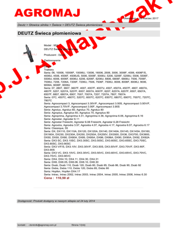 i k a z r h Utworzono : 03 marzec 2017 c j a Deutz > Głowica silnika > Świece > DEUTZ Świeca płomieniowa DEUTZ Świeca płomieniowa M . Model : 953 DEUTZ Świeca płomieniowa Producent : Deutz A . Zastosowanie J . p Deutz Traktory Seria: 06, 10006, 10006F, 10006U, 13006, 16006, 2506, 3006, 3006F, 4006, 4006F/S, 4006U, 4506, 4506F, 4506US, 5006, 5006F, 5006U, 5206, 5206F, 5206U, 5506, 5506F, 5506U, 6006, 6006F, 6006U, 6206, 6206F, 6206U, 6806, 6806F, 6806U, 7006, 7006F, 7006U, 7206, 7206A, 7206F, 7206U, 7506, 7506F, 7506U, 8006, 8006F, 8006U, 9006, 9006A, 9006F, 9006U Seria: 07, 2807, 3607, 3607F, 4007, 4007F, 4007U, 4507, 4507A, 4507F, 4807, 4807A, 4807F, 5207, 5207A, 5207F, 6007, 6007A, 6007F, 6207, 6207A, 6207F, 6507, 6507A, 6507F, 6807, 6807A, 6907, 7007, 7007A, 7207, 7207A, 7807, 7807A Seria: 07C, 4507C, 4807C, 5207C, 6007C, 6207C, 6507C, 6807C, 6907C, 7007C, 7207C, 7807C Seria: Agrocompact 3, Agrocompact 3.30V/F, Agrocompact 3.50S, Agrocompact 3.50V/F, Agrocompact 3.70V/F, Agrocompact 3.90F, Agrocompact 3.90S Seria: Agrolux, Agrolux 60, Agrolux 70, Agrolux 80 Seria: Agroplus, Agroplus 60, Agroplus 70, Agroplus 80 Seria: Agroprima, Agroprima 4.31, Agroprima 4.36, Agroprima 6.06, Agroprima 6.16 Seria: Agrostar, Agrostar 6.11 Seria: Agrostar Freisicht, Agrostar 6.08 Freisicht, Agrostar 6.28 Freisicht Seria: Agroxtra, Agroxtra 3.57, Agroxtra 4.07, Agroxtra 4.17, Agroxtra 6.07, Agroxtra 6.17 Seria: Classique, 55 Seria: DX, DX110, DX110A, DX120, DX120A, DX140, DX140A, DX145, DX145A, DX160, DX160A, DX230, DX230A, DX250, DX250A, DX250V, DX3500, DX36, DX3700, DX3900, DX50, DX55, DX80, DX80A, DX85, DX85A, DX86, DX86A, DX90, DX90A, DX92, DX92A Seria: DX3 SC, DX3.10SC, DX3.30SC, DX3.50SC, DX3.60SC, DX3.65SC, DX3.70SC, DX3.80SC, DX3.90SC Seria: DX3 V/F/S, DX3.10V, DX3.30V/F, DX3.50S, DX3.50V/F, DX3.70V/F, DX3.90F, DX3.90S Seria: DX3 VC, DX3.10VC, DX3.30VC, DX3.50VC, DX3.60VC, DX3.65VC, DX3.70VC, DX3.75VC, DX3.90VC Seria: DX4, DX4.10, DX4.11, DX4.30, DX4.31 Seria: DX6, DX6.05, DX6.06, DX6.10, DX6.30 Seria: Dxab, Dxab 110, Dxab 120, Dxab 80, Dxab 85, Dxab 86, Dxab 90, Dxab 92 Seria: Dxbis, Dxbis 110, Dxbis 120, Dxbis 85, Dxbis 90 Seria: Hopfen, Hopfen DX4.17 Seria: Intrac, Intrac 2002, Intrac 2003, Intrac 2004, Intrac 2005, Intrac 2006, Intrac 6.30 Cena : 110,50 zł Dostępność: Produkt dostępny w naszym sklepie od 24 luty 2014 kontakt : - [email protected] Strona 1/{nb}