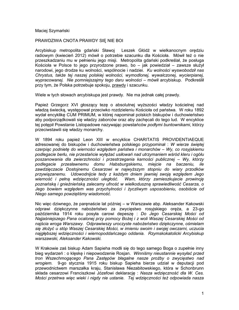 Maciej Szymański PRAWDZIWA CNOTA PRAWDY SIĘ NIE BOI Arcybiskup metropolita gdański Sławoj Leszek Głódź w wielkanocnym orędziu radiowym (kwiecień 2012) mówił o potrzebie szacunku dla Kościoła. Mówił też o nie przeszkadzaniu mu w pełnieniu jego misji. Metropolita gdański podkreślał, że posługa Kościoła w Polsce to jego przyrodzone prawo, bo – jak powiedział – zawsze służył narodowi, jego drodze ku wolności, wspólnocie i nadziei. Ku wolności wyswobodził nas Chrystus, także tej naszej polskiej wolności, wymodlonej, wywalczonej, wycierpianej, wypracowanej. Nie pomniejszajmy tego daru wolności – mówił arcybiskup. Podkreślił przy tym, że Polska potrzebuje spokoju, prawdy i szacunku. Wiele w tych słowach arcybiskupa jest prawdy. Nie ma jednak całej prawdy. Papież Grzegorz XVI głoszący tezę o absolutnej wyższości władzy kościelnej nad władzą świecką, występował przeciwko rozdzieleniu Kościoła od państwa. W roku 1892 wydał encyklikę CUM PRIMUM, w której napominał polskich biskupów i duchowieństwo aby podporządkowali się władzy zaborców oraz aby zachęcali do tego lud. W encyklice tej potępił Powstanie Listopadowe nazywając powstańców podłymi buntownikami, którzy przeciwstawili się władzy monarchy. W 1894 roku papież Leon XIII w encyklice CHARITATIS PROVIDENTIAEQUE adresowanej do biskupów i duchowieństwa polskiego przypominał : W wierze świętej czerpiąc podnietę do wierności względem państwa i monarchów – Wy, co rosyjskiemu podlegacie berłu, nie przestańcie wytężać usiłowań nad utrzymaniem wśród kleru i ogółu poszanowania dla zwierzchności i przestrzegania karności publicznej – Wy, którzy podlegacie przesławnemu domu Habsburgskiemu, miejcie na baczeniu, ile zawdzięczacie Dostojnemu Cesarzowi w najwyższym stopniu do wiary przodków przywiązanemu. Udowodnijcie tedy z każdym dniem jawniej swoją względem Jego wierność i pełną wdzięczności uległość. Wam, którzy zamieszkujecie prowincję poznańską i gnieźnieńską zalecamy ufność w wielkoduszną sprawiedliwość Cesarza, o Jego bowiem względem was przychylności i życzliwym usposobieniu, osobiście od Niego samego powzięliśmy wiadomość. Nic więc dziwnego, że paręnaście lat później – w Warszawie abp. Aleksander Kakowski odprawi dziękczynne nabożeństwo za zwycięstwo rosyjskiego oręża, a 23-go października 1914 roku posyła carowi depeszę : Do Jego Cesarskiej Mości od Najjaśniejszego Pana ocalonej przy pomocy Bożej i z woli Waszej Cesarskiej Mości od najścia wroga Warszawy. Odprawiwszy uroczyste nabożeństwo dziękczynne, ośmielam się złożyć u stóp Waszej Cesarskiej Mości, w imieniu swoim i swojej owczarni, uczucia najgłębszej wdzięczności i wiernopoddańczego oddania. Rzymskokatolicki Arcybiskup warszawski, Aleksander Kakowski. W Krakowie zaś biskup Adam Sapieha modli się do tego samego Boga o zupełnie inny bieg wydarzeń : o klęskę i niepowodzenie Rosjan. Winniśmy nieustannie wysyłać przed tron Wszechmogącego Pana Zastępów błagalne nasze proźby o zwycięstwo nad wrogiem. 9-go stycznia 1915 roku biskup Sapieha bierze udział w deputacji pod przewodnictwem marszałka kraju, Stanisława Niezabitowskiego, która w Schonbrunn składa cesarzowi Franciszkowi Józefowi deklarację : Nasza wdzięczność dla W. Ces. Mości przetrwa więc wieki i nigdy nie ustanie. Tej wdzięczności też odpowiada nasza 1 nieograniczona wierność. Racz więc, W. Ces. Mość, zezwolić, abśmy w czasie ciężkich walk i trudów powtórzyli często składane ślubowanie i połączyli z nim nasze najgorętsze życzenia szczęśliwego zakończenia tych walk przez ostateczne zwycięstwo naszej o sprawiedliwą sprawę walczącej armii. Z temi życzeniami i nadziejami wznawiamy u stóp nasze starodawne ślubowanie : przy Tobie Najjaśniejszy Panie, stoimy i zawsze stać chcemy. W Poznaniu, w sierpniu 1914 roku, abp. Edward Likowski ogłasza list pasterski nawołujący do wierności wobec cesarza Wilhelma i apeluje w nim do wiernych : Mężowie, bracia ! Synowie Wasi wezwani pod broń walczyć będą przeciwko sprzymierzonym wrogom cesarstwa niemieckiego i austriackiego, a w szczególności przeciwko Rosji. W tej walce niejeden z nich złoży swe życie w ofierze. Niech Wam to jednak będzie pocieszeniem, że jakkolwiek Wam przyjdzie ponieść większe czy mniejsze ofiary, złożycie je za sprawiedliwą sprawę. Wiem, że nigdy nie wymarło w nim (społeczeństwie) poczucie obowiązku posłuszeństwa wobec władzy z woli Bożej nad nim postanowionej. Tak to prawie sto lat temu (że powtórzę słowa abp. Sławoja Leszka Głodzia), Kościół w Polsce zawsze służył narodowi, jego drodze ku wolności, wspólnocie i nadziei. 6-go grudnia 2006-go roku papież Benedykt XVI podniósł do godności arcybiskupiej i mianował metropolitą warszawskim biskupa Stanisława Wojciecha Wielgusa. 5-go stycznia 2007-go roku przyjął on kanonicznie w obecności kolegium konsultorów powierzoną mu archidiecezję warszawska. W dniu zaplanowanego ingresu do warszawskiej archikatedry, 7-go stycznia 2007-go roku abp. Wielgus zrezygnował z funkcji metropolity warszawskiego. Rezygnacja Wielgusa wynikała z faktu pojawienia się w mediach zarzutów o współpracę ze służbami PRL. Zarzuty te zostały potwierdzone przez Kościelną Komisję Historyczną, która stwierdziła, że z dokumentów wynika, iż Wielgus podjął współpracę z SB pomimo tego, że taka działalność była przez Kosciół zakazana. W parę lat później przewodniczący Konferencji Episkopatu Polski abp. Józef Michalik stwierdził : że nie ma żadnych podstaw do oskarżania członków Episkopatu Polski o zawinioną i dobrowolną współpracę ze Służbami Bezpieczeństwa PRL. W związku z tym biskupi sprawę lustracji uważają za zamkniętą Wszystko to przypomniałem sobie słuchając radiowego orędzia abp. Głódzia, wygłoszonego w odległ