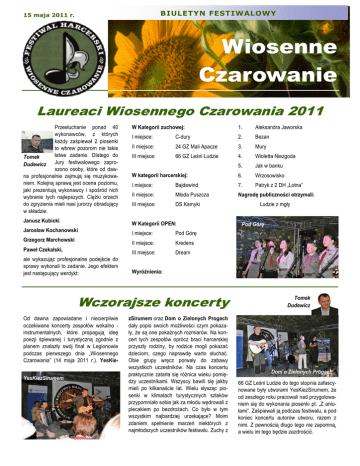 BIULETYN FESTIWALOWY 15 maja 2011 r. Wiosenne Czarowanie Laureaci Wiosennego Czarowania 2011 Przesłuchanie ponad 40 wykonawców, z których kaŜdy zaśpiewał 2 piosenki to wbrew pozorom nie takie łatwe zadanie. Dlatego do Tomek Dudewicz Jury festiwalowego zaproszono osoby, które od dawna profesjonalnie zajmują się muzykowaniem. Kolejną sprawą jest ocena poziomu, jaki prezentują wykonawcy i spośród nich wybranie tych najlepszych. CięŜki orzech do zgryzienia mieli nasi jurorzy obradujący w składzie: Janusz Kubicki W Kategorii zuchowej: 1. Aleksandra Jaworska I miejsce: C-dury 2. Bezan II miejsce: 24 GZ Mali Apacze 3. Mury III miejsce: 66 GZ Leśni Ludzie 4. Wioletta Niezgoda 5. Jak w banku W kategorii harcerskiej: 6. Wrzosowisko I miejsce: Bajdewind 7. Patryk z 2 DH „Lotna” II miejsce: Młoda Puszcza Nagrodę publiczności otrzymali: III miejsce: DS Kamyki W Kategorii OPEN: Jarosław Kochanowski Grzegorz Marchowski Paweł Czekalski, ale wykazując profesjonalne podejście do sprawy wykonali to zadanie. Jego efektem jest następujący werdykt: I miejsce: Pod Górę II miejsce: Kredens III miejsce: Dream YesKiezSirumem Pod Górę WyróŜnienia: Wczorajsze koncerty Od dawna zapowiadane i niecierpliwie oczekiwane koncerty zespołów wokalno instrumentalnych, które propagują ideę poezji śpiewanej i turystyczną zgodnie z planem znalazły swój finał w Legionowie podczas pierwszego dnia „Wiosennego Czarowania” (14 maja 2011 r.). YesKie- Ludzie z mgły zSirumem oraz Dom o Zielonych Progach dały popis swoich moŜliwości czym pokazały, Ŝe są one pokaźnych rozmiarów. Na koncert tych zespołów oprócz braci harcerskiej przyszły rodziny, by rodzice mogli pokazać dzieciom, czego naprawdę warto słuchać. Obie grupy wręcz porwały do zabawy wszystkich uczestników. Na czas koncertu praktycznie zatarła się róŜnica wieku pomiędzy uczestnikami. Wszyscy bawili się jakby mieli po kilkanaście lat. Wielu słysząc piosenki w klimatach turystycznych szlaków przypomniało sobie jak za młodu wędrowali z plecakiem po bezdroŜach. Co było w tym wszystkim najbardziej urzekające? Moim zdaniem spełnienie marzeń niektórych z najmłodszych uczestników festiwalu. Zuchy z Tomek Dudewicz Dom o Zielonych Progach 66 GZ Leśni Ludzie do tego stopnia zafascynowane były utworami YesKiezSirumem, Ŝe od zeszłego roku pracowali nad przygotowaniem się do wykonania piosenki pt. „Z aniołami”. Zaśpiewali ją podczas festiwalu, a pod koniec koncertu autorów utworu, razem z nimi. Z pewnością długo tego nie zapomną, a wielu im tego będzie zazdrościć. Str. 2 Wiosenne Czarowanie Tomek Dudewicz Ten harcerski zespół wokalnoinstrumentalny grał w zeszłym roku koncert w Legionowie podczas I edycji „Wiosennego Czarowania” czym zdobył serca lokalnej publiczności. JuŜ od 1974 roku popularyzuje walory turystyczne kraju ze szczególnym akcentem na uwielbienie Bieszczad, w tradycyjnej i współczesnej piosence harcerskiej. W twórczości grupy zauwaŜalny jest trend śpiewu wielogłosowego. Zespół Wołosatki wylansował wiele przebojów śpiewanych przez całą harcerską i turystyczną Polskę. Nagrał i wydał kilkanaście płyt oraz dziesięć edycji "Śpiewniczka Bieszczadniczka". Wołosatki na Ogólnopolskich Przeglądach Piosenki Turystycznej YAPA i Bakcynalia, od 1988 roku występuje tam jedynie w charakterze zaproszonego gościa. Liczne występy w telewizji, radiu, koncerty w kraju i za granicą przyniosły mu wiele nagród i wyróŜnień. Po zdobyciu wszystkich moŜliwych nagród Obietnica na świeczkowisku „Obiecuje być dobrym zuchem, zawsze przestrzegać prawa zucha” - w taki sposób wczorajszego wieczoru najmłodsi członkowie hufca z 66 GZ „Leśni ludzie” złoŜyły obietnicę zuchową. Ale zacznijmy od początku. Po koncertach zespołów „YesKiezSirumem” oraz „Dom o Zielonych Progach” rozpoczęło się mundurowe świeczkowisko wszystkich uczestnik ó w „Wiosennego Czarowania”. Druh Robert Próchnicki rozpoczął to spotkanie piosenką „śegnaj Ameryko”, a zaraz po niej zaśpiewaliśmy „Przechyły” o r a z „Bieszczadzki trakt” co wprowadziło wszystkich w nastrój harcerskich przygód. Na pytanie prowadzącego czy chcą złoŜyć obietnicę - maluchy zgodnie odpowiedziały „Owszem, owszem tak, tak, tak, nie inaczej, no bo jak”. Po złoŜonej obietnicy odbyło się wręczenie znaczków zucha. Jak na jeden dzień dla zuszków 15 maja 2011 r. Własny styl Wołosatek to ich znak rozpoznawczy. Koncerty prezentowane w kraju i za granicą oparte są na szerokim, nie tylko turystycznym repertuarze. W innych krajach nie ma odpowiednika takiego trendu muzycznego, jaki prezentuje zespół. Nic więc dziwnego, Ŝe Wołosatki nie mieszczą się w klasycznych formach zagranicznych festiwali, wśród chórów, orkiestr, wieloosobowych zespołów wokalnych. Ale właśnie niepowtarzalność grupy w zestawieniu z innymi jest powodem licznych zaproszeń na krajowe i zagraniczne sceny. Z nich moŜesz brać przykład Monika Gawryś było wystarczająco duŜo wraŜeń, wiec wraz z opiekunami opuścili sale. Dalszą część świeczkowiska poprowadzili bracia Kuneccy wraz z Piotrem Olek – dawni instruktorzy Hufca Legionowo. W repertuarze znalazły się najprzeróŜniejsze piosenki od „Ballady Rajdowej”, przez „Hiszpańskie dziewczyny” Tomek Dudewicz Szefostwo Sztabu festiwalu piosenki harcerskiej „Wiosenne Czarowanie” postanowiło wyróŜnić za szczególny wkład pracy i zaangaŜowania w wykonywanie powierzonych obowiązków podczas organizacji festiwalu następujące osoby: Dziewczyny z 23 WDH-ek Watra wykonujące prace w kuchni: Aneta, Angelika, Ola, Olga, Zuzia Dziewczyny z informacji: Magda i Ada Opiekunowie zespołów: Adam, Kuba, dwóch Michałów, Paweł, Rafał, Tomek i Robert. na „ Bez słów” kończąc. Pomimo znakomitej zabawy, do końca wytrwali tylko nieliczni. Mam nadzieję Ŝe zachowali wystarczającą ilo