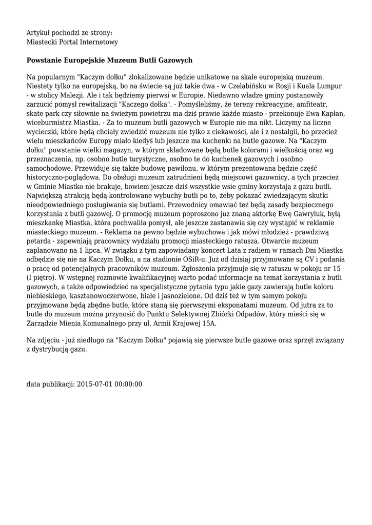 Artykuł pochodzi ze strony: Miastecki Portal Internetowy Powstanie Europejskie Muzeum Butli Gazowych Na popularnym "Kaczym dołku" zlokalizowane będzie unikatowe na skale europejską muzeum. Niestety tylko na europejską, bo na świecie są już takie dwa - w Czelabińsku w Rosji i Kuala Lumpur - w stolicy Malezji. Ale i tak będziemy pierwsi w Europie. Niedawno władze gminy postanowiły zarzucić pomysł rewitalizacji "Kaczego dołka". - Pomyśleliśmy, że tereny rekreacyjne, amfiteatr, skate park czy siłownie na świeżym powietrzu ma dziś prawie każde miasto - przekonuje Ewa Kapłan, wiceburmistrz Miastka. - Za to muzeum butli gazowych w Europie nie ma nikt. Liczymy na liczne wycieczki, które będą chciały zwiedzić muzeum nie tylko z ciekawości, ale i z nostalgii, bo przecież wielu mieszkańców Europy miało kiedyś lub jeszcze ma kuchenki na butle gazowe. Na "Kaczym dołku" powstanie wielki magazyn, w którym składowane będą butle kolorami i wielkością oraz wg przeznaczenia, np. osobno butle turystyczne, osobno te do kuchenek gazowych i osobno samochodowe. Przewiduje się także budowę pawilonu, w którym prezentowana będzie część historyczno-poglądowa. Do obsługi muzeum zatrudnieni będą miejscowi gazownicy, a tych przecież w Gminie Miastko nie brakuje, bowiem jeszcze dziś wszystkie wsie gminy korzystają z gazu butli. Największą atrakcją będą kontrolowane wybuchy butli po to, żeby pokazać zwiedzającym skutki nieodpowiedniego posługiwania się butlami. Przewodnicy omawiać też będą zasady bezpiecznego korzystania z butli gazowej. O promocję muzeum poproszono juz znaną aktorkę Ewę Gawryluk, byłą mieszkankę Miastka, która pochwaliła pomysł, ale jeszcze zastanawia się czy wystąpić w reklamie miasteckiego muzeum. - Reklama na pewno będzie wybuchowa i jak mówi młodzież - prawdziwą petarda - zapewniają pracownicy wydziału promocji miasteckiego ratusza. Otwarcie muzeum zaplanowano na 1 lipca. W związku z tym zapowiadany koncert Lata z radiem w ramach Dni Miastka odbędzie się nie na Kaczym Dołku, a na stadionie OSiR-u. Już od dzisiaj przyjmowane są CV i podania o pracę od potencjalnych pracowników muzeum. Zgłoszenia przyjmuje się w ratuszu w pokoju nr 15 (I piętro). W wstępnej rozmowie kwalifikacyjnej warto podać informacje na temat korzystania z butli gazowych, a także odpowiedzieć na specjalistyczne pytania typu jakie gazy zawierają butle koloru niebieskiego, kasztanowoczerwone, białe i jasnozielone. Od dziś też w tym samym pokoju przyjmowane będą zbędne butle, które staną się pierwszymi eksponatami muzeum. Od jutra za to butle do muzeum można przynosić do Punktu Selektywnej Zbiórki Odpadów, który mieści się w Zarządzie Mienia Komunalnego przy ul. Armii Krajowej 15A. Na zdjęciu - już niedługo na "Kaczym Dołku" pojawią się pierwsze butle gazowe oraz sprzęt związany z dystrybucją gazu. data publikacji: 2015-07-01 00:00:00