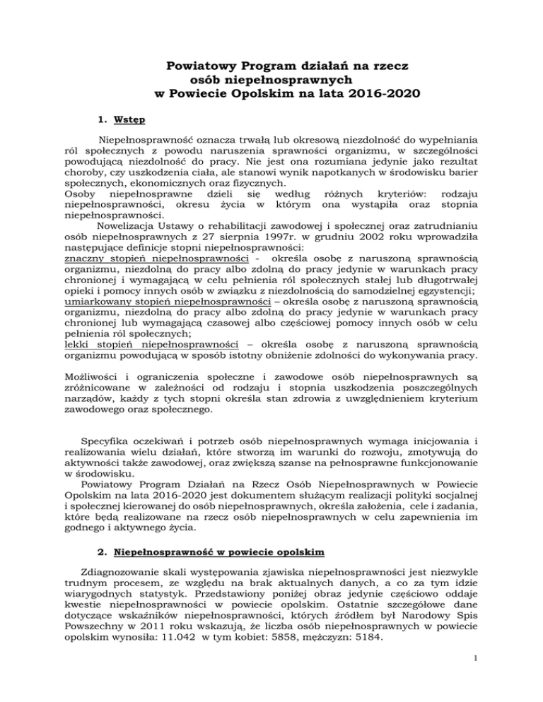 Powiatowy Program działań na rzecz osób niepełnosprawnych w Powiecie Opolskim na lata 2016-2020 1. Wstęp Niepełnosprawność oznacza trwałą lub okresową niezdolność do wypełniania ról społecznych z powodu naruszenia sprawności organizmu, w szczególności powodującą niezdolność do pracy. Nie jest ona rozumiana jedynie jako rezultat choroby, czy uszkodzenia ciała, ale stanowi wynik napotkanych w środowisku barier społecznych, ekonomicznych oraz fizycznych. Osoby niepełnosprawne dzieli się według różnych kryteriów: rodzaju niepełnosprawności, okresu życia w którym ona wystąpiła oraz stopnia niepełnosprawności. Nowelizacja Ustawy o rehabilitacji zawodowej i społecznej oraz zatrudnianiu osób niepełnosprawnych z 27 sierpnia 1997r. w grudniu 2002 roku wprowadziła następujące definicje stopni niepełnosprawności: znaczny stopień niepełnosprawności - określa osobę z naruszoną sprawnością organizmu, niezdolną do pracy albo zdolną do pracy jedynie w warunkach pracy chronionej i wymagającą w celu pełnienia ról społecznych stałej lub długotrwałej opieki i pomocy innych osób w związku z niezdolnością do samodzielnej egzystencji; umiarkowany stopień niepełnosprawności – określa osobę z naruszoną sprawnością organizmu, niezdolną do pracy albo zdolną do pracy jedynie w warunkach pracy chronionej lub wymagającą czasowej albo częściowej pomocy innych osób w celu pełnienia ról społecznych; lekki stopień niepełnosprawności – określa osobę z naruszoną sprawnością organizmu powodującą w sposób istotny obniżenie zdolności do wykonywania pracy. Możliwości i ograniczenia społeczne i zawodowe osób niepełnosprawnych są zróżnicowane w zależności od rodzaju i stopnia uszkodzenia poszczególnych narządów, każdy z tych stopni określa stan zdrowia z uwzględnieniem kryterium zawodowego oraz społecznego. Specyfika oczekiwań i potrzeb osób niepełnosprawnych wymaga inicjowania i realizowania wielu działań, które stworzą im warunki do rozwoju, zmotywują do aktywności także zawodowej, oraz zwiększą szanse na pełnosprawne funkcjonowanie w środowisku. Powiatowy Program Działań na Rzecz Osób Niepełnosprawnych w Powiecie Opolskim na lata 2016-2020 jest dokumentem służącym realizacji polityki socjalnej i społecznej kierowanej do osób niepełnosprawnych, określa założenia, cele i zadania, które będą realizowane na rzecz osób niepełnosprawnych w celu zapewnienia im godnego i aktywnego życia. 2. Niepełnosprawność w powiecie opolskim Zdiagnozowanie skali występowania zjawiska niepełnosprawności jest niezwykle trudnym procesem, ze względu na brak aktualnych danych, a co za tym idzie wiarygodnych statystyk. Przedstawiony poniżej obraz jedynie częściowo oddaje kwestie niepełnosprawności w powiecie opolskim. Ostatnie szczegółowe dane dotyczące wskaźników niepełnosprawności, których źródłem był Narodowy Spis Powszechny w 2011 roku wskazują, że liczba osób niepełnosprawnych w powiecie opolskim wynosiła: 11.042 w tym kobiet: 5858, mężczyzn: 5184. 1 Zdecydowana większość niepełnosprawnych w powiecie opolskim to osoby w wieku produkcyjnym stanowią one 43% ogółu liczby osób niepełnosprawnych. Najmniejszą grupę stanowią dzieci do 15 roku życia tj. 3%. Znaczny odsetek osób niepełnosprawnych z terenu powiatu opolskiego korzystało z pomocy społecznej. Ośrodki Pomocy Społecznej funkcjonujące w każdej gminie w 2014 roku oraz przez III kwartały 2015 roku udzielały osobom niepełnosprawnym pomocy w formie: zasiłku stałego, zasiłku celowego, zasiłku celowego specjalnego, zasiłku okresowego, usług opiekuńczych i pielęgnacyjnych, dodatku do zasiłku rodzinnego z tytułu kształcenia i rehabilitacji dziecka niepełnosprawnego, zasiłku pielęgnacyjnego, składek zdrowotnych, posiłków w stołówce środowiskowej, świadczenia rodzinnego, dodatku mieszkaniowego, zapewnienie miejsca w ZOL, DPS, oraz hospicjach. Z informacji przesłanych przez OPS z terenu powiatu opolskiego wynika, iż w 2014 roku z w/w pomocy skorzystało 1.193 osób niepełnosprawnych, natomiast przez okres III kwartałów roku bieżącego, z pomocy skorzystało 1.196 osób niepełnosprawnych. Na 1) 2) 3) terenie powiatu opolskiego funkcjonują: dwa szpitale (Ozimek, Kup); trzy Zakłady Opiekuńczo-Lecznicze (Ozimek, Niemodlin, Stare Siołkowice); 38 ośrodków podstawowej opieki zdrowotnej. Poradnie Psychologiczno-Pedagogiczne funkcjonujące na terenie powiatu opolskiego w 2014 roku wydały: 1) 2) 69 orzeczeń o potrzebie indywidualnego nauczania; 98 orzeczeń o potrzebie kształcenia specjalnego. natomiast przez III kwartały 2015 roku wydały: 1) 68 orzeczeń o potrzebie indywidualnego nauczania; 2) 174 orzeczeń o potrzebie kształcenia specjalnego. Na terenie powiatu opolskiego w szkołach ogólnodostępnych zapewnia się kształcenie uczniom niepełnosprawnym, zgodnie z indywidualnymi potrzebami rozwojowymi i edukacyjnymi oraz predyspozycjami, wymagającymi specjalnej organizacji nauki w formie: nauczania indywidualnego, zajęć rewalidacyjno wyrównawczych oraz zajęć specjalistycznych. Obecnie 24 uczniów korzysta z ww. form nauczania w tym 6 dzieci z nauczania indywidualnego. W powiecie opolskim funkcjonują szkoły niepubliczne wchodzące w skład Zespołu Szkół Specjalnych w Kup prowadzone przez Stowarzyszenie na rzecz Autyzmu „Uczmy się żyć razem”. W skład zespołu wchodzą następujące typy szkół: Szkoła Podstawowa Specjalna, Gimnazjum Specjalne, Szkoła Przysposabiająca do Pracy. Łącznie uczy się w nich 50 uczniów. Powiatowy Zespół ds. Orzekania o Niepełnosprawności w Opolu: w 2014 roku wydał 1042 orzeczeń o niepełnosprawności w tym: 839 dla osób dorosłych oraz, 149 orzeczeń dla osób, które nie ukończyły 16 roku życia. 2 STOPIEŃ NIEPEŁNOSPRAWNOŚCI znaczny 236 umiarkowany 409 lekki 248 RAZEM 893 WIEK 16-25 26-40 41-60 87 111 285 6