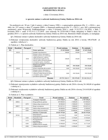 ZARZĄDZENIE NR 45/16 BURMISTRZA DUKLI z dnia 12 kwietnia 2016 r. w sprawie zmian w uchwale budżetowej Gminy Dukla na 2016 rok Na podstawie art. 30 ust. 2 pkt 4 ustawy z dnia 8 marca 1990 r. o samorządzie gminnym (Dz. U. z 2016 r.. poz. 446), art. 257 ustawy z dnia 27 sierpnia 2009 r. o finansach publicznych (Dz. U. z 2013 r., poz. 885 z późniejszymi zmianami), pism Wojewody Podkarpackiego: z dnia 5 kwietnia 2016 r. znak: F-VI.3111.1.26.2016, z dnia 7 kwietnia 2016 r. znak: F-VI.3111.1.27.2016 oraz uchwały Nr XVII/108/15 Rady Miejskiej w Dukli z dnia 18 grudnia 2015 r. w sprawie uchwały budżetowej Gminy Dukla na 2016 rok, Burmistrz Dukli zarządza, co następuje: § 1. Dokonać zmian w planie dochodów uchwały budżetowej Gminy Dukla na 2016 rok: 1) Dokonać zwiększenia dochodów uchwały budżetowej gminy Dukla na rok 2016 o kwotę 190.470,00 zł. zgodnie z tabelą nr 1, 2) Tabela nr 1. Plan dochodów. Dział Rozdział Paragraf 852 Treść Przed zmianą Pomoc społeczna 85215 2010 854 85415 2030 Po zmianie 150,00 15 345 354,00 180,00 150,00 330,00 180,00 150,00 330,00 0,00 190 320,00 190 320,00 0,00 190 320,00 190 320,00 0,00 190 320,00 190 320,00 49 976 346,21 190 470,00 50 166 816,21 Dodatki mieszkaniowe Dotacje celowe otrzymane z budżetu państwa na realizację zadań bieżących z zakresu administracji rządowej oraz innych zadań zleconych gminie (związkom gmin, związkom powiatowo-gminnym) ustawami Edukacyjna opieka wychowawcza Pomoc materialna dla uczniów Dotacje celowe otrzymane z budżetu państwa na realizację własnych zadań bieżących gmin (związków gmin, związków powiatowo-gminnych) Razem: Zmiana 15 345 204,00 § 2. Dokonać zmian w planie wydatków uchwały budżetowej Gminy Dukla na 2016 rok: 1) Dokonać zmniejszenia wydatków uchwały budżetowej gminy Dukla na rok 2016 o kwotę 24.140,00 zł zgodnie z tabelą nr 2, 2) Dokonać zwiększenia wydatków uchwały budżetowej gminy Dukla na rok 2016 o kwotę 214.610,00 zł zgodnie z tabelą nr 2, 3) Tabela nr 2. Plan wydatków. Dział Rozdział Paragraf 600 Treść Transport i łączność 60016 Drogi publiczne gminne 4270 60017 Zakup usług remontowych Drogi wewnętrzne Przed zmianą Zmiana Po zmianie 1 757 470,35 0,00 1 757 470,35 459 000,00 - 5 000,00 454 000,00 40 000,00 - 5 000,00 35 000,00 533 827,35 5 000,00 538 827,35 4270 Zakup usług remontowych 40 000,00 - 5 000,00 35 000,00 4300 Zakup usług pozostałych 85 000,00 10 000,00 95 000,00 Oświata i wychowanie Dokształcanie i doskonalenie nauczycieli Stypendia różne Wynagrodzenia bezosobowe Zakup środków dydaktycznych i książek Zakup usług pozostałych 20 453 797,68 0,00 20 453 797,68 56 670,00 0,00 56 670,00 11 650,00 2 270,00 13 920,00 1 500,00 1 000,00 2 500,00 14 980,00 1 791,00 16 771,00 4 500,00 - 4 490,00 10,00 801 80146 3250 4170 4240 4300 Id: CC15D6E4-D997-406E-9362-7D40C0859320. Podpisany Strona 1 4410 4700 851 85154 4300 4610 852 85215 3110 4210 854 85415 3260 85446 3250 4240 4300 4430 4700 Podróże służbowe krajowe Szkolenia pracowników niebędących członkami korpusu służby cywilnej Ochrona zdrowia Przeciwdziałanie alkoholizmowi Zakup usług pozostałych Koszty postępowania sądowego i prokuratorskiego Pomoc społeczna 4 950,00 - 4 950,00 0,00 19 090,00 4 379,00 23 469,00 222 847,85 0,00 222 847,85 199 447,85 0,00 199 447,85 42 497,85 - 200,00 42 297,85 0,00 200,00 200,00 17 317 184,00 150,00 17 317 334,00 Dodatki mieszkaniowe 97 780,00 150,00 97 930,00 Świadczenia społeczne Zakup materiałów i wyposażenia Edukacyjna opieka wychowawcza Pomoc materialna dla uczniów Inne formy pomocy dla uczniów Dokształcanie i doskonalenie nauczycieli Stypendia różne Zakup środków dydaktycznych i książek Zakup usług pozostałych 97 776,40 147,00 97 923,40 3,60 3,00 6,60 695 442,10 190 320,00 885 762,10 120 000,00 190 320,00 310 320,00 120 000,00 190 320,00 310 320,00 7 500,00 0,00 7 500,00 0,00 2 500,00 2 500,00 2 500,00 - 1 500,00 1 000,00 1 000,00 - 1 000,00 0,00 2 000,00 - 2 000,00 0,00 2 000,00 2 000,00 4 000,00 53 110 763,88 190 470,00 53 301 233,88 Różne opłaty i składki Szkolenia pracowników niebędących członkami korpusu służby cywilnej Razem: § 3. Dokonać zmian w planie dochodów i wydatków na 2016 rok na realizację zadań z zakresu administracji rządowej oraz innych zadań zleconych ustawami: 1) Zwiększyć dochody o kwotę 150,00 zł zgodnie z tabelą nr 3, 2) Tabela nr 3. Plan dochodów na zadania z zakresu administracji rządowej i zlecone odrębnymi ustawami. Dział 852 Rozdział Paragraf 85215 2010 Treść Pomoc społeczna Dodatki mieszkaniowe Dotacje celowe otrzymane z budżetu państwa na realizację zadań bieżących z zakresu administracji rządowej oraz innych zadań zleconych gminie (związkom gmin, związkom powiatowogminnym) ustawami Razem: Przed zmianą 13 778 185,00 Zmiana 150,00 Po zmianie 13 778 335,00 180,00 150,00 330,00 180,00 150,00 330,00 13 892 605,00 150,00 13 892 755,00 3) Zwiększyć wydatki o kwotę 150,00 zł zgodnie z tabelą nr 4, 4) Tabela nr 4. Plan wydatków na zadania z zakresu administracji rządowej i zlecone odrębnymi ustawami. Dział 852 Rozdział Paragraf 85215 3110 4210 Treść Pomoc społeczna Przed zmianą 13 778 185,00 Zmiana 150,00 Po zmianie 13 778 335,00 Dodatki mieszkaniowe 180,00 150,00 330,00 Świadczenia społeczne Zakup materiałów i wyposażenia Razem: 176,40 147,00 323,40 3,60 3,00 6,60 13 892 605,00 150,00 13 892 755,00 § 4. Wykonanie zarządzenia powierza Skarbnikowi Gminy Dukla. Id: CC15D6E4-D997-406E-9362-7D40C0859320. Podpisany Strona 2 § 5. Zarządzenie wchodzi w życie z dniem podjęcia. Burmistrz Andrzej Bytnar Id: CC15D6E4-D997-406E-9362-7D40C0859320. Podpisany Strona 3