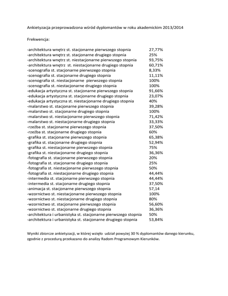 Ankietyzacja przeprowadzona wśród dyplomantów w roku akademickim 2013/2014 Frekwencja: -architektura wnętrz st. stacjonarne pierwszego stopnia -architektura wnętrz st. stacjonarne drugiego stopnia -architektura wnętrz st. niestacjonarne pierwszego stopnia -architektura wnętrz st. niestacjonarne drugiego stopnia -scenografia st. stacjonarne pierwszego stopnia -scenografia st. stacjonarne drugiego stopnia -scenografia st. niestacjonarne pierwszego stopnia -scenografia st. niestacjonarne drugiego stopnia -edukacja artystyczna st. stacjonarne pierwszego stopnia -edukacja artystyczna st. stacjonarne drugiego stopnia -edukacja artystyczna st. niestacjonarne drugiego stopnia -malarstwo st. stacjonarne pierwszego stopnia -malarstwo st. stacjonarne drugiego stopnia -malarstwo st. niestacjonarne pierwszego stopnia -malarstwo st. niestacjonarne drugiego stopnia -rzeźba st. stacjonarne pierwszego stopnia -rzeźba st. stacjonarne drugiego stopnia -grafika st. stacjonarne pierwszego stopnia -grafika st. stacjonarne drugiego stopnia -grafika st. niestacjonarne pierwszego stopnia -grafika st. niestacjonarne drugiego stopnia -fotografia st. stacjonarne pierwszego stopnia -fotografia st. stacjonarne drugiego stopnia -fotografia st. niestacjonarne pierwszego stopnia -fotografia st. niestacjonarne drugiego stopnia -intermedia st. stacjonarne pierwszego stopnia -intermedia st. stacjonarne drugiego stopnia -animacja st. stacjonarne pierwszego stopnia -wzornictwo st. niestacjonarne pierwszego stopnia -wzornictwo st. niestacjonarne drugiego stopnia -wzornictwo st. stacjonarne pierwszego stopnia -wzornictwo st. stacjonarne drugiego stopnia -architektura i urbanistyka st. stacjonarne pierwszego stopnia -architektura i urbanistyka st. stacjonarne drugiego stopnia 27,77% 25% 93,75% 60,71% 8,33% 11,11% 100% 100% 91,66% 23,07% 40% 39,28% 100% 71,42% 33,33% 37,50% 60% 65,38% 52,94% 75% 36,36% 20% 25% 50% 44,44% 44,44% 37,50% 57,14 100% 80% 56,60% 36,36% 50% 53,84% Wyniki zbiorcze ankietyzacji, w której wzięło udział powyżej 30 % dyplomantów danego kierunku, zgodnie z procedurą przekazano do analizy Radom Programowym Kierunków.