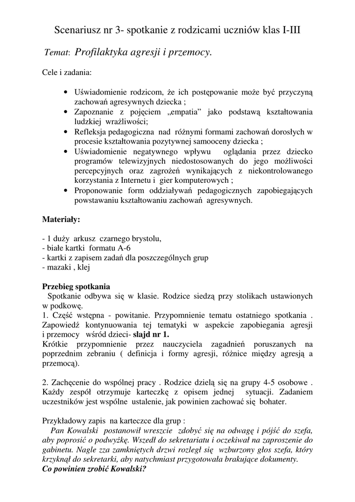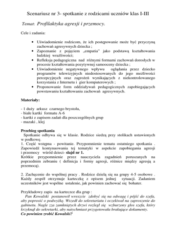 Scenariusz nr 3- spotkanie z rodzicami uczniów klas I-III Temat: Profilaktyka agresji i przemocy. Cele i zadania: • U wiadomienie rodzicom, e ich post powanie mo e by przyczyn zachowa agresywnych dziecka ; • Zapoznanie z poj ciem „empatia” jako podstaw kształtowania ludzkiej wra liwo ci; • Refleksja pedagogiczna nad ró nymi formami zachowa dorosłych w procesie kształtowania pozytywnej samooceny dziecka ; • U wiadomienie negatywnego wpływu ogl dania przez dziecko programów telewizyjnych niedostosowanych do jego mo liwo ci percepcyjnych oraz zagro e wynikaj cych z niekontrolowanego korzystania z Internetu i gier komputerowych ; • Proponowanie form oddziaływa pedagogicznych zapobiegaj cych powstawaniu kształtowaniu zachowa agresywnych. Materiały: - 1 du y arkusz czarnego brystolu, - białe kartki formatu A-6 - kartki z zapisem zada dla poszczególnych grup - mazaki , klej Przebieg spotkania Spotkanie odbywa si w klasie. Rodzice siedz przy stolikach ustawionych w podkow . 1. Cz wst pna - powitanie. Przypomnienie tematu ostatniego spotkania . Zapowied kontynuowania tej tematyki w aspekcie zapobiegania agresji i przemocy w ród dzieci- slajd nr 1. Krótkie przypomnienie przez nauczyciela zagadnie poruszanych na poprzednim zebraniu ( definicja i formy agresji, ró nice mi dzy agresj a przemoc ). 2. Zach cenie do wspólnej pracy . Rodzice dziel si na grupy 4-5 osobowe . Ka dy zespół otrzymuje karteczk z opisem jednej sytuacji. Zadaniem uczestników jest wspólne ustalenie, jak powinien zachowa si bohater. Przykładowy zapis na karteczce dla grup : Pan Kowalski postanowił wreszcie zdoby si na odwag i pój do szefa, aby poprosi o podwy k . Wszedł do sekretariatu i oczekiwał na zaproszenie do gabinetu. Nagle zza zamkni tych drzwi rozległ si wzburzony głos szefa, który krzykn ł do sekretarki, aby natychmiast przygotowała brakuj ce dokumenty. Co powinien zrobi Kowalski? Przykład 2 Kiedy mama weszła rano do pokoju Ma ka, a złapała si za głow . Na biurku i tapczanie wszystko porozrzucane. A tak go wczoraj prosiła, eby wreszcie posprz tał swój pokój! Postanowiła, e ju czas sko czy z tłumaczeniem i pro bami. Jak tylko wróci ze szkoły, natychmiast wymierzy mu kar . Po kilku godzinach Maciek zadzwonił do drzwi. Miał pochylone plecy i bardzo cichym głosem odezwał si na powitanie. Kiedy mama podeszła bli ej , zauwa yła, e na twarzy Ma ka s jeszcze oznaki płaczu. Co powinna zrobi mama? Relacjonowanie przez przedstawicieli grup wspólnych ustale po zapoznaniu si z tekstem. Rodzice na pewno zach c bohaterów opowiada do odroczenia czasu wykonania swoich zada w zwi zku z zaistniał sytuacj . Nauczyciel zadaje pytanie : Na jakiej podstawie mo emy wnioskowa , e kto prze ywa niemiłe uczucia ? 3. Zapoznanie rodziców z poj ciem „empatia”- slajd nr 2 i 3 U wiadomienie, e jest to niezwykle wa na umiej tno kształtowania wra liwo ci. w procesie 4. Brak empatii to cz sta cecha osób stosuj cych przemoc- slajd nr 4. 5. W zapobieganiu agresji i przemocy ogromn rol odgrywa budowanie u dziecka poczucia własnej warto ci. Niektóre działania, a nawet zdania wypowiadane do dzieci obni aj ich samoocen . Zaproponowanie utworzenia „czarnej listy” zachowa rodzicielskich. Nauczyciel wiesza na tablicy du y czarny brystol. Na stołach le małe karteczki białego koloru do wpisywania zachowa , zada wypowiadanych do dzieci, które nie sprzyjaj budowaniu ich samooceny. Nast pnie przyklejamy karteczki na czarnym brystolu. Nauczyciel nadzoruje ich przyklejanie, aby sformułowania o podobnym znaczeniu znalazły si jeden na drugim. Podsumowanie pracy przez nauczyciela. Komentarz zawieraj cy najwa niejsze przyczyny obni enia samooceny : - brak poczucia aprobaty, szacunku i akceptacji ze strony rodziców; - karcenie, o mieszanie, poni anie: - niekorzystne dla dziecka porównywanie go z innymi: - brak wsparcia (wzmocnie za powodzenia i w razie niepowodze ) ; - nieliczenie si z jego pogl dami i opiniami; - przypinanie etykietki niszcz cej indywidualno ; - straszenie b d stosowanie przemocy. 6.Zadaniem rodziców i nauczycieli jest wzmacnia u dzieci poczucie własnej warto ci – slajd nr 5. Wyprostowana postawa ciała i głowa lekko uniesiona do góry sprawia, e człowiek wygl da na pewnego swojej warto ci. Dziecko, które chodzi z zaokr glonymi plecami i opuszczon głow „wysyła” niewerbalny komunikat do sprawcy przemocy: „Nie obroni si ”. 7. Znaj c mechanizmy powstawania agresji na ladowczej, nale y zabezpiecza dzieci przed wpływem modeli agresywnego zachowania si - slajd nr 6 . 8. Jak unika zachowa agresywnych , które umo liwiaj osi ganie ró nych form celów? - slajd nr 7. 9. Zachowania agresywne pojawiaj si cz sto, kiedy dziecko wchodzi w konflikt z innymi dzie mi. Doro li powinni nauczy dzieci sposobów rozwi zywania problemów. W młodszym wieku szkolnym bardzo szybko nauczymy tej umiej tno ci , gdy b dziemy proponowa dzieciom odegranie scenek – zachowa b d cych ródłem konfliktu. Po analizie sytuacji, rozmowie z dzieckiem, ta sama scenka mo e by odgrywana ponownie ju bezkonfliktowo. Slajd nr 8. 10. Podsumowanie zaj . Podzi kowanie za aktywny udział w zaj ciach. Zach cenie rodziców do pogł biania wiadomo ci na temat profilaktyki agresji i przemocy w ród dzieci oraz zgłaszanie wychowawcy wszelkich pyta , problemów czy w tpliwo ci. Bibliografia 1. Agresja w ród dzieci i młodzie y. Perspektywa psychoedukacyjna, Podr cznik akademicki, red. A. Fr czek, I. Pufal- Struzik, Wydawnictwo Pedagogiczne ZNP, Kielce 1996 2. J. Danilewska , Agresja u dzieci- szkoła porozumienia, Wydawnictwa Szkolne i Pedagogiczne, Warszawa 2002 3. M. D browska , M. Rozesłaniec, Korygowanie zachowania dzieci nadpobudliwych psychoruchowo i agresywnych w grupie socjoterpeutycznej, Wydawnictwo Adam Marszałek, Toru 2004 4. A. Doli ski, G. Gajewska, E. Rewi ska, Teoretyczno - metodyczne aspekty korekcji zachowa . Programy profilaktyczne, Wydawnictwo PEKW „GAJA”, Zielona Góra 2004 5. 