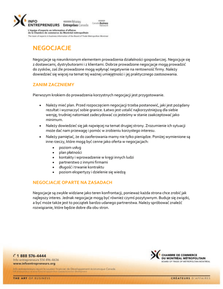NEGOCJACJE Negocjacje są nieuniknionym elementem prowadzenia działalności gospodarczej. Negocjuje się z dostawcami, dystrybutorami i z klientami. Dobrze prowadzone negocjacje mogą prowadzić do zysków, zaś źle prowadzone mogą wpłynąć negatywnie na rentowność firmy. Należy dowiedzieć się więcej na temat tej ważnej umiejętności i jej praktycznego zastosowania. ZANIM ZACZNIEMY Pierwszym krokiem do prowadzenia korzystnych negocjacji jest przygotowanie. • • • Należy mieć plan. Przed rozpoczęciem negocjacji trzeba postanowić, jaki jest pożądany rezultat i wyznaczyć sobie granice. Łatwo jest ustalić najkorzystniejszą dla siebie wersję, trudniej natomiast zadecydować co jesteśmy w stanie zaakceptować jako minimum. Należy dowiedzieć się jak najwięcej na temat drugiej strony. Zrozumienie ich sytuacji może dać nam przewagę i pomóc w zrobieniu korzystego interesu. Należy pamiętać, że do zaoferowania mamy nie tylko pieniądze. Poniżej wymienione są inne rzeczy, które mogą być cenne jako oferta w negocjacjach: • poziom usług • plan płatności • kontakty i wprowadzenie w kręgi innych ludzi • partnerstwo z innymi firmami • długość i trwanie kontraktu • poziom ekspertyzy i dzielenie się wiedzą NEGOCJACJE OPARTE NA ZASADACH Negocjacje są zwykle widziane jako teren konfrontacji, ponieważ każda strona chce zrobić jak najlepszy interes. Jednak negocjacje mogą być również czymś pozytywnym. Buduje się związki, a być może także jest to początek bardzo udanego partnerstwa. Należy spróbować znaleźć rozwiązanie, które będzie dobre dla obu stron. Jedną z metod targów bez konfrontacji są negocjacje oparte na zasadach. Oto cztery kroki do takich negocjacji : 1. Należy oddzielić ludzi od problemu. Dyskusja powinna być o tym, o co chodzi w negocjacjach, a nie o tym, kto je prowadzi. 2. Należy skoncentrować się na interesach, nie na pozycjach. Obie strony czegoś chcą. Należy skoncentrować się na celach, a nie na tym, w jaki sposób te cele osiągnąć. 3. Dobrze jest znajdować opcje, dające zysk obu stronom. Nie należy podchodzić do negocjacji mając na celu uzyskanie tego, czego się chce. Celem powinno być znalezienie wyjścia, które przyniesie korzyść obu stronom. 4. Należy stosować obiektywne kryteria. Negocjacje powinny być oparte na wycenach rynkowych lub tradycyjnych zasadach, a nie na wartościach jakie sami przypisujemy. MĄDRE NEGOCJACJE Przygotowania i planowanie to nie jedyne elementy mądrych negocjacji. Ważne jest również własne zachowanie. Oto kilka, rzeczy, które warto mieć na uwadze: • Emocje. Nasze emocje mogą działać przeciwko nam. Wysłanie właściwej emocjonalnej odpowiedzi we właściwym czasie może być sygnałem naszej opinii o ofercie. Może to wpłynąć na osobę prezentującą ofertę i skłonić ją do wniesienia zmian, bez konieczności prezentacji kontroferty. Z drugiej strony, zbyt wiele emocji może działać na naszą szkodę. Jeśli pozwolimy emocjom na kierowanie naszymi negocjacjami, łatwo może się zdarzyć, że zaakceptujemy marny interes lub odrzucimy dobry. • Cierpliwość. Żadne negocjacje nie są tak ważne, aby trzeba było się z nimi śpieszyć. Pozwólmy drugiej stronie skończyć to, co mówią. Spróbujmy nie przerywać. Pozwoli to drugiej stronie na zaprezentowanie pełnej oferty, a nam da czas na pełne rozważenie propozycji. • Cisza. Zazwyczaj nie czujemy się dobrze w ciszy następującej w trakcie rozmowy. Gdy następuje cisza, chcemy coś powiedzieć aby tylko przerwać napięcie. Cisza w czasie negocjacji może jednak być dobrą rzeczą. Daje nam to okazję do myślenia i zebrania się w sobie. Używajmy ciszy na swoja korzyść. • Przerwy. Nie ma problemu z przerwaniem dyskusji na krótki czas. Przerwa może dać nam niezbędny czas na zebranie się w sobie i poświęcenie ofercie lub kontrofercie czasu, na który zasługuje. Jako minimum, przerwa może przerwać napięcie, jeśli uważamy, że popychani jesteśmy w stronę układu, który nam się nie podoba. • Przerwanie negocjacji. Nie musimy koniecznie ubić interesu. Kiepski interes jest gorszy niż brak interesu. Jeśli nie możemy znaleźć sposobu na uzyskanie minimalnego zaplanowanego uprzedniu porozumienia, należy wstać od stołu i odejść. Pożądany interes można znaleźć gdzie indziej.