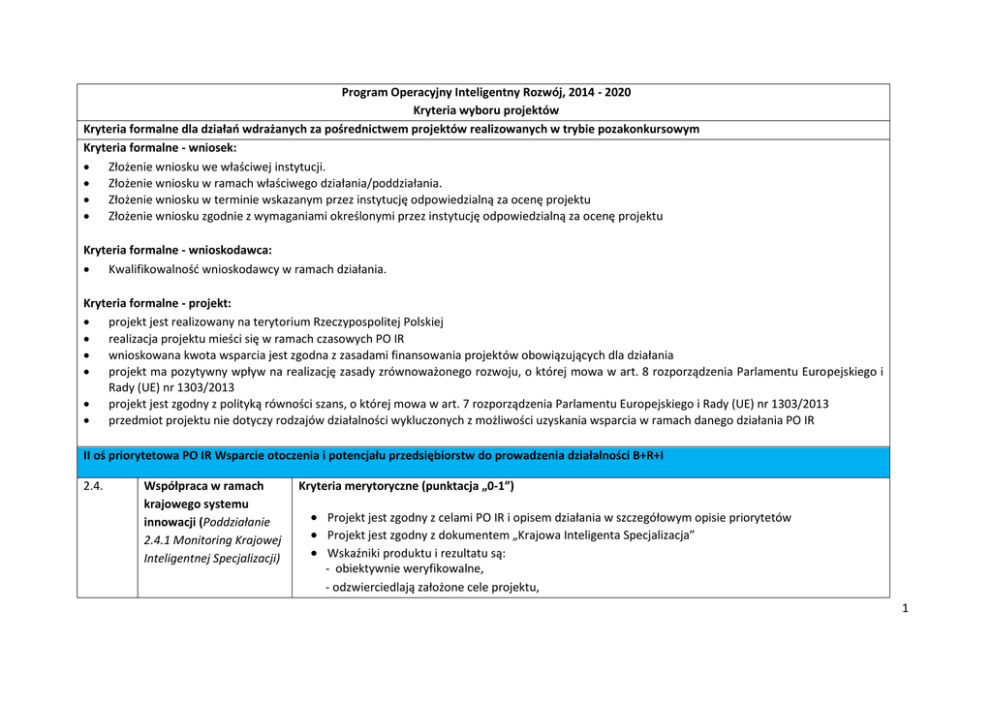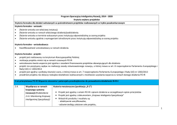 Program Operacyjny Inteligentny Rozwój, 2014 - 2020 Kryteria wyboru projektów Kryteria formalne dla działań wdrażanych za pośrednictwem projektów realizowanych w trybie pozakonkursowym Kryteria formalne - wniosek: Złożenie wniosku we właściwej instytucji. Złożenie wniosku w ramach właściwego działania/poddziałania. Złożenie wniosku w terminie wskazanym przez instytucję odpowiedzialną za ocenę projektu Złożenie wniosku zgodnie z wymaganiami określonymi przez instytucję odpowiedzialną za ocenę projektu Kryteria formalne - wnioskodawca: Kwalifikowalność wnioskodawcy w ramach działania. Kryteria formalne - projekt: projekt jest realizowany na terytorium Rzeczypospolitej Polskiej realizacja projektu mieści się w ramach czasowych PO IR wnioskowana kwota wsparcia jest zgodna z zasadami finansowania projektów obowiązujących dla działania projekt ma pozytywny wpływ na realizację zasady zrównoważonego rozwoju, o której mowa w art. 8 rozporządzenia Parlamentu Europejskiego i Rady (UE) nr 1303/2013 projekt jest zgodny z polityką równości szans, o której mowa w art. 7 rozporządzenia Parlamentu Europejskiego i Rady (UE) nr 1303/2013 przedmiot projektu nie dotyczy rodzajów działalności wykluczonych z możliwości uzyskania wsparcia w ramach danego działania PO IR II oś priorytetowa PO IR Wsparcie otoczenia i potencjału przedsiębiorstw do prowadzenia działalności B+R+I 2.4. Współpraca w ramach krajowego systemu innowacji (Poddziałanie 2.4.1 Monitoring Krajowej Inteligentnej Specjalizacji) Kryteria merytoryczne (punktacja „0-1”) Projekt jest zgodny z celami PO IR i opisem działania w szczegółowym opisie priorytetów Projekt jest zgodny z dokumentem „Krajowa Inteligenta Specjalizacja” Wskaźniki produktu i rezultatu są: - obiektywnie weryfikowalne, - odzwierciedlają założone cele projektu, 1 - adekwatne dla danego rodzaju projektu Harmonogram projektu umożliwia prawidłową i terminową realizację przedsięwzięcia Wydatki planowane do poniesienia w projekcie są kwalifikowalne i zasadne w stosunku do zakresu projektu Wnioskodawca posiada zdolność instytucjonalną, techniczną i ekonomiczną do realizacji projektu, gwarantującą stabilne zarządzanie projektem (zgodnie z przyjętymi celami) Wnioskodawca posiada wystarczające do przeprowadzenia projektu i umożliwiające jego prawidłową realizację zasoby organizacyjne i ludzkie W projekcie zaplanowano badanie efektywności podjętych w ramach niego działań oraz przewidziano elastyczność proponowanych rozwiązań Realizacja projektu kompleksowo przyczyni się do rozwiązania problemów zdefiniowanych w ramach analizy potrzeb przedstawionej we wniosku Projekt zakłada zaangażowanie innych podmiotów (np. instytucji publicznych, środowisk eksperckich, instytucji otoczenia biznesu) 2 Opis kryteriów wyboru projektów w ramach Priorytetu II WSPARCIE OTOCZENIA I POTENCJAŁU PRZEDSIĘBIORSTW DO PROWADZENIA DZIAŁALNOŚCI B+R+I Działanie 2.4 Współpraca w ramach krajowego systemu innowacji Poddziałanie 2.4.1 Monitoring Krajowej Inteligentnej Specjalizacji Kryteria oceny projektu pozakonkursowego Lp. Nazwa kryterium Opis kryterium Ocena Kryteria formalne Kryteria formalne - wniosek: 1. Złożenie wniosku we właściwej instytucji 2. Złożenie wniosku w ramach właściwego działania/poddziałania 3. Złożenie wniosku w terminie wskazanym przez instytucję odpowiedzialną za ocenę projektu 4. Złożenie wniosku zgodnie z wymaganiami określonymi przez instytucję odpowiedzialną za ocenę projektu Kryteria formalne - wnioskodawca: 1. Kwalifikowalność wnioskodawcy w ramach działania Wniosek złożono do Instytucji Zarządzającej. Wniosek złożono w ramach właściwego działania/poddziałania. Wniosek o dofinansowanie został złożony w terminie określonym przez instytucję odpowiedzialną za ocenę projektu. Tak/Nie Wniosek o dofinansowanie został złożony zgodnie ze wzorem określonym przez instytucję odpowiedzialną za ocenę projektu i jest kompletny. Tak/Nie Wnioskodawca oraz ew. partnerzy dla poddziałania 2.4.2 Monitoring Krajowej Inteligentnej Specjalizacji w II osi PO IR jest podmiotem publicznym lub państwową osobą prawną, uprawnioną do ubiegania się o dofinansowanie projektów pozakonkursowych zgodnie z art. 38 ust. 2 i 3 ustawy o zasadach realizacji programów w zakresie polityki spójności finansowanych w Tak/Nie 3 perspektywie finansowej 2014-2020, a w przypadku projektu partnerskiego – spełnione zostały wymogi utworzenia partnerstwa, o którym mowa w art. 33 ww. ustawy. Wnioskodawca oraz potencjalni partnerzy (jeśli dotyczy) nie podlegają wykluczeniu z ubiegania się o dofinansowanie na podstawie art. 207 ust. 4 ustawy z dnia 27 sierpnia 2009 r. o finansach publicznych – zgodnie z oświadczeniem zawartym we wniosku. Kryteria formalne - projekt: 1. Projekt jest realizowany na terytorium Rzeczypospolitej Polskiej 2. Realizacja projektu mieści się w ramach czasowych PO IR 3. Wnioskowana kwota wsparcia jest zgodna z zasadami finansowania projektów obowiązujących dla działania 4. Projekt ma pozytywny wpływ na realizację zasady zrównoważonego rozwoju, o której mowa w art. 8 rozporządzenia Parlamentu Europejskiego i Rady (UE) nr 1303/2013 Wskazane we wniosku miejsce realizacji projektu znajduje się na terytorium Rzeczypospolitej Tak/Nie Polskiej. Zlecenie przez wnioskodawcę realizacji usług – w szczególności prac eksperckich – zagranicznemu wykonawcy, nie powoduje negatywnej oceny kryterium. Harmonogram realizacji projektu nie wykracza poza końcową datę okresu kwalifikowalności Tak/Nie wydatków (tj. 31 grudnia 2023 r.). Wnioskodawca właściwie wyliczył wnioskowaną kwotę wsparcia, w szczególności zgodnie z Wytycznymi Ministra Infrastruktury i Rozwoju w zakresie kwalifikowalności wydatków w ramach Europejskiego Funduszu Rozwoju Regionalnego, Europejskiego Funduszu Społecznego oraz Funduszu Spójności na lat