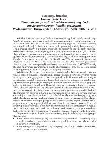 Recenzja książki: Janusz Świerkocki, Ekonomiczne przesłanki wielostronnej regulacji międzynarodowego handlu towarami, Wydawnictwo Uniwersytetu Łódzkiego, Łódź 2007, s. 231 Książka Ekonomiczne przesłanki wielostronnej regulacji międzynarodowego handlu towarami jest swego rodzaju podsumowaniem i zwieńczeniem wieloletnich badań Autora w zakresie wielostronnej regulacji międzynarodowej wymiany handlowej. J. Świerkocki należy do grona najbardziej kompetentnych i najbardziej znanych autorów polskich zajmujących się tą problematyką. Podstawowym zagadnieniem podjętym w pracy jest ukazanie i przedyskutowanie ekonomicznych uzasadnień wielostronnego międzyrządowego systemu regulacji handlu międzynarodowego, jaki wykształcił się w okresie funkcjonowania Układu Ogólnego w sprawie Taryf i Handlu (GATT), a następnie Światowej Organizacji Handlu (WTO). Jak napisano we wstępie: „Celem pracy jest wyjaśnienie, czy prowadzenie polityki handlowej w ramach systemu GATT/WTO da się obronić na gruncie argumentacji czysto ekonomicznej, tzn. czy uczestniczenie w tej organizacji pozwala zwiększyć krajowy dobrobyt”. Książka jest obszernym i wyczerpującym studium bardzo ważnego ekonomicznie, ale także politycznie, zagadnienia, którego znaczenie systematycznie rośnie w związku z postępującymi procesami globalizacji. Opracowanie rozpoczyna syntetyczny rozdział omawiający dynamikę i zmiany strukturalne w handlu międzynarodowym, pokazujący przyczyny wzrostu obrotów oraz zarysowujący perspektywy integracji handlowej. Rozdział drugi przedstawia w lapidarny sposób istotę, funkcje, główne zasady oraz perspektywy funkcjonowania systemu regulacji wielostronnej. Rozdziały trzeci i czwarty poświęcono prezentacji i dyskusji ekonomicznych korzyści z handlu zagranicznego oraz ekonomicznych korzyści z protekcjonizmu. Nawiązaniem do tych dwóch rozdziałów jest kolejny, piąty rozdział, skupiający uwagę na ekonomicznych korzyściach z wzajemnej liberalizacji handlu. W rozdziale szóstym podjęto z kolei kwestię oceny regionalizmu handlowego z perspektywy regulacji wielostronnej handlu międzynarodowego. Rozdział siódmy pokazuje związki pomiędzy regułami handlu wielostronnego a regulacjami wewnętrznymi w dziedzinie ochrony środowiska i praw pracowników. Podkreśla się w nim ograniczony charakter regulacji handlu wielostronnego. Do podstawowych silnych stron omawianej książki zaliczyłbym następujące okoliczności: • Autor doskonale orientuje się we współczesnej literaturze światowej dotyczącej omawianych zagadnień, a także artykułuje własne poglądy w podejmowanych kwestiach, • Autor umiejętnie uwzględnia i wykorzystuje publikacje polskie poświęcone analizowanemu zagadnieniu, 124 GOSPODARKA NARODOWA Nr 3/2008 • praca posiada – moim zdaniem – bardzo klarowną i przejrzystą strukturę, ujmując kompleksowo podjętą problematykę, • układ książki jest logiczny, a poszczególne zagadnienia rozwijane są według uzasadnionej merytorycznie sekwencji, • w opracowaniu podjęto także zagadnienia mniej znane czytelnikowi z krajowej literatury przedmiotu, takie jak teoria liberalizacji handlu, czy kwestia regionalizmu handlowego w warunkach obowiązującej w systemie wielostronnym zasady niedyskryminacji, • Autor zakłada i zwraca na to explicite uwagę, że z prowadzonej analizy wykluczono pozaekonomiczne argumenty uzasadniające prowadzenie polityki handlowej – oznacza to świadome i skalkulowane ograniczenie pola prowadzonych rozważań z myślą o rozmiarach książki, • J. Świerkocki uwzględnia teorie nawiązujące do ekonomii politycznej w zakresie wyjaśnienia zachowań państwa na arenie międzynarodowej polityki handlowej z myślą o uzgodnieniu interesów grupowych z interesem państwa. Wydaje się jednocześnie, że z punktu widzenia polskiego czytelnika cennym uzupełnieniem obecnej treści książki mogłaby być próba określenia skutków wielostronnej regulacji handlu dla gospodarki polskiej. Marian Gorynia