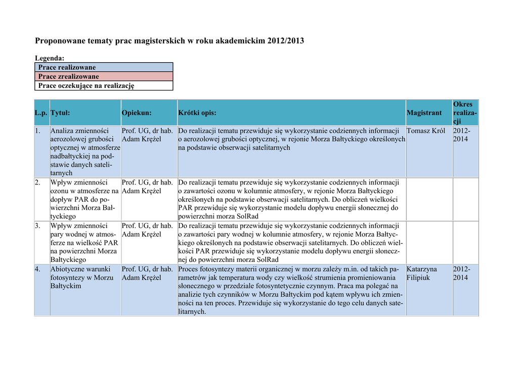 Proponowane tematy prac magisterskich w roku akademickim 2012/2013 Legenda: Prace realizowane Prace zrealizowane Prace oczekujące na realizację L.p. Tytuł: 1. 2. 3. 4. Opiekun: Analiza zmienności Prof. UG, dr hab. aerozolowej grubości Adam Krężel optycznej w atmosferze nadbałtyckiej na podstawie danych satelitarnych Wpływ zmienności Prof. UG, dr hab. ozonu w atmosferze na Adam Krężel dopływ PAR do powierzchni Morza Bałtyckiego Wpływ zmienności Prof. UG, dr hab. pary wodnej w atmos- Adam Krężel ferze na wielkość PAR na powierzchni Morza Bałtyckiego Abiotyczne warunki Prof. UG, dr hab. fotosyntezy w Morzu Adam Krężel Bałtyckim Krótki opis: Magistrant Do realizacji tematu przewiduje się wykorzystanie codziennych informacji Tomasz Król o aerozolowej grubości optycznej, w rejonie Morza Bałtyckiego określonych na podstawie obserwacji satelitarnych Do realizacji tematu przewiduje się wykorzystanie codziennych informacji o zawartości ozonu w kolumnie atmosfery, w rejonie Morza Bałtyckiego określonych na podstawie obserwacji satelitarnych. Do obliczeń wielkości PAR przewiduje się wykorzystanie modelu dopływu energii słonecznej do powierzchni morza SolRad Do realizacji tematu przewiduje się wykorzystanie codziennych informacji o zawartości pary wodnej w kolumnie atmosfery, w rejonie Morza Bałtyckiego określonych na podstawie obserwacji satelitarnych. Do obliczeń wielkości PAR przewiduje się wykorzystanie modelu dopływu energii słonecznej do powierzchni morza SolRad Proces fotosyntezy materii organicznej w morzu zależy m.in. od takich pa- Katarzyna rametrów jak temperatura wody czy wielkość strumienia promieniowania Filipiuk słonecznego w przedziale fotosyntetycznie czynnym. Praca ma polegać na analizie tych czynników w Morzu Bałtyckim pod kątem wpływu ich zmienności na ten proces. Przewiduje się wykorzystanie do tego celu danych satelitarnych. Okres realizacji 20122014 20122014 5. 6. 7. 8. Lepkość turbulentna w Prof. UG, dr hab. modelach cyrkulacji Witold Cieślikiewód morskich wicz Modelowanie falowa- Prof. UG, dr hab. nia wiatrowego w Za- Witold Cieślikietoce Pomorskiej wicz Analiza porównawcza Prof. UG, dr hab. modelowanych i mie- Witold Cieślikierzonych charakterystyk wicz widmowych falowania wiatrowego na Bałtyku Mechanizmy rozpra- Prof. UG, dr hab. szania fal akustycznych Natalia Gorska na roślinach bentosowych Małgorzata Krakowiak Cel pracy: zrozumienie mechanizmów rozpraszania dźwięku na roślinach Anna podwodnych Metoda: modelowanie numeryczne rozpraszania fal akustycz- Raczkowska nych na roślinach, porównanie wyników modelowania z danymi pomiarowymi, obróbka danych pomiarowych, pomiary Uzasadnienie istotności: istotne dla opracowania akustycznych technik detekcji oraz charakteryzacji roślinności podwodnej. 9. Akustyczne badania Prof. UG, dr hab. Uzasadnienie istotności badań: istotne dla opracowania akustycznych techbiologicznych warstw Natalia Gorska nik detekcji i klasyfikacji warstw biologicznych oraz dla zrozumienia funkrozpraszających w Zacjonowania ekosystemów Zatoki Gdańskiej. toce Gdańskiej Cel pracy: 1. określenie właściwości rozpraszających warstw biologicznych w Zatoce Gdańskiej; 2. określenie rozkładu przestrzennego warstw biologicznych. Metoda badań: pomiary hydroakustyczne, obróbka i interpretacja danych pomiarowych. 10. Rozpraszanie fal aku- Prof. UG, dr hab. Cel pracy: zrozumienie mechanizmów rozpraszania fal akustycznych na stycznych na pęcheNatalia Gorska pęcherzykach gazowych (np., pęcherzyki tlenu powstałe w wyniku fotosynrzykach gazowych potezy mikro glonów) uwięzionych w osadach piaszczystych. chodzenia biologiczneMetoda: modelowanie numeryczne, porównanie wyników modelowania z go w osadach piaszczywynikami pomiarów, przegląd literatury. stych Uzasadnienie istotności: istotne dla opracowania akustycznych technik badań środowiska morskiego 20122014 20102012 20122014 20122014 11. Model GIS sejszy zbiorników zamkniętych 12. Modelowanie pola prędkości w warstwie przydennej strefy brzegowej morza 13. Przestrzenna zmienność warunków atmosferycznych na Zatoce Gdańskiej Prof.UG, dr hab. Praca polega na wykonaniu modelu GIS wyznaczania drgań własnych poJacek Urbański wierzchni zbiornika, może on być też rozszerzony na termoklinę, metodą Defanta. Ta klasyczna metoda (opracowana w 1918) daje dobre wyniki (określa okres i położenie linii nodalnych), a jej główną wadą jest pracochłonność polegająca na wprowadzaniu szczegółowych przekrojów zbiornika. GIS stwarza możliwość pełnego zautomatyzowania całego procesu. Model zostałby napisany w Pythonie z wykorzystaniem bibliotek geoprocesingu programu ArcGIS 10.1 oraz zweryfikowany za pomocą pomiarów eksperymentalnych. Dr Gabriela Gic- Celem pracy jest opracowanie kompleksowego modelu przydennego obszaGrusza ru ruchu w strefie brzegowej morza. Model powinien uwzględniać współistnienie w tej strefie falowania i prądów – tj. form ruchu związanych z innymi skalami czasowymi. Dr Agnieszka Wiele procesów hydrodynamicznych (prądy, falowanie, transport osadów Aleksandra Herman etc.) zachodzących w rejonach przybrzeżnych morza zależy od lokalnych Popiołek warunków atmosferycznych, różniących się od warunków zarówno na otwartym morzu, jak i w głębi lądu. Ta lokalna specyfika nie jest możliwa do uwzględnienia w mezoskalowych modelach atmosfery (zbyt niska rozdzielczość), rutynowo używanych jako źródło danych wejściowych do analizy procesów zachodzących w morzu. Celem pracy jest wykorzystanie: (i) danych pomiarowych z obszaru Zatoki Gdańskiej oraz (ii) lokalnego numerycznego modelu atmosfery zagnieżdżonego w modelu mezoskalowym, do analizy zmienności przestrzennej wiatru, temperatury powietrza, wilgotności i zachmurzenia na obszarze Zatoki Gdańskiej. Dr Agnieszka Agata Herman Grynczel 14. Analiza oddziaływań dolnej warstwy atmosfery z lodem morskim 15. Chara