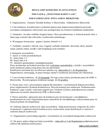 REGULAMIN KONKURSU PLASTYCZNEGO POD NAZWĄ: „WSZYSTKIE BARWY LASU”. POD PATRONATEM WÓTA GMINY BIERZWNIK. 1. Organizatorzy: Gminny Ośrodek Kultury w Bierzwniku, Nadleśnictwo Bierzwnik. 2. Cele konkursu: kształtowanie wyobraźni plastycznej inspirowanej pięknem przyrody, rozwijanie umiejętności obserwacji oraz posługiwania się różnymi technikami malarskimi. 3. Tematyka: las jako siedlisko bogatej fauny i flory przedstawiony w różnych porach roku, a także jego wartości dla człowieka i środowiska naturalnego. 4. Wymagany format prac: papier ( karton, bristol) A-3 5. Technika: rysunek ( ołówek, tusz, węgiel), techniki malarskie: akwarela, akryl, pastele suche, pastele olejne, kredki ( lub kompilacja tych technik). 6. Kategorie uczestników: I - dzieci w wieku przedszkolnym II - dzieci klas 1-3 III- dzieci klas 4-6 IV- młodzież gimnazjalna i ponadgimnazjalna Prace przekazane na konkurs powinny być wykonane samodzielnie, a każdy z uczestników może przekazać jedną swoją pracę bez jej oprawiania. Każda praca powinna być na odwrocie opisana wg. załącznika nr 1 do Regulaminu. Organizatorzy zastrzegają, że prace biorące udział w konkursie pozostaną ich własnością. 7. Czas trwania konkursu: do 25 listopada. Do tego czasu należy przekazać prace do GOK w Bierzwniku. Rozstrzygnięcie konkursu nastąpi do 04 grudnia. 8. Oceny prac wraz z przyznaniem nagród dla laureatów i wyróżnionych dokona powołana przez organizatorów Komisja Konkursowa. Decyzja komisji jest ostateczna. Podsumowanie konkursu i jego wyniki, wręczenie nagród oraz wernisaż wystawy pokonkursowej zostaną ogłoszone na stronie internetowej GOK w Bierzwniku. 9. Prawa autorskie: zgłoszenie prac do konkursu jest równoznaczne z nieodpłatnym przekazaniem na rzecz Organizatora praw autorskich do nieodpłatnego wykorzystania prac na różnych polach ich eksploatacji. 10. Ochrona danych osobowych: dane uczestników będą przetwarzane wyłącznie do celów związanych z organizowaniem konkursu przy zachowaniu zasad określonych w ustawie o ochronie danych osobowych. 11. Organizatorzy przewidują nagrody i wyróżnienia we wszystkich kategoriach wiekowych. 12. Do pracy należy dołączyć kartę uczestnika - załącznik nr 2 do Regulaminu podpisaną przez rodzica lub opiekuna autora pracy. ORGANIZATORZY