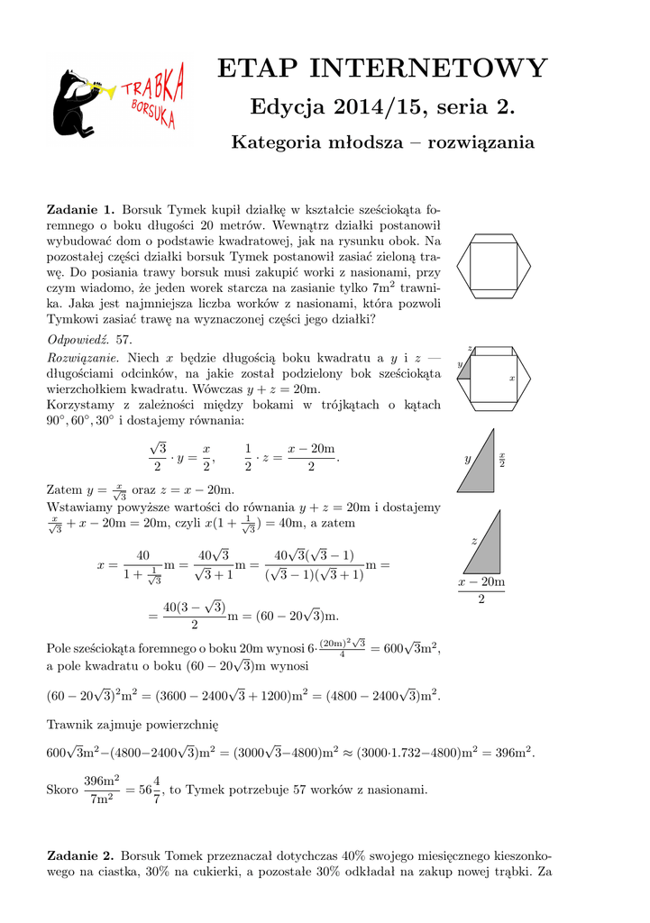 ETAP INTERNETOWY Edycja 2014/15, seria 2. Kategoria młodsza – rozwiązania Zadanie 1. Borsuk Tymek kupił działkę w kształcie sześciokąta foremnego o boku długości 20 metrów. Wewnątrz działki postanowił wybudować dom o podstawie kwadratowej, jak na rysunku obok. Na pozostałej części działki borsuk Tymek postanowił zasiać zieloną trawę. Do posiania trawy borsuk musi zakupić worki z nasionami, przy czym wiadomo, że jeden worek starcza na zasianie tylko 7m2 trawnika. Jaka jest najmniejsza liczba worków z nasionami, która pozwoli Tymkowi zasiać trawę na wyznaczonej części jego działki? Odpowiedź. 57. Rozwiązanie. Niech x będzie długością boku kwadratu a y i z — długościami odcinków, na jakie został podzielony bok sześciokąta wierzchołkiem kwadratu. Wówczas y + z = 20m. Korzystamy z zależności między bokami w trójkątach o kątach 90◦ , 60◦ , 30◦ i dostajemy równania: √ x 1 x − 20m 3 ·y = , ·z = . 2 2 2 2 z y x x 2 y Zatem y = √x3 oraz z = x − 20m. Wstawiamy powyższe wartości do równania y + z = 20m i dostajemy x √ + x − 20m = 20m, czyli x(1 + √13 ) = 40m, a zatem 3 √ √ √ 40 40 3( 3 − 1) 40 3 √ x= m= √ m= m= √ 1 + √13 3+1 ( 3 − 1)( 3 + 1) = 40(3 − 2 √ 3) √ m = (60 − 20 3)m. z x − 20m 2 √ √ 2 3 Pole sześciokąta foremnego o boku 20m wynosi 6· (20m) = 600 3m2 , 4 √ a pole kwadratu o boku (60 − 20 3)m wynosi √ √ √ (60 − 20 3)2 m2 = (3600 − 2400 3 + 1200)m2 = (4800 − 2400 3)m2 . Trawnik zajmuje powierzchnię √ √ √ 600 3m2 −(4800−2400 3)m2 = (3000 3−4800)m2 ≈ (3000·1.732−4800)m2 = 396m2 . Skoro 396m2 4 = 56 , to Tymek potrzebuje 57 worków z nasionami. 2 7m 7 Zadanie 2. Borsuk Tomek przeznaczał dotychczas 40% swojego miesięcznego kieszonkowego na ciastka, 30% na cukierki, a pozostałe 30% odkładał na zakup nowej trąbki. Za 60% kwoty przeznaczanej na ciastka kupował swoje ulubione biszkopty o smaku królika. Postanowił jednak, że od przyszłego miesiąca kwota odkładana na trąbkę będzie o 20% wyższa od dotychczasowej. Ponieważ w dalszym ciągu dostaje tyle samo kieszonkowego, brakujące pieniądze postanowił pozyskać z budżetu przeznaczanego na biszkopty (które już mu się trochę przejadły). Jaką część starej kwoty przeznaczanej na biszkopty stanowi nowa kwota przeznaczana na ten cel? Wynik podaj w procentach. Odpowiedź. 75. Rozwiązanie. Przyjmijmy, że Tomek co miesiąc dostaje x kieszonkowego. Na początku Tomek przeznaczał 40% · x = 0.4x na ciastka, 30% · x = 0.3x na cukierki, a 30% · x = 0.3x odkładał na zakup trąbki. Budżet przeznaczony na biszkopty wynosił 60% · 0.4x = 0.6 · 0.4x = 0.24x. Po zmianie planu finansowego Tomek odkłada na trąbkę o 20% · 0.3x = 0.2 · 0.3x = 0.06x więcej niż dotychczas, więc teraz na biszkopty przeznacza 0.24x − 0.06x = 0.18x. Nowa kwota przeznaczona na biszkopty stanowi 0.18x 0.24x = 18 24 = 3 4 = 75% starej kwoty. Zadanie 3. Łasica Emilka ma długą czerwoną wstążkę. Pewnego dnia złożyła ją na pół, potem jeszcze raz na pół, a potem jeszcze osiem razy. Wszystkie zgięcia były wykonane w poprzek wstążki. Złośliwy borsuk Romek przeciął w połowie złożoną wstążkę równolegle do zgięć. Na ile części została podzielona wstążka? Odpowiedź. 1025. Rozwiązanie. Każde złożenie wstążki na pół powoduje dwukrotne zwiększenie liczby warstw. To oznacza, że po dziesięciokrotnym złożeniu wstążki dostajemy 210 = 1024 warstwy. To oznacza, że wstążka została przecięta w 1024 miejscach. Zatem wstążka została podzielona na 1025 części. Zadanie 4. Borsuk Bartek konstruuje zegar. Numer na każdym z trybików oznacza liczbę jego ząbków. Do kółka o 1320 ząbkach przytwierdził wskazówkę minutową. Wskazówkę sekundową chce przytwierdzić do kółka na drugim końcu ciągu zębatek. Ile ząbków musi mieć ostatnie kółko, żeby zegar działał poprawnie? 2015 1320 Odpowiedź. 22. Rozwiązanie. Każdy obrót wskazówki minutowej o kąt pełny powinien skutkować sześćdziesięciokrotnym obrotem wskazówki sekundowej. To oznacza, że ostatni trybik powinien mieć sześćdziesięciokrotnie mniej ząbków niż trybik, do którego przytwierdzona jest wskazówka minutowa. 1320 Ostatnie kółko musi mieć = 22 ząbków. 60 Zadanie 5. W lesie, w którym mieszka wiewiór Grześ, drzewa były rozstawione w regularnych odstępach co 5 metrów, jednak po wczorajszej burzy dwa z nich zostały powalone. Teraz układ drzew wygląda jak na rysunku obok. Grześ potrafi skakać na odległość co najwyżej 6 metrów. Chce przedostać się najkrótszą możliwą drogą ze swojej dziupli w drzewie oznaczonym literą D do skrytki z orzechami znajdującej się w drzewie O, nie schodząc na ziemię. Na ile sposobów może to zrobić? Odpowiedź. 77. ? O D Rozwiązanie. Każda z najkrótszych tras składa się z dziesięciu odcinków — z pięciu poziomych i pięciu pionowych. Grześ poruszając się takimi trasami idzie jedynie „w górę” i „w prawo”. Zliczymy osobno trasy, które zawierają zielony, niebieski, czerwony oraz pomarańczowy punkt. Jest jasne, że każda trasa musi przejść przez któryś z tych punktów oraz że żadna trasa nie może przejść przez więcej niż jeden z nich. Każda trasa, która przechodzi przez zielony punkt, musi zawierać zaznaczony fragment trasy. Należy zliczyć liczbę tras wiodących z domu Grzesia do drzewa A. Jest ich dokładnie 21 — wszystkie są wyrysowane poniżej. O D A O D O Każda trasa, która przechodzi przez niebieski punkt, musi zawierać zaznaczony fragment trasy. Należy znaleźć liczbę tras wiodących z domu Grzesia do drzewa B oraz liczbę tras łączących drzewo C z drzewem O. Tych pierwszych jest dokładnie 10, a tych drugich dokładnie 3. Zatem wszystkich tras zawierających niebieskie drzewo jest 10 · 3 = 30. B C D O Każda trasa, która przechodzi przez czerwony punkt, składa 