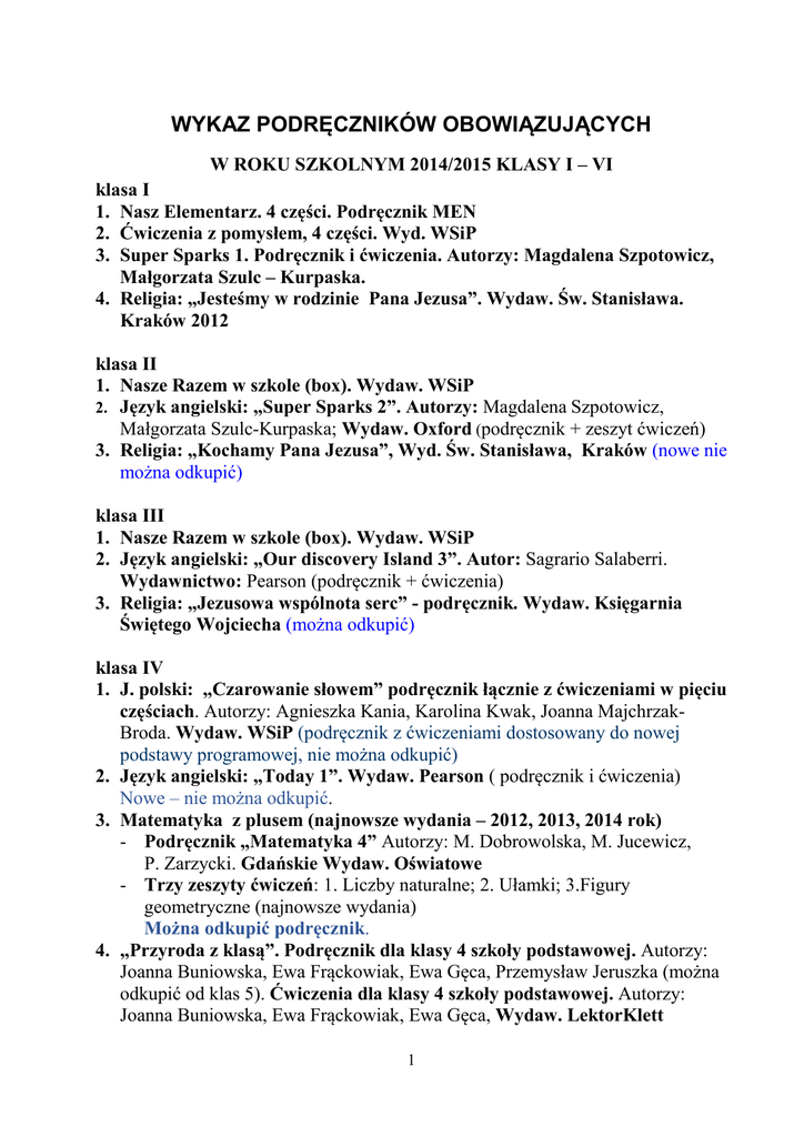 WYKAZ PODRĘCZNIKÓW OBOWIĄZUJĄCYCH W ROKU SZKOLNYM 2014/2015 KLASY I – VI klasa I 1. Nasz Elementarz. 4 części. Podręcznik MEN 2. Ćwiczenia z pomysłem, 4 części. Wyd. WSiP 3. Super Sparks 1. Podręcznik i ćwiczenia. Autorzy: Magdalena Szpotowicz, Małgorzata Szulc – Kurpaska. 4. Religia: „Jesteśmy w rodzinie Pana Jezusa”. Wydaw. Św. Stanisława. Kraków 2012 klasa II 1. Nasze Razem w szkole (box). Wydaw. WSiP 2. Język angielski: „Super Sparks 2”. Autorzy: Magdalena Szpotowicz, Małgorzata Szulc-Kurpaska; Wydaw. Oxford (podręcznik + zeszyt ćwiczeń) 3. Religia: „Kochamy Pana Jezusa”, Wyd. Św. Stanisława, Kraków (nowe nie można odkupić) klasa III 1. Nasze Razem w szkole (box). Wydaw. WSiP 2. Język angielski: „Our discovery Island 3”. Autor: Sagrario Salaberri. Wydawnictwo: Pearson (podręcznik + ćwiczenia) 3. Religia: „Jezusowa wspólnota serc” - podręcznik. Wydaw. Księgarnia Świętego Wojciecha (można odkupić) klasa IV 1. J. polski: „Czarowanie słowem” podręcznik łącznie z ćwiczeniami w pięciu częściach. Autorzy: Agnieszka Kania, Karolina Kwak, Joanna MajchrzakBroda. Wydaw. WSiP (podręcznik z ćwiczeniami dostosowany do nowej podstawy programowej, nie można odkupić) 2. Język angielski: „Today 1”. Wydaw. Pearson ( podręcznik i ćwiczenia) Nowe – nie można odkupić. 3. Matematyka z plusem (najnowsze wydania – 2012, 2013, 2014 rok) - Podręcznik „Matematyka 4” Autorzy: M. Dobrowolska, M. Jucewicz, P. Zarzycki. Gdańskie Wydaw. Oświatowe - Trzy zeszyty ćwiczeń: 1. Liczby naturalne; 2. Ułamki; 3.Figury geometryczne (najnowsze wydania) Można odkupić podręcznik. 4. „Przyroda z klasą”. Podręcznik dla klasy 4 szkoły podstawowej. Autorzy: Joanna Buniowska, Ewa Frąckowiak, Ewa Gęca, Przemysław Jeruszka (można odkupić od klas 5). Ćwiczenia dla klasy 4 szkoły podstawowej. Autorzy: Joanna Buniowska, Ewa Frąckowiak, Ewa Gęca, Wydaw. LektorKlett 1 5. Historia: „My i historia. Historia i społeczeństwo” (na podręczniku dopisano „Do nowej podstawy programowej”. Autorzy: Bogumiła Olszewska, Wiesława Surdyk – Fertach. Wydaw. PWN (można odkupić od obecnych klas 4) 6. „Plastyka 4–6”. Autor: Stopczyk, Barbara Neubart, Joanna Chołaścińska). Wydaw. WSiP. (podręcznik dostosowany do nowej podstawy programowej, nie można odkupić od obecnych klas 5, podręcznik na trzy lata nauki) 7. „Klucz do muzyki 4”. Nowa podstawa programowa. Autorzy: Katarzyna Jakóbczak-Drążek, Urszula Smoczyńska, Agnieszka Sołtysik. Wydaw. WSiP (można odkupić od obecnych klas 4) 8. Zajęcia techniczne. Część komunikacyjna. Seria: Odkrywamy na nowo. Podręcznik. Wydaw. Operon. Autorzy: Urszula Białka, Jerzy Chrabąszcz. (można odkupić od obecnych klas 4 wydanie z 2010r. i nowsze) 9. Podręcznik do zajęć komputerowych, klasa 4: „Informatyka Europejczyka”. Edycja: Windows XP, Linux Buntu, MS Office 2003, Open Office.org. Autorzy: Danuta Kiałka, Katarzyna Kiałka. Wydaw. Helion (można odkupić od obecnych klas 4 wraz z płytą) 10.Religia: „Słuchamy Pana Boga.” Podręcznik klasa 4. Wydaw. Św. Stanisława. Kraków (podręcznik można odkupić) klasa V 1. J. polski: „Czarowanie słowem” podręcznik (w dwu częściach) i dwa zeszyty ćwiczeń. Autorzy: Agnieszka Kania, Karolina Kwak, Joanna Majchrzak-Broda. Wydaw. WSiP (dostosowany do nowej podstawy programowej, podręcznik można odkupić). 2. Język angielski: „Today 2”. Wydaw. Pearson – Longman (podręcznik i ćwiczenia) 3. Matematyka z plusem (najnowsze wydania od 2012) - Podręcznik „Matematyka 5”. Autorzy: M. Dobrowolska, M. Karpiński, P. Zarzycki, M. Jucewicz. Gdańskie Wydawnictwo Oświatowe - Trzy zeszyty ćwiczeń: Liczby i ułamki cz. 1; Liczby i ułamki cz. 2; Geometria ( można odkupić podręcznik). 4. „Przyroda z klasą”. Podręcznik dla klasy 5 szkoły podstawowej. Autorzy: Joanna Buniowska, Ewa Frąckowiak, Ewa Gęca, Przemysław Jeruszka. Wydaw. LektorKlett (można odkupić, podręcznik dostosowany do nowej podstawy programowej) 5. Historia: „My i historia. Historia i społeczeństwo” (na podręczniku dopisano „Do nowej podstawy programowej”. Autorzy: Bogumiła Olszewska, Wiesława Surdyk – Fertach. Wydaw. PWN (można odkupić). 6. „Plastyka 4 – 6”. Autor: Stopczyk, Barbara Neubart, Beata Kordon). Wydaw. WSiP (ciąg dalszy podręcznika z klasy czwartej) 2 7. „Klucz do muzyki 5”. Nowa podstawa programowa. Autorzy: Katarzyna Jakóbczak-Drążek, Urszula Smoczyńska, Agnieszka Sołtysik. Wydaw. WSiP (można odkupić) 8. Zajęcia techniczne. Część techniczna. Seria: Odkrywamy na nowo. Podręcznik. Wydaw. Operon. Autor: Urszula Białka (nie można odkupić) 9. Podręcznik do zajęć komputerowych, klasa 5 – „Informatyka Europejczyka”. Edycja: Windows XP, Linux Buntu, MS Office 2003, Open Office.org. Autorzy: Danuta Kiałka, Katarzyna Kiałka. Wydaw. Helion (można odkupić z płytą) 10.Religia: „Wierzymy w Pana Boga”, Wyd. Św. Stanisława, Kraków (nie można odkupić) klasa VI 1. J. polski: „Czarowanie słowem” podręcznik i dwa zeszyty ćwiczeń. Autorzy: Agnieszka Kania, Karolina Kwak, Joanna Majchrzak-Broda. Wydaw. WSiP (nie można odkupić, nowość). 2. Język angielski: „Look! 2”. Wydaw. Pearson - Longman ( kontynuacja z klasy 5). „Repetytorium Szóstoklasisty”. Wydaw. Pearson- Longman 3. Matematyka z plusem - Podręcznik „Matematyka 6”. Autorzy: M. Dobrowolska, M. Jucewicz, M. Karpiński, P. Zarzycki. Gdańskie Wydawnictwo Oświatowe (nie można odkupić, książka będzie dostępna w sprzedaży od: czerwiec 2014) - Trzy zeszyty ćwiczeń: Liczby i wyrażenia algebraiczne, część 1.; Liczby i wyrażenia algebraiczne, część 2; Geometria. (ćwiczenia będą dostępne w sprzedaży od: lipiec 2014) 4. „Przyroda z klasą”. Podręcznik dla klasy 6 szkoły podstawowej. Autorzy: Joanna Buniowska, Ewa Frąckowiak, Ewa Gęca, Przemysław Jeruszka. Wyda