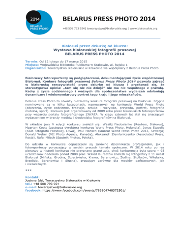 BELARUS PRESS PHOTO 2014 +48 508 793 924| [email protected] | www.bialoruskie.org Białoruś przez dziurkę od klucza: Wystawa białoruskiej fotografii prasowej BELARUS PRESS PHOTO 2014 Termin: Od 12 lutego do 17 marca 2015 Miejsce: Wojewódzka Biblioteka Publiczna w Krakowie, ul. Rajska 1 Organizator: Towarzystwo Białoruskie w Krakowie we współpracy z Belarus Press Photo Białoruscy fotoreporterzy są podglądaczami, dokumentującymi życie współczesnej Białorusi. Konkurs fotografii prasowej Belarus Press Photo 2014 pozwala zajrzeć w białoruską rzeczywistość przez dziurkę od klucza i przekonać się, że stereotypowa opinia: „tam się nic nie dzieje” nie ma nic wspólnego z prawdą. Kadry z życia codziennego i ważnych dla społeczeństwa wydarzeń odsłaniają dynamiczny i wielowymiarowy portret tego kraju i jego mieszkańców. Belarus Press Photo to otwarty niezależny konkurs fotografii prasowej na Białorusi. Zdjęcia nominowane są w kilku kategoriach, wzorowanych na konkursie World Press Photo (zdarzenia, życie codzienne, tradycje, sztuka i rozrywka, przyroda, portret, fotografia mobilna, sport). Konkurs jest organizowany od 2009 roku przez białoruskich fotoreporterów przy wsparciu portalu fotograficznego ZNYATA. W ciągu czterech lat stał się znaczącym wydarzeniem w branży mediów i środowisku fotografików na Białorusi. W składzie jury V edycji konkursu znaleźli się: Wasilij Fiedosienko (Reuters, Białoruś), Maarten Koets (zastępca dyrektora konkursu World Press Photo, Holandia), Jonas Staselis (Klub Fotografii Prasowej, Litwa), Paul Hansen (laureat World Press Photo 2013, Szwecja) Donald Weber (VII Photo Agency, Kanada), Aleksandr Ziemlaniczenko (Associated Press, Rosja), Rafal Milach (Sputnik Photos, Polska). Do udziału w konkursie dopuszczeni są zarówno dziennikarze profesjonalni, jak i fotoreporterzy poruszający w swoich pracach tematy społeczne. W 2014 roku po raz pierwszy w historii konkursu nie przyznano grand prix, choć konkurencja była spora – 93 uczestników nadesłało ponad 2000 prac. Wśród laureatów znaleźli się fotograficy z 11 miast Białorusi (Mińska, Grodna, Dzierżyńska, Krewa, Baranowicz, Żodina, Stołbców, Witebska, Brześcia, Baranowicz i Słucka), pracujący zarówno dla mediów państwowych, jak i niezależnych. *** Kontakt: Justyna Idzi, Towarzystwo Białoruskie w Krakowie tel.: +48 508 793 924 e-mail: [email protected] facebook: https://www.facebook.com/events/783804748372501/