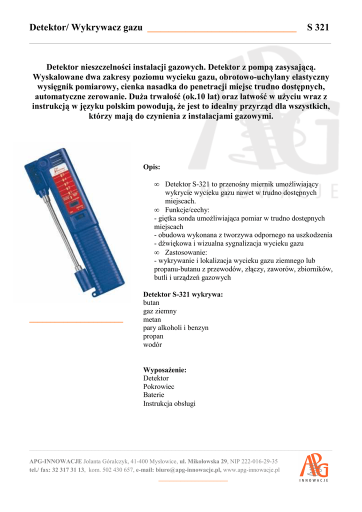 Detektor/ Wykrywacz gazu ___________________________________ S 321 ______________________________________________________________ Detektor nieszczelności instalacji gazowych. Detektor z pompą zasysającą. Wyskalowane dwa zakresy poziomu wycieku gazu, obrotowo-uchylany elastyczny wysięgnik pomiarowy, cienka nasadka do penetracji miejsc trudno dostępnych, automatyczne zerowanie. Duża trwałość (ok.10 lat) oraz łatwość w użyciu wraz z instrukcją w języku polskim powodują, że jest to idealny przyrząd dla wszystkich, którzy mają do czynienia z instalacjami gazowymi. Opis: • Detektor S-321 to przenośny miernik umożliwiający wykrycie wycieku gazu nawet w trudno dostępnych miejscach. • Funkcje/cechy: - giętka sonda umożliwiająca pomiar w trudno dostępnych miejscach - obudowa wykonana z tworzywa odpornego na uszkodzenia - dźwiękowa i wizualna sygnalizacja wycieku gazu • Zastosowanie: - wykrywanie i lokalizacja wycieku gazu ziemnego lub propanu-butanu z przewodów, złączy, zaworów, zbiorników, butli i urządzeń gazowych ______________________ Detektor S-321 wykrywa: butan gaz ziemny metan pary alkoholi i benzyn propan wodór Wyposażenie: Detektor Pokrowiec Baterie Instrukcja obsługi ___________________________________________________________________________________ APG-INNOWACJE Jolanta Góralczyk, 41-400 Mysłowice, ul. Mikołowska 29, NIP 222-016-29-35 tel./ fax: 32 317 31 13, kom. 502 430 657, e-mail: [email protected], www.apg-innowacje.pl ___________________ Detektor/ Wykrywacz gazu ___________________________________ S 321 ______________________________________________________________ Dane techniczne: Detektor wycieku gazu Rodzaj sensora Metoda próbkowania gazu Wykrywane gazy Czułość pomiarowa (przybliżona) Ręczna regulacja czułości Gazy zakłócające pomiar Wskaźnik optyczny Sygnalizacja akustyczna Długość sondy Temperatura pracy Wilgotność względna powietrza: Kalibracja Wskaźnik pracy/ stanu baterii Sygnalizacja wykrycia gazu Zasilanie Czas pracy ciągłej (przybliżony) Waga z bateriami Wymiary S 321 półprzewodnikowy (prod. Japońskiej) wbudowana mini-pompka ssąca, automatyczna korekcja tła gazowego (po włączeniu) metan, propan, butan, pary alkoholi i benzyn, wodór gazy palne: 100ppm skokowa (2 pozycje) chlor, tlenki azotu, znaczny niedobór tlenu, gwałtowna zmiana wilgotności 5 x LED sygnał dźwiękowy o częstotliwości rosnącej wraz ze wzrostem stężenia gazu 18cm + 21 cm (sonda dodatkowa do penetracji szczelin) 0°C…+40°C (składowania: -10°C…+50°C) 30…90% (bez kondensacji) zalecana co 12 – 24 miesięcy (zależnie od intensywności użytkowania) lub po znacznym wzroście czułości zielona dioda LED – świeci stale (gotowość)/ pulsuje 4Hz (konieczność wymiany baterii) optyczna – 5 lampek LED czerwonych, akustyczna 6 szt. Baterii alkalicznych typ AA lub 6 szt. Akumulatorów NiMH 2000 mAh ok. 6 h pracy ciągłej (baterie alkaliczne), ok. 8h pracy ciągłej (akumulatory NiMH 2000mAh) 400 g 254 x 78 x 34mm ___________________________________________________________________________________ APG-INNOWACJE Jolanta Góralczyk, 41-400 Mysłowice, ul. Mikołowska 29, NIP 222-016-29-35 tel./ fax: 32 317 31 13, kom. 502 430 657, e-mail: [email protected], www.apg-innowacje.pl ___________________