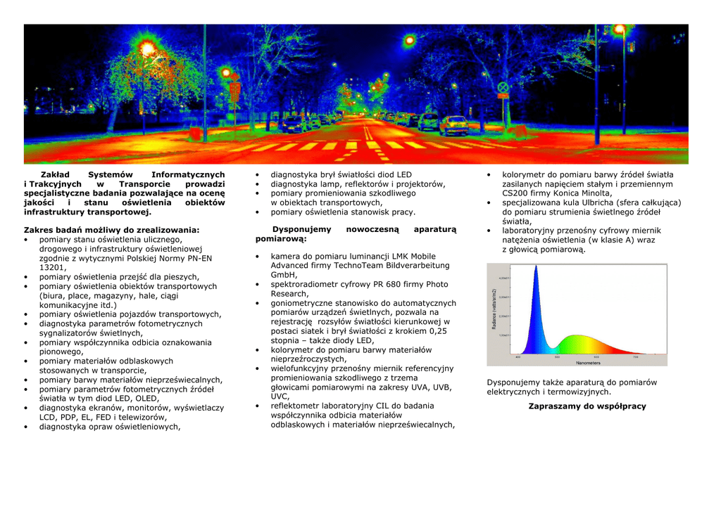 Zakład Systemów Informatycznych i Trakcyjnych w Transporcie prowadzi specjalistyczne badania pozwalające na ocenę jakości i stanu oświetlenia obiektów infrastruktury transportowej. Zakres badań możliwy do zrealizowania: • pomiary stanu oświetlenia ulicznego, drogowego i infrastruktury oświetleniowej zgodnie z wytycznymi Polskiej Normy PN-EN 13201, • pomiary oświetlenia przejść dla pieszych, • pomiary oświetlenia obiektów transportowych (biura, place, magazyny, hale, ciągi komunikacyjne itd.) • pomiary oświetlenia pojazdów transportowych, • diagnostyka parametrów fotometrycznych sygnalizatorów świetlnych, • pomiary współczynnika odbicia oznakowania pionowego, • pomiary materiałów odblaskowych stosowanych w transporcie, • pomiary barwy materiałów nieprzeświecalnych, • pomiary parametrów fotometrycznych źródeł światła w tym diod LED, OLED, • diagnostyka ekranów, monitorów, wyświetlaczy LCD, PDP, EL, FED i telewizorów, • diagnostyka opraw oświetleniowych, • • • • diagnostyka brył światłości diod LED diagnostyka lamp, reflektorów i projektorów, pomiary promieniowania szkodliwego w obiektach transportowych, pomiary oświetlenia stanowisk pracy. Dysponujemy pomiarową: • • • • • • nowoczesną aparaturą kamera do pomiaru luminancji LMK Mobile Advanced firmy TechnoTeam Bildverarbeitung GmbH, spektroradiometr cyfrowy PR 680 firmy Photo Research, goniometryczne stanowisko do automatycznych pomiarów urządzeń świetlnych, pozwala na rejestrację rozsyłów światłości kierunkowej w postaci siatek i brył światłości z krokiem 0,25 stopnia – także diody LED, kolorymetr do pomiaru barwy materiałów nieprzeźroczystych, wielofunkcyjny przenośny miernik referencyjny promieniowania szkodliwego z trzema głowicami pomiarowymi na zakresy UVA, UVB, UVC, reflektometr laboratoryjny CIL do badania współczynnika odbicia materiałów odblaskowych i materiałów nieprzeświecalnych, • • • kolorymetr do pomiaru barwy źródeł światła zasilanych napięciem stałym i przemiennym CS200 firmy Konica Minolta, specjalizowana kula Ulbricha (sfera całkująca) do pomiaru strumienia świetlnego źródeł światła, laboratoryjny przenośny cyfrowy miernik natężenia oświetlenia (w klasie A) wraz z głowicą pomiarową. Dysponujemy także aparaturą do pomiarów elektrycznych i termowizyjnych. Zapraszamy do współpracy Pomiar luminancji nawierzchni drogi zgodnie z normą PN-EN 13201:2007 Dane adresowe: POLITECHNIKA WARSZAWSKA Politechnika Warszawska Wydział Transportu ul. Koszykowa 75, pok. 221 00-662 Warszawa Zakład Systemów Informatycznych i Trakcyjnych w Transporcie telefon: 22 235 77 52 WYDZIAŁ TRANSPORTU Bliższych informacji udzielą: dr. inż. Piotr Tomczuk e-mail: [email protected] tel: 608-630-078 dr. inż. Krzysztof Stypułkowski e-mail: [email protected] tel: 507-870-700 Przykładowe wyniki pomiarów zaprezentowane są na stronie internetowej: www.knest.pw.edu.pl/tomczuk/ Luminancja [cd/m2] Możliwe zastosowania pomiarów: • • • • odbiory końcowe instalacji oświetleniowych, bieżąca kontrola stanu oświetlenia, ocena jakości zastosowanych rozwiązań oświetleniowych, audyt efektywności energetycznej instalacji oświetleniowych. Badania oświetlenia obiektów infrastruktury transportowej Badania oświetlenia obiektów infrastruktury transportowej www.it.pw.edu.pl