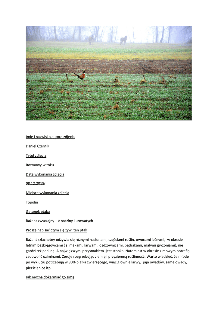 Imię i nazwisko autora zdjęcia Daniel Czernik Tytuł zdjęcia Rozmowy w toku Data wykonania zdjęcia 08.12.2015r Miejsce wykonania zdjęcia Topolin Gatunek ptaka Bażant zwyczajny - z rodziny kurowatych Proszę napisać czym się żywi ten ptak Bażant szlachetny odżywia się różnymi nasionami, częściami roślin, owocami leśnymi, w okresie letnim bezkręgowcami ( ślimakami, larwami, dżdżownicami, pędrakami, małymi gryzoniami), nie gardzi też padliną. A największym przysmakiem jest stonka. Natomiast w okresie zimowym potrafią zadowolić oziminami. Żeruje rozgrzebując ziemię i przyziemną roślinność. Warto wiedzieć, że młode po wykluciu potrzebują w 80% białka zwierzęcego, więc głownie larwy, jaja owadów, same owady, pierścienice itp. Jak można dokarmiać go zimą Myśliwi i miłośnicy zwierząt dbając o te piękne kuraki tworzą remizy śródpolne, budują urządzenia łowieckie m.in. podsypy oraz budki które rozstawiają w okresie przedzimowym i w zimie i wykładają w nie różnego rodzaju ziarna zbóż(pszenica, proso, pszenżyto, kukurydza, owies). Najciekawsze informacje o tym ptaku/gatunku Koń1: Popatrz co tam spaceruje? Koń2: To jakiś ptak. Hej ptaku!!! Bażant: Dzień dobry Koń1: Skąd jesteś? Bażant: Myśliwi wypuścili mnie na wolność w te okolice. Moi przodkowie pochodzą z Azji. Nasz gatunek introdukowany był już w czasach rzymskich. Obecnie występujemy powszechnie na terenie całej Europy. Szukam przyjaciół bo w towarzystwie zawsze jest raźniej. Ta okolica jest dla mnie nowa i nie mogę się tu odnaleźć. Może znacie lub widzieliście ptaki podobnie do mnie? Koń2: Jesteś chyba jednym z najbarwniejszych naszych ptaków? Z tego co widzę jesteś dość dużym ptakiem wielkości naszej kury domowej. Swoim upierzeniem przypominasz tęczę. Masz zieloną połyskującą głowę, białą obrożę , na szyi oraz rdzawo ubarwione pióra układające się w ciekawy łuskowaty wzór. Możesz szczycić się również długim brązowo czarnym ogonem. Bażant: Dziękuję za miłe słowa, ale to tka nasza uroda, taki się już urodziłem, a tak na marginesie w okresie wiosennym mamy czerwone płatki skórne po bokach głowy. Charakterystyczny jest także wyrostek na tylnej stronie odnóży zwany ostrogą. To piękne ubarwienie wykorzystujemy podczas toków, gdzie w marcu zwabiamy nasze partnerki zwane kurami roztaczając cały urok swoich kolorowych piór, piejąc i tańcząc drobnymi kroczkami. Koń1: To musi być bardzo ciekawe, chciał bym to zobaczyć. Bażant: Zapraszam w marcu na łąki. Koń2: A czy samice są tak samo ubarwione jak ty? Bażant: Nasze kur y nie są tak kolorowe, ich upierzenie jest szare, niepozorne i maskujące. Koń1: A dlaczego? Bażant: Ponieważ to na niej spoczywa obowiązek wysiadywania jaj w gnieździe , gdyby była kolorowa to drapieżniki bez problemu odnalazły by gniazdo i zniszczyły ciemne, nakrapiane jaja. warto też wiedzieć, że kolorowa szata koguta spełnia oprócz okresu toków jeszcze jedną ważną dla gatunku rolę. to kolorowe upierzenie powoduje, że znacznie więcej kogutów niż kur pada łupem drapieżników. jest to wręcz konieczne, bo w okresie toków potrzeba 5-7 kur na 1 koguta. jeśli kogutów jest za dużo, to spędzają z gniazd wysiadujące już jaja kury. Lęgi stygną i jaja są martwe. Koń2: To jak po wykluciu bażanty młode sobie radzą? Bażant: Pisklęta zaraz po wykluciu nie wydzielają zapachu – tzw. odwiatru, a co ciekawsze, gdy tylko wyschną opuszczają gniazdo i bardzo szybko pod opieką matki uczą się wyszukiwać pokarm. Koń1: A powiedz mi gdzie Ty mieszkasz? Masz jakiś dom, kurnik? Bażant: Tak naprawdę to nie mam. Zasiedlam otwarte lub zakrzaczone tereny krajobrazu rolniczego, skraje pól, miedzę, zadrzewienia śródpolne, rzadkie lasy, ugory, sady, nadrzeczne zarośla. Noce spędzam na gałęziach drzew. Koń1: A czy nie boisz się tak spacerować na otwartej przestrzeni? Przecież tu czyha na ciebie dużo niebezpieczeństw np. lisy, ptaki drapieżne, a nawet wałęsające się psy. Bażant: Trochę się boję, ale mam bardzo silne nogi i potrafię szybko biegać. Nie dogoni mnie nawet dorosły człowiek. My bażanty wędrujemy pieszo używamy skrzydeł jedynie w razie niebezpieczeństwa lub konieczności pokonania przeszkody. Koń2: W takim razie to witamy cię na naszych łąkach, a tam za górką znajduję się piękna remiza śródpolna przy której stoi podsyp do którego w zimie, dzieci gospodarzy noszą różnego rodzaju zboża. Bażant: To dziękuję za bardzo miłą zapoznawczą pogawędkę. Do rychłego zobaczenia. Koń1,Koń2: Żegnaj bażancie mamy nadzieję ze będzie ci tu dobrze. Zapraszamy ponownie.