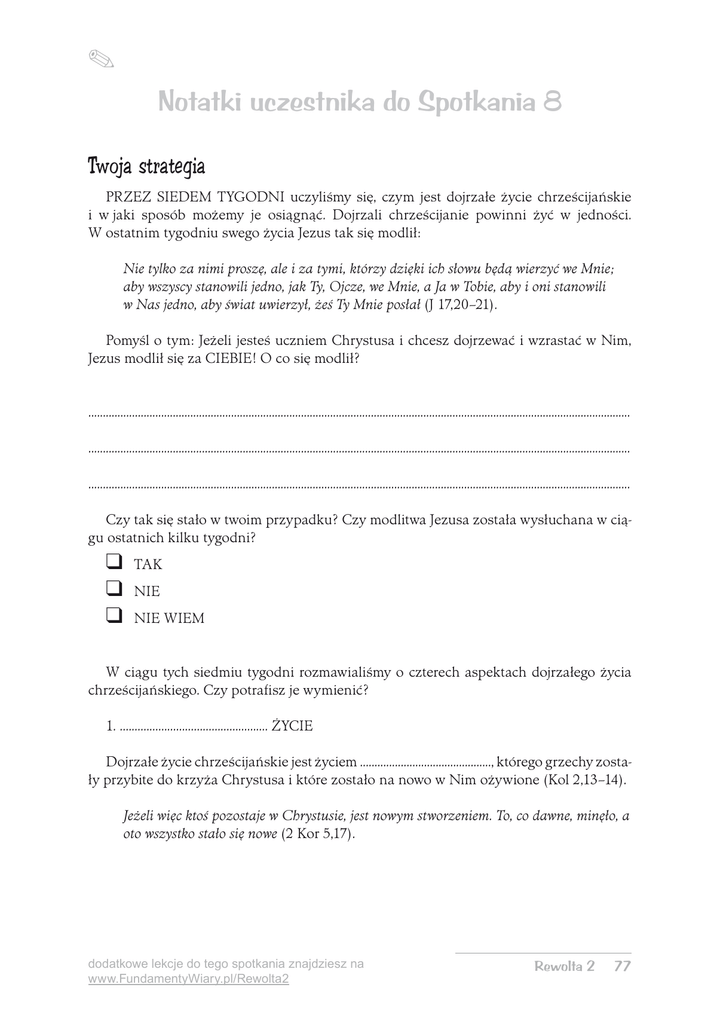 Notatki uczestnika do Spotkania 8 Twoja strategia PRZEZ SIEDEM TYGODNI uczyliśmy się, czym jest dojrzałe życie chrześcijańskie i w jaki sposób możemy je osiągnąć. Dojrzali chrześcijanie powinni żyć w jedności. W ostatnim tygodniu swego życia Jezus tak się modlił: Nie tylko za nimi proszę, ale i za tymi, którzy dzięki ich słowu będą wierzyć we Mnie; aby wszyscy stanowili jedno, jak Ty, Ojcze, we Mnie, a Ja w Tobie, aby i oni stanowili w Nas jedno, aby świat uwierzył, żeś Ty Mnie posłał (J 17,20–21). Pomyśl o tym: Jeżeli jesteś uczniem Chrystusa i chcesz dojrzewać i wzrastać w Nim, Jezus modlił się za CIEBIE! O co się modlił? .......................................................................................................................................................................................... .......................................................................................................................................................................................... .......................................................................................................................................................................................... Czy tak się stało w twoim przypadku? Czy modlitwa Jezusa została wysłuchana w ciągu ostatnich kilku tygodni? TAK NIE NIE WIEM W ciągu tych siedmiu tygodni rozmawialiśmy o czterech aspektach dojrzałego życia chrześcijańskiego. Czy potrafisz je wymienić? 1. .…………………………………………. ŻYCIE Dojrzałe życie chrześcijańskie jest życiem ............................................., którego grzechy zostały przybite do krzyża Chrystusa i które zostało na nowo w Nim ożywione (Kol 2,13–14). Jeżeli więc ktoś pozostaje w Chrystusie, jest nowym stworzeniem. To, co dawne, minęło, a oto wszystko stało się nowe (2 Kor 5,17). dodatkowe lekcje do tego spotkania znajdziesz na www.FundamentyWiary.pl/Rewolta2 Rewolta 2 77 2. .............................................. ŻYCIE Dojrzałe życie chrześcijańskie to życie ............................................., dźwigające codziennie krzyż (Łk 9,23). Tymczasem ja dla Prawa umarłem przez Prawo, aby żyć dla Boga: razem z Chrystusem zostałem przybity do krzyża. Teraz zaś już nie ja żyję, lecz żyje we mnie Chrystus. Choć nadal prowadzę życie w ciele, jednak obecne życie moje jest życiem wiary w Syna Bożego, który umiłował mnie i samego siebie wydał za mnie (Ga 2,19–20). 3. ............................................. ŻYCIE Dojrzałe życie chrześcijańskie to życie ............................................., które nie zgadza się z grzesznymi drogami świata. Nie bierzcie więc wzoru z tego świata, lecz przemieniajcie się przez odnawianie umysłu, abyście umieli rozpoznać, jaka jest wola Boża: co jest dobre, co Bogu przyjemne i co doskonałe (Rz 12,2). 4. ŻYCIE Z ............................................. Dojrzałe życie chrześcijańskie ma ............................................. dzielenia się Ewangelią z wszystkimi narodami i kulturami. Wszystko zaś to pochodzi od Boga, który pojednał nas z sobą przez Chrystusa i zlecił nam posługę jednania. Tak więc w imieniu Chrystusa spełniamy posłannictwo jakby Boga samego, który przez nas udziela napomnień. W imię Chrystusa prosimy: pojednajcie się z Bogiem (2 Kor 5,18.20). Jakie trzy rzeczy, które pomogą przemienić moją rodzinę, szkołę, mój Kościół i ludzi wokół mnie, zrobię jako ambasador Chrystusa? 1. ............................................................................................................................................................................ 2. ............................................................................................................................................................................ 3. ............................................................................................................................................................................ Jakie trzy rzeczy możemy zrobić razem jako grupa lub jako Kościół? 1. ............................................................................................................................................................................ 2. ............................................................................................................................................................................ 3. ............................................................................................................................................................................ 78 Rewolta 2 dodatkowe lekcje do tego spotkania znajdziesz na www.FundamentyWiary.pl/Rewolta2