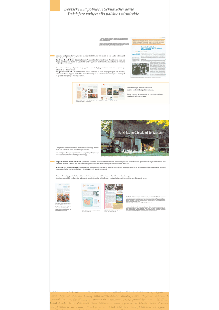 Deutsche und polnische Schulbücher heute Dzisiejsze podręczniki polskie i niemieckie In mehreren aktuellen deutschen Geschichts- und Sozialkundebüchern gibt es gesonderte Kapitel über die deutsch-polnischen Beziehungen in Geschichte und Gegenwart. W różnych aktualnych niemieckich podręcznikach do nauki historii i wiedzy o społeczeństwie znajdują się oddzielne rozdziały, poświęcone stosunkom polsko-niemieckim tak w przeszłości, jak i w teraźniejszości. Deutsche und polnische Geographie- und Geschichtsbücher haben sich in den letzten Jahren und Jahrzehnten sehr verändert. In deutschen Schulbüchern kommt Polen viel mehr vor als früher. Den Schülern wird vor Augen geführt, dass Polen in Geschichte und Gegenwart zentral mit der deutschen Geschichte verbunden war und ist. Polskie i niemieckie podręczniki do geografii i historii uległy poważnym zmianom w przeciągu ostatnich lat i dziesięcioleci. W podręcznikach niemieckich Polska zajmuje o wiele więcej miejsca niż dawniej. Uczniowie dowiadują się, że Polska tak w historii, jak i w teraźniejszości związana była i jest w sposób szczególny z historią Niemiec. Politik 2. Ein Arbeitsbuch für den Politik-Unterricht, Schöningh 2003, S. 275. Immer häufiger arbeiten Schulbuchautoren auch mit Perspektivwechseln. Coraz częściej przedstawia się w podręcznikach treści z różnej perspektywy. Er(d)kunde!: Hauptschule, Nordrhein-Westfalen / Hrsg.: Wulf Schmidt-Wulffen. - Berlin 2003 : Cornelsen. (Mensch und Raum), S. 96 f. und 98 f. Geographie-Bücher vermitteln manchmal allerdings immer noch den Eindruck eines rückständigen Polens. Czasami jednak w podręcznikach do geografii pokazywany jest nadal obraz Polski jako kraju zacofanego. Terra - GWG Geographie Wirtschaft 2 – Gymnasium Baden-Württemberg, Klett-Perthes Verlag: Gotha, Stuttgart 2004, S. 86. In polnischen Schulbüchern spielte der Nachbar Deutschland immer schon eine wichtige Rolle. Dies ist auch so geblieben. Dazugekommen sind hier für Polen sensible Themen wie die Vertreibung der deutschen Bevölkerung nach dem Zweiten Weltkrieg. W polskich podręcznikach Niemcy jako sąsiad zawsze odgrywały ważną rolę. I tak też pozostało. Doszły do tego także tematy dla Polaków drażliwe, jak na przykład wypędzenie ludności niemieckiej po II wojnie światowej. Aber auch heutige polnische Schulbücher sind nicht frei von problematischen Begriffen und Darstellungen. Współczesne polskie podręczniki szkolne nie są jednak wolne od budzących zastrzeżenia pojęć i sposobów przedstawiania treści. Der Begriff „Wiedergewonnene Gebiete“ bezeichnete im sozialistischen Polen die Gebiete, die Polen nach dem Zweiten Weltkrieg im Westen erhalten hatte. Er nahm Bezug auf deren Zugehörigkeit zum polnischen Piastenreich vom 10. bis 13. Jahrhundert. Damit war diese Argumentation genauso ideologisch wie die der Nationalsozialisten, die ihre Ansprüche mit der langen germanischen Besiedlung begründet hatten. In der Schulbuchkommission wurde der Begriff nicht verwendet. Tomasz Małkowski, Historia i społeczeństwo, Podręcznik dla klasy IV szkoły podstawowej, Gdańsk : Gdańskie Wydawn. Ośw., 1999, S. 40. Der Deutsche Orden wird häufig vor allem in schlechtes Licht gerückt. Zakon Krzyżacki przedstawiany jest często w negatywnym świetle. Tomasz Małkowski, Historia i społeczeństwo, Podręcznik dla klasy IV szkoły podstawowej, Gdańsk : Gdańskie Wydawn. Ośw. , 1999, S. 100. J./P. Trzebniak, Historia 3: gimnazjum. - Wrocław : Wydawn. Eduk. Wiking, 1999, S. 159. W Polsce socjalistycznej pojęcie „Ziemie Odzyskane“ służyło określeniu ziem na Zachodzie, które Polska otrzymała po II wojnie światowej. Odnosiło się ono do przynależności tych ziem do polskiego księstwa Piastów w okresie od X-go do XIII-go wieku. Tym samym argumentacja ta była tak samo ideologiczna, jak i argumentacja nazistów, którzy swoje roszczenia uzasadniali długoletnim osadnictwem germańskim. Komisja Podręcznikowa nie używała tego pojęcia.