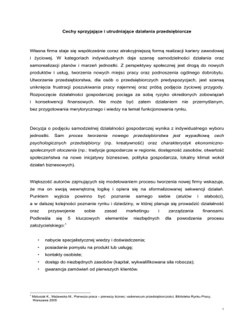 Cechy sprzyjające i utrudniające działania przedsiębiorcze Własna firma staje się współcześnie coraz atrakcyjniejszą formą realizacji kariery zawodowej i życiowej. W kategoriach indywidualnych daje szansę samodzielności działania oraz samorealizacji planów i marzeń jednostki. Z perspektywy społecznej jest drogą do nowych produktów i usług, tworzenia nowych miejsc pracy oraz podnoszenia ogólnego dobrobytu. Utworzenie przedsiębiorstwa, dla osób o przedsiębiorczych predyspozycjach, jest szansą uniknięcia frustracji poszukiwania pracy najemnej oraz próbą podjęcia życiowej przygody. Rozpoczęcie działalności gospodarczej pociąga za sobą ryzyko określonych zobowiązań i konsekwencji finansowych. Nie może być zatem działaniem nie przemyślanym, bez przygotowania merytorycznego i wiedzy na temat funkcjonowania rynku. Decyzja o podjęciu samodzielnej działalności gospodarczej wynika z indywidualnego wyboru jednostki. Sam proces tworzenia nowego przedsiębiorstwa jest wypadkową cech psychologicznych przedsiębiorcy (np. kreatywność) oraz charakterystyk ekonomicznospołecznych otoczenia (np.: tradycje gospodarcze w regionie, dostępność zasobów, otwartość społeczeństwa na nowe inicjatywy biznesowe, polityka gospodarcza, lokalny klimat wokół działań biznesowych). Większość autorów zajmujących się modelowaniem procesu tworzenia nowej firmy wskazuje, że ma on swoją wewnętrzną logikę i opiera się na sformalizowanej sekwencji działań. Punktem wyjścia powinno być poznanie samego siebie (atutów i słabości), a w dalszej kolejności poznanie rynku i dziedziny, w której planuje się prowadzić działalność oraz przyswojenie Podkreśla się 5 sobie kluczowych zasad marketingu elementów i niezbędnych zarządzania dla powodzenia finansami. procesu założycielskiego:1 nabycie specjalistycznej wiedzy i doświadczenia; posiadanie pomysłu na produkt lub usługę; kontakty osobiste; dostęp do niezbędnych zasobów (kapitał, wykwalifikowana siła robocza); gwarancja zamówień od pierwszych klientów. 1 Matusiak K., Mażewska M., Pierwsza praca – pierwszy biznes; vademecum przedsiębiorczości, Biblioteka Rynku Pracy, Warszawa 2005 1 Początkujący przedsiębiorca powinien odpowiedzieć sobie na szereg pytań umożliwiających z jednej strony samoocenę, a z drugiej – ocenę planowanej koncepcji firmy. Pogłębiona analiza przedsięwzięcia powinna uwzględniać jednocześnie informacje o „otoczeniu firmy”, czyli o potencjalnym rynku i konkurencji oraz różne aspekty samego funkcjonowania firmy: plan działania, lokalizację, źródła zasilania kapitałowego, zarządzania finansami. Działanie przedsiębiorcy wymaga samokontroli i analizy przebiegu realizacji przedsięwzięcia na każdym jego etapie. Taka analiza nie wyeliminuje wszakże ryzyka niepowodzenia, ale umożliwi funkcjonowanie specyficznego „systemu wczesnego ostrzegania”, który pozwoli na identyfikację tzw. przełomowych momentów (nieoczekiwanego zagrożenia lub sukcesu) procesu założycielskiego. Przedsiębiorczość to połączenie różnych talentów, umiejętności i energii z wyobraźnią, dobrym planowaniem i zdrowym rozsądkiem. Wizerunek przedsiębiorcy wyznaczają następujące cechy:2 samodzielnie podejmuje decyzje; potrafi dostrzec nadarzającą się okazję, ocenić co jest nieosiągalną wizją, a co pomysłem „nadającym się” do realizacji; wpisuje w swoją działalność ryzyko i niepewność, jako immanentną cechę przedsięwzięć gospodarczych; pragnie widzieć rezultaty swojej pracy; jest bardziej aktywny i zmotywowany w dążeniu do sukcesu niż większość ludzi; pragnie się rozwijać, ma skłonność do stosowania innowacji oraz chce osiągać cele przez innych uznawane za nieosiągalne; myśli strategicznie, potrafi uczyć się na błędach, a porażki traktuje jako nowe doświadczenia, z których można wyciągnąć konstruktywne wnioski pod kątem przyszłych działań; chce mieć możliwość odgrywania aktywnej roli w przedsiębiorstwie, dlatego najlepiej czuje się w małych strukturach i dynamicznym środowisku zorientowanym na działalność gospodarczą; wiele wymaga od siebie i swoich współpracowników; posiada cechy przywódcze oraz umiejętności negocjacji i mediacji. Przedsiębiorczość jest często określana jako specyficzny „stan umysłu” obejmujący:3 • skupienie się na jednym zadaniu będącym środkiem osiągnięcia całego zespołu celów osobistych; 2 3 • zdolność planowania zarówno taktycznego, jak i strategicznego; • ufność we własną intuicję i umiejętności; • zdolność do działania w warunkach niepełnej informacji. Karlof B., Strategie biznesu. Koncepcje i modele – przewodnik, Warszawa 1992 Matusiak K., Mażewska M., Pierwsza praca (op.cit) 2 Bycie przedsiębiorczym jest postrzegane jako złożona forma zachowania wymagająca przede wszystkim: wiedzy, pasji, ciężkiej pracy i aktywnego uczenia się, popartych umiejętnościami podejmowania decyzji strategicznych. Decyzja jednostki o założeniu firmy powinna być poprzedzona oceną własnych umiejętności, czyli oceną silnych i słabych stron pod kątem specyficznej logiki działalności gospodarczej. Przyszły sukces w dużym zakresie zależy od predyspozycji psychofizycznych, jak również od poziom motywacji do samodzielnego prowadzenia firmy (Zestawienie cech osobowościowych sprzyjających i utrudniających działania przedsiębiorcze przedstawia załącznik w postaci Tabeli 1). Osobom otwartym, kreatywnym i elastycznym dużo łatwiej jest zostać przedsiębiorcą, niż ludziom wstydliwym, mającym problemy z komunikacją z innymi. Ale nawet ci drudzy mają szansę stać się przedsiębiorcami i zrealizować marzenia o posiadaniu i prowadzeniu własnej firmy. Muszą jednak wiedzieć, że odniesienie przez nich sukcesu będzie trudniejsze. Bowiem oprócz trudności zewnętrznych, z którymi borykają się wszyscy 