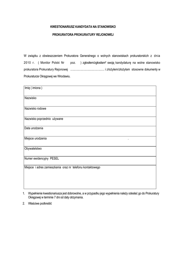 Kwestionariusz kandydata na stanowisko prokuratora prokuratury
