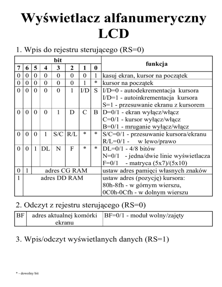 Wyświetlacz alfanumeryczny LCD 1. Wpis do rejestru sterującego (RS=0) bit 3 0 0 0 funkcja 0 1 kasuj ekran, kursor na początek * kursor na początek S I/D=0 - autodekrementacja kursora I/D=1 - autoinkrementacja kursora S=1 - przesuwanie ekranu z kursorem 0 0 0 0 1 D C B D=0/1 - ekran wyłącz/włącz C=0/1 - kursor wyłącz/włącz B=0/1 - mruganie wyłącz/włącz 0 0 0 1 S/C R/L * * S/C=0/1 - przesuwanie kursora/ekranu R/L=0/1 - w lewo/prawo 0 0 1 DL N F * * DL=0/1 - 4/8 bitów N=0/1 - jedna/dwie linie wyświetlacza F=0/1 - matryca (5x7)/(5x10) 0 1 adres CG RAM ustaw adres pamięci własnych znaków 1 adres DD RAM ustaw adres (pozycję) kursora: 80h-8fh - w górnym wierszu, 0C0h-0Cfh - w dolnym wierszu 7 0 0 0 6 0 0 0 5 0 0 0 4 0 0 0 2 1 0 0 0 1 1 I/D 2. Odczyt z rejestru sterującego (RS=0) BF adres aktualnej komórki ekranu BF=0/1 - moduł wolny/zajęty 3. Wpis/odczyt wyświetlanych danych (RS=1) * - dowolny bit