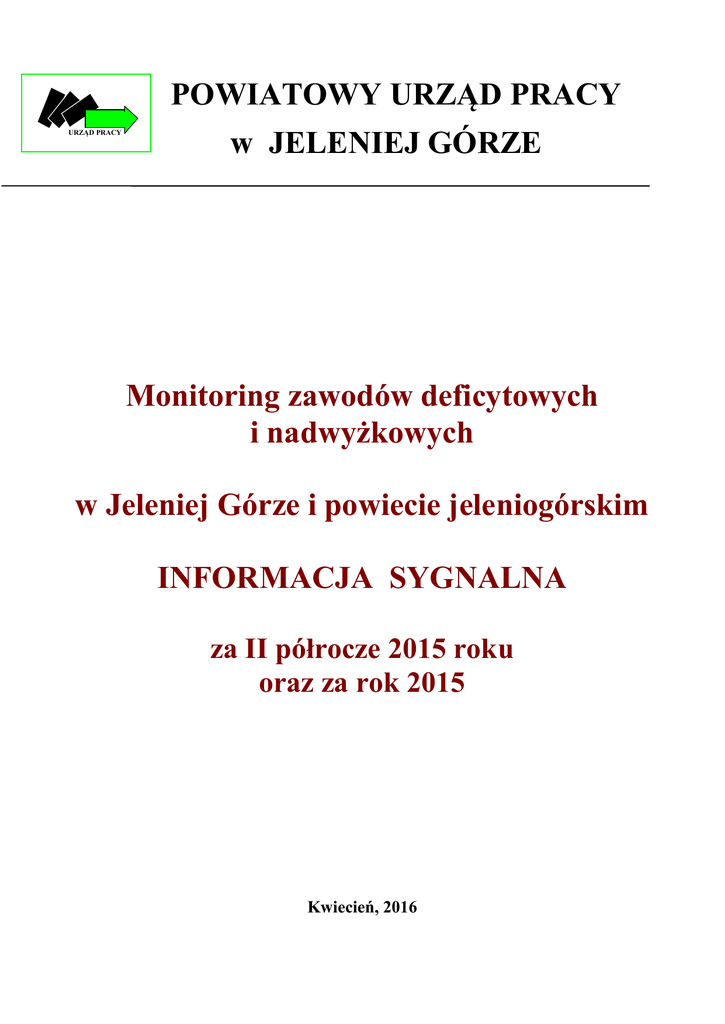 POWIATOWY URZĄD PRACY URZĄD PRACY w JELENIEJ GÓRZE Monitoring zawodów deficytowych i nadwyżkowych w Jeleniej Górze i powiecie jeleniogórskim INFORMACJA SYGNALNA za II półrocze 2015 roku oraz za rok 2015 Kwiecień, 2016 Wstęp Monitoring zawodów deficytowych i nadwyżkowych jest prowadzony przez wszystkie urzędy pracy od 2005 roku wg jednolitej metodologii opracowanej przez Ministerstwo Pracy i Polityki Społecznej. Prowadzenie monitoringu zawodów deficytowych i nadwyżkowych jest jednym z zadań samorządu powiatu w zakresie polityki rynku pracy. Od 2015 roku w ramach nowej metodologii monitoringu zawodów deficytowych i nadwyżkowych powstają 2 typy raportów opracowanych na poziomie powiatowym, wojewódzkim i krajowym: półroczne raporty sygnalne – ranking zawodów deficytowych i nadwyżkowych w oparciu o dane z Powiatowych Urzędów Pracy, raporty roczne – rozbudowane o analizę umiejętności i uprawnień, analizę i prognozę lokalnego rynku pracy oraz analizę rynku edukacyjnego. Ogólne założenia metodyczne prowadzenia i nadwyżkowych obejmują w szczególności*: cele monitoringu podstawowe pojęcia i definicje, wykorzystane źródła danych. monitoringu zawodów deficytowych Cele monitoringu: 1. określenie kierunków i natężenia zmian zachodzących w strukturze zawodowokwalifikacyjnej na powiatowym, wojewódzkim i krajowym rynku pracy, 2. stworzenie bazy informacyjnej dla przewidywania struktur zawodowo-kwalifikacyjnych w układzie lokalnym, wojewódzkim i krajowym, 3. określenie odpowiednich kierunków szkolenia bezrobotnych dla zapewnienia spójności z potrzebami rynku pracy, 4. korekta poziomu, struktury i treści kształcenia zawodowego na poziomie ponadgimnazjalnym i wyższym, 5. usprawnienie poradnictwa zawodowego poprzez wskazanie zawodów oraz kwalifikacji deficytowych i nadwyżkowych na lokalnym rynku pracy 6. ułatwienie realizacji programów specjalnych dla aktywizacji osób długotrwale bezrobotnych w celu promowania ich ponownego zatrudnienia. Podstawowe pojęcia i definicje: Monitoring zawodów deficytowych i nadwyżkowych – to proces systematycznego obserwowania zjawisk zachodzących na rynku pracy dotyczących kształtowania się popytu na pracę i podaży zasobów pracy w przekroju terytorialno – zawodowym oraz formułowania na tej podstawie ocen, wniosków oraz prognoz niezbędnych do prawidłowego funkcjonowania systemów: szkolenia bezrobotnych oraz kształcenia zawodowego. Zawody deficytowe – to takie, na które istnieje na rynku pracy wyższe zapotrzebowanie niż liczba bezrobotnych w danym zawodzie, liczba ofert pracy jest wyższa niż liczba bezrobotnych, odsetek długotrwale bezrobotnych jest nieznaczny, a odpływ bezrobotnych przewyższa ich napływ w danym okresie sprawozdawczym. Zawody zrównoważone – to takie, na które istnieje na rynku pracy zbliżone zapotrzebowanie do liczby bezrobotnych w danym zawodzie, liczba ofert pracy jest zbliżona do liczby bezrobotnych, odsetek długotrwale bezrobotnych jest nieznaczny, a odpływ bezrobotnych przewyższa ich napływ w danym okresie sprawozdawczym. Zawody nadwyżkowe – to takie, na które istnieje na rynku pracy niższe zapotrzebowanie niż liczba bezrobotnych w danym zawodzie, liczba ofert pracy jest niższa od liczby bezrobotnych, odsetek długotrwale bezrobotnych jest relatywnie wysoki, a napływ bezrobotnych przewyższa ich odpływ w danym okresie sprawozdawczym. Generowanie raportów na potrzeby opracowania monitoringu zawodów deficytowych i nadwyżkowych dla powiatów, województw oraz kraju odbywa się za pomocą Aplikacji Centralnej. Informacje sygnalne są dostępne do pobrania również w serwisie mz.praca.gov.pl. Urszula Filipczuk Dyrektor Powiatowego Urzędu Pracy w Jeleniej Górze ________________________________________________________________________ * Opracowanie nowych zaleceń metodycznych „Prowadzenie monitoringu zawodów deficytowych i nadwyżkowych na lokalnym rynku pracy” – Instytut Nauk Społeczno Ekonomicznych –Łódź 2012 ZAWODY DEFICYTOWE I NADWYŻKOWE w powiecie jeleniogórskim INFORMACJA SYGNALNA II PÓŁROCZE 2015 R. Sekcja Zaklasyfikowanie Grupa elementarna Kierownicy do spraw marketingu i sprzedaży Windykatorzy i pokrewni DEFICYT zawód maksymalnie deficytowy Robotnicy wykonujący prace proste w leśnictwie Kierownicy sprzedaży w marketach Programiści aplikacji Projektanci aplikacji sieciowych i multimediów Kierownicy w handlu detalicznym i hurtowym Specjaliści do spraw sprzedaży (z wyłączeniem technologii informacyjno-komunikacyjnych) zawód deficytowy Właściciele sklepów Posadzkarze, parkieciarze i glazurnicy RÓWNOWAGA Specjaliści do spraw zarządzania zasobami ludzkimi zawód zrównoważony Projektanci grafiki i multimediów Robotnicy wykonujący prace proste w budownictwie drogowym, wodnym i pokrewni Ślusarze i pokrewni Technicy elektrycy Robotnicy leśni i pokrewni zawód nadwyżkowy Masarze, robotnicy w przetwórstwie ryb i pokrewni Pracownicy opieki osobistej w ochronie zdrowia i pokrewni gdzie indziej niesklasyfikowani Tynkarze i pokrewni Cieśle i stolarze budowlani Pomoce kuchenne Średni personel do spraw statystyki i dziedzin pokrewnych NADWYŻKA Dietetycy i żywieniowcy Operatorzy maszyn i urządzeń do obróbki drewna Formowacze wyrobów szklanych, krajacze i szlifierze szkła Maszyniści i operatorzy maszyn i urządzeń dźwigowo-transportowych i pokrewni Operatorzy maszyn i urządzeń do produkcji wyrobów spożywczych i pokrewni zawód maksymalnie nadwyżkowy Operatorzy maszyn i urządzeń do produkcji i przetwórstwa metali Zamiatacze i pokrewni Ceramicy i pokrewni Plastycy, dekoratorzy wnętrz i pokrewni Gońcy, bagażowi i pokrewni Operatorzy maszyn i urządzeń do przeróbki mechanicznej kopalin Tapicerzy i pokrewni Robotnicy budowy dróg Robotnicy wykonujący prace proste w hodowli zwierząt *Monitoring zawodów deficytowych i nadwyżkowych został wykonany według nowej metodologii przygotowan