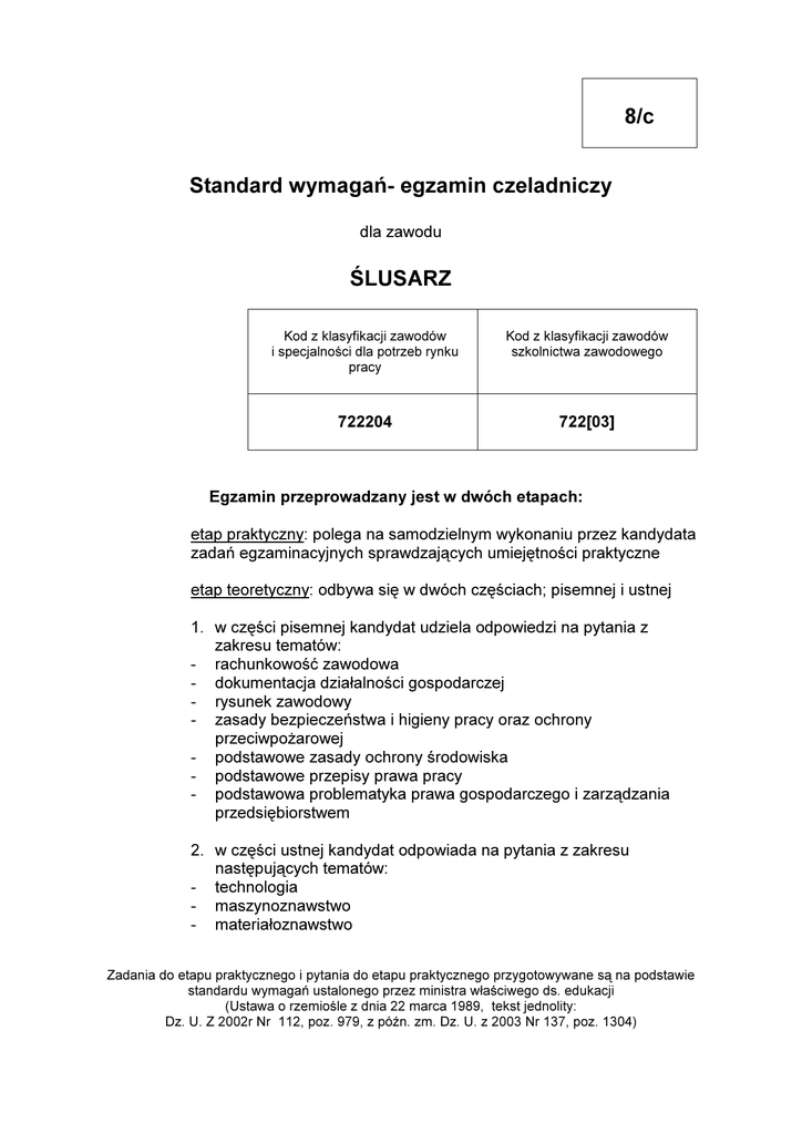 8/c Standard wymagań- egzamin czeladniczy ŚLUSARZ