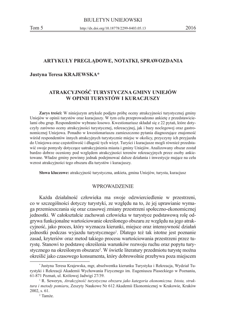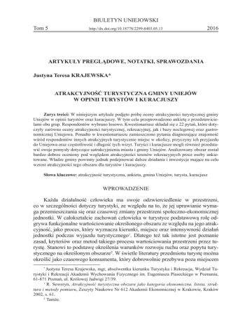 BIULETYN UNIEJOWSKI Tom 5 http://dx.doi.org/10.18778/2299-8403.05.13 2016 ARTYKUŁY PREGLĄDOWE, NOTATKI, SPRAWOZDANIA Justyna Teresa KRAJEWSKA* ATRAKCYJNOŚĆ TURYSTYCZNA GMINY UNIEJÓW W OPINII TURYSTÓW I KURACJUSZY Zarys treści: W niniejszym artykule podjęto próbę oceny atrakcyjności turystycznej gminy Uniejów w opinii turystów oraz kuracjuszy. W tym celu przeprowadzono ankietę z przedstawicielami obu grup. Respondentów wybrano losowo. Kwestionariusz składał się z 22 pytań, które dotyczyły zarówno oceny atrakcyjności turystycznej, rekreacyjnej, jak i bazy noclegowej oraz gastronomicznej Uniejowa. Ponadto w kwestionariuszu zamieszczono pytania diagnozujące znajomość wśród respondentów innych atrakcyjnych turystycznie miejsc w okolicy, przyczyny ich przyjazdu do Uniejowa oraz częstotliwość i długość tych wizyt. Turyści i kuracjusze mogli również przedstawić swoje pomysły dotyczące uatrakcyjnienia miasta i gminy Uniejów. Analizowany obszar został bardzo dobrze oceniony pod względem atrakcyjności terenów rekreacyjnych przez osoby ankietowane. Władze gminy powinny jednak podejmować dalsze działania i inwestycje mające na celu wzrost atrakcyjności tego obszaru dla turystów i kuracjuszy. Słowa kluczowe: atrakcyjność turystyczna, ankieta, gmina Uniejów, turysta, kuracjusz WPROWADZENIE Każda działalność człowieka ma swoje odzwierciedlenie w przestrzeni, co w szczególności dotyczy turystyki, ze względu na to, że jej uprawianie wymaga przemieszczania się oraz czasowej zmiany przestrzeni społeczno-ekonomicznej jednostki. W całokształcie zachowań człowieka w turystyce podstawową rolę odgrywa funkcjonalne wartościowanie określonego obszaru ze względu na jego atrakcyjność, jako proces, który wyznacza kierunki, miejsce oraz intensywność działań jednostki podczas wyjazdu turystycznego1. Dlatego też tak istotne jest poznanie zasad, kryteriów oraz metod takiego procesu wartościowania przestrzeni przez turystę. Stanowi to podstawę określenia warunków rozwoju ruchu oraz popytu turystycznego na określonym obszarze2. W świetle literatury przedmiotu turystę można określić jako czasowego konsumenta, który dobrowolnie przebywa poza miejscem * Justyna Teresa Krajewska, mgr, absolwentka kierunku Turystyka i Rekreacja, Wydział Turystyki i Rekreacji Akademii Wychowania Fizycznego im. Eugeniusza Piaseckiego w Poznaniu, 61-871 Poznań, ul. Królowej Jadwigi 27/39. 1 R. Seweryn, Atrakcyjność turystyczna obszaru jako kategoria ekonomiczna. Istota, struktura i metody pomiaru, Zeszyty Naukowe Nr 612 Akademii Ekonomicznej w Krakowie, Kraków 2002, s. 61. 2 Tamże. 194 Justyna Teresa Krajewska stałego zamieszkania w określonych celach turystycznych3. Turystyka oznacza natomiast ruch człowieka w czasie i przestrzeni w określonych celach, które uznaje się za turystyczne4. Atrakcyjność turystyczna jest pojęciem złożonym, dlatego też należy ją rozpatrywać kompleksowo. Oznacza stopień przyciągania przez dany region (miejscowość, kraj) określonego rodzaju turystyki i jest związana z liczbą występujących na jego obszarze obiektów oraz zjawisk, na które istnieje popyt danej formy ruchu turystycznego5. O atrakacyjności turystycznej decydują walory turystyczne, dostępność komunikacyjna oraz stan rozwoju infrastruktury turystycznej. Według J. Warszyńskiej i A. Jackowskiego (1978) na walory turystyczne danego obszaru składają się zarówno elementy środowiska przyrodniczego, jak i pozaprzyrodniczego, które są przedmiotem zainteresowania turystów6. Zatem walory turystyczne, obok dostępności komunikacyjnej oraz infrastruktury turystycznej, składają się na atrakcyjność turystyczną obszaru, miejscowości czy szlaku i w znacznym stopniu decydują o wielkości ruchu turystycznego na danym obszarze. Zatem atrakcyjność turystyczna to pojęcie szersze niż same walory turystyczne7. Charakterystyka Uniejowa pod kątem jego walorów przyrodniczych została opisana w pracach E. Kobojek (2012)8, K.M. Smętkiewicz, K.K. Smętkiewicz (2012)9, L. Kucharskiego, B. Chmieleckiego (2014)10 i M. Borowskiej-Stefańskiej (2014, 2015)11. Ponadto o Uniejowie jako miejscowości turystycznej oraz jego atrakcyjności turystycznej traktują pozycje: N. Kowalczyk i in. (2013)12, A. Jaśkiewicz (2015)13, A. Jończyk (2015)14. 3 R. Seweryn, Walory turystyczne – istota i funkcje. Próba klasyfikacji, Zeszyty Naukowe Nr 621 Akademii Ekonomicznej w Krakowie, Kraków 2003, s. 73. 4 S. Liszewski, Przestrzeń turystyczna Polski. Koncepcja regionalizacji turystycznej, „Folia Turistica” 2009, Nr 21, s. 18. 5 R. Seweryn, Atrakcyjność turystyczna obszaru jako kategoria ekonomiczna. Istota, struktura i metody pomiaru, Zeszyty Naukowe Nr 612 Akademii Ekonomicznej w Krakowie, Kraków 2002, s. 62. 6 Ł. Quirini-Popławski, Walory przyrodnicze i kulturowe jako podstawa atrakcyjności turystycznej Beskidów Wschodnich na obszarze obwodów Lwowskiego i Iwanofrankowskiego (Ukraina), „Prace Geograficzne”, z. 125, Kraków 2011, s. 129. 7 I. Potocka, Walory turystyczne, [w:] Z. Młynarczyk, A. Zajadacz (red.), Uwarunkowania i plany rozwoju turystyki, t. III, 2009, s. 9. 8 E. Kobojek, Położenie fizycznogeograficzne miasta i gminy Uniejów, „Biuletyn Uniejowski” 2012, t. 1, s. 9–22. 9 K.M. Smętkiewicz, K.K. Smętkiewicz, Walory przyrodnicze gminy Uniejów – formy ochrony przyrody, „Biuletyn Uniejowski” 2012, t. 1, s. 95–119. 10 L. Kucharski, B. Chmielecki, Dendroflora parku zamkowego w Uniejowie – stan obecny i zmiany, „Biuletyn Uniejowski” 2014, t. 3, s. 5–22. 11 M. Borowska-Stefańska, Ocena ryzyka powodziowego jako element wdrażania Dyrektywy Powodziowej – przykład Uniejowa, „Problemy Rozwoju Miast, Kwartalnik Naukowy Instytutu Rozwoju Miast” Rok XI, z. III/2014, s. 5–11; taż. Zagospodarowanie terenów zagrożonych powodziami w Uniejowie, „Biuletyn Uniejowski” 2015, t. 4, s. 131–142. 12 N. 