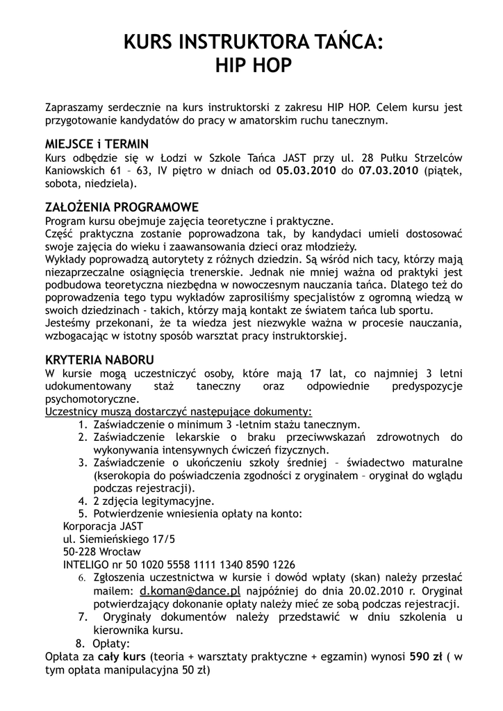 KURS INSTRUKTORA TAŃCA: HIP HOP Zapraszamy serdecznie na kurs instruktorski z zakresu HIP HOP. Celem kursu jest przygotowanie kandydatów do pracy w amatorskim ruchu tanecznym. MIEJSCE i TERMIN Kurs odbędzie się w Łodzi w Szkole Tańca JAST przy ul. 28 Pułku Strzelców Kaniowskich 61 – 63, IV piętro w dniach od 05.03.2010 do 07.03.2010 (piątek, sobota, niedziela). ZAŁOŻENIA PROGRAMOWE Program kursu obejmuje zajęcia teoretyczne i praktyczne. Część praktyczna zostanie poprowadzona tak, by kandydaci umieli dostosować swoje zajęcia do wieku i zaawansowania dzieci oraz młodzieży. Wykłady poprowadzą autorytety z różnych dziedzin. Są wśród nich tacy, którzy mają niezaprzeczalne osiągnięcia trenerskie. Jednak nie mniej ważna od praktyki jest podbudowa teoretyczna niezbędna w nowoczesnym nauczania tańca. Dlatego też do poprowadzenia tego typu wykładów zaprosiliśmy specjalistów z ogromną wiedzą w swoich dziedzinach - takich, którzy mają kontakt ze światem tańca lub sportu. Jesteśmy przekonani, że ta wiedza jest niezwykle ważna w procesie nauczania, wzbogacając w istotny sposób warsztat pracy instruktorskiej. KRYTERIA NABORU W kursie mogą uczestniczyć osoby, które mają 17 lat, co najmniej 3 letni udokumentowany staż taneczny oraz odpowiednie predyspozycje psychomotoryczne. Uczestnicy muszą dostarczyć następujące dokumenty: 1. Zaświadczenie o minimum 3 -letnim stażu tanecznym. 2. Zaświadczenie lekarskie o braku przeciwwskazań zdrowotnych do wykonywania intensywnych ćwiczeń fizycznych. 3. Zaświadczenie o ukończeniu szkoły średniej – świadectwo maturalne (kserokopia do poświadczenia zgodności z oryginałem – oryginał do wglądu podczas rejestracji). 4. 2 zdjęcia legitymacyjne. 5. Potwierdzenie wniesienia opłaty na konto: Korporacja JAST ul. Siemieńskiego 17/5 50-228 Wrocław INTELIGO nr 50 1020 5558 1111 1340 8590 1226 6. Zgłoszenia uczestnictwa w kursie i dowód wpłaty (skan) należy przesłać mailem: [email protected] najpóźniej do dnia 20.02.2010 r. Oryginał potwierdzający dokonanie opłaty należy mieć ze sobą podczas rejestracji. 7. Oryginały dokumentów należy przedstawić w dniu szkolenia u kierownika kursu. 8. Opłaty: Opłata za cały kurs (teoria + warsztaty praktyczne + egzamin) wynosi 590 zł ( w tym opłata manipulacyjna 50 zł) Instruktorzy, którzy chcą wziąć udział tylko w zajęciach praktycznych – koszt 290,00;-zł (w tym oplata manipulacyjna w wysokości 50 zł). Instruktorzy, którzy ukończyli wcześniej nasz kurs z inną specjalizacją są zwolnieni z egzaminu teoretycznego. W tym wypadku cena kursu wynosi 390,00;- zł (w tym opłata manipulacyjna w wysokości 50 zł) (zajęcia praktyczne + egzamin praktyczny). Udział w zajęciach teoretycznych – nieodpłatny. Instruktorzy, którzy ukończyli wcześniej nasz kurs i biorą udział wyłącznie w szkoleniu praktycznym - koszt 240,00;-zł (w tym oplata manipulacyjna w wysokości 50 zł). 9. Członkowie Polskiego Towarzystwa Tanecznego i Polskiej Federacji Tańca uzyskują 5% zniżkę. UWAGA: 1. Nie łączy się zniżek. 2. W przypadkach losowych można wycofać się ze szkolenia. Opłata manipulacyjna nie podlega zwrotowi. W przypadku wycofania się ze szkolenia na dwa dni, jeden dzień przed szkoleniem oraz w dniu szkolenia opłaty nie podlegają zwrotowi. 5. Ponieważ liczba miejsc na szkoleniu jest ograniczona potwierdzamy udział w szkoleniu e-mailem. POSTANOWIENIA KOŃCOWE Warunkiem uzyskania Instruktora HIP HOP lub Młodszego Instruktora HIP HOP (osoby niepełnoletnie / niemające pełnego wykształcenia średniego) jest pozytywne zaliczenie egzaminu teoretycznego i praktycznego. Dyplom uzyskuje się na podstawie: 1. Rozporządzenia Ministra Edukacji Narodowej oraz Ministra Pracy i Polityki Socjalnej z dnia 12 października 1993 r. w sprawie zasad i warunków podnoszenia kwalifikacji zawodowych i wykształcenia ogólnego dorosłych i uprawniają do prowadzenia zajęć w amatorskim ruchu tanecznym. 2. Wpisu do rejestru instytucji szkoleniowych wydanego przez Dolnośląski Wojewódzki Urząd Pracy pod nr ewidencyjnym 2.02/00038/2005. 3. Wpisu do ewidencji działalności gospodarczej wydanej przez Prezydenta Wrocławia pod nr 153292/T. 4. Wpis do ewidencji placówek oświatowych nr 215/95. BAZA NOCLEGOWA i WYŻYWIENIE Wyżywienie można zamówić u kierownika kursu w dniu szkolenia – catering. Noclegi w cenach promocyjnych (duże zniżki) – osobna informacja o noclegach w Hotelu Mazowieckim (około 50 m od Szkoły Tańca JAST w Łodzi) u kierownika kursu. WSZELKIE INFORMACJE TELEFONÓW: MOŻNA UZYSKAĆ POD NUMERAMI tel. kom. 603 477 699 Pn – Pt 14.00 – 21.00 tel. stacjonarny: 042 636 61 24 Pn – Pt 18.00 – 21.00 u pani Doroty Koman– kierownika kursu SERDECZNIE ZAPRASZAMY WARSZTATY DOSKONALENIA ZAWODOWEGO PRZEZNACZONE SĄ WYŁĄCZNIE DLA INSTRUKTORÓW, TRENERÓW, NAUCZYCIELI TAŃCA I KANDYDATÓW NA INSTRUKTORA TAŃCA. KARTA ZGŁOSZENIA NA KURS HIP HOP 1) Imiona i nazwisko: 2) Miejsce i data urodzenia: 3) Adres zamieszkania z kodem: Województwo: 4) Tel. kontaktowy: 5) Adres e-mail: 6) Wykształcenie: 7) Rok ukończenia szkoły: 8) Seria i nr dowodu osobistego*: *Seria i nr innego dowodu tożsamości – jeżeli nie posiada się dowodu osobistego 9) Przynależność organizacyjna: