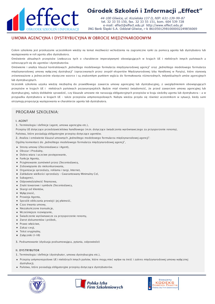 UMOWA AGENCYJNA I DYSTRYBUCYJNA W OBROCIE MIĘDZYNARODOWYM Celem szkolenia jest przekazanie uczestnikom wiedzy na temat możliwości wchodzenia na zagraniczne rynki za pomocą agenta lub dystrybutora lub występowania w roli agenta albo dystrybutora. Omówienie aktualnych przepisów (zwłaszcza tych o charakterze imperatywnym) obowiązujących w krajach UE i niektórych innych państwach a odnoszących się do agentów i dystrybutorów. Omówienie i analiza klauzul kontraktowych Jednolitego modelowego formularza międzynarodowej agencji oraz Jednolitego modelowego formularza międzynarodowej umowy wyłącznej dystrybucji (opracowanych przez zespół ekspertów Międzynarodowej Izby Handlowej w Paryżu), które stanowią zrównoważone a jednocześnie elastyczne wzorce i są znakomitym punktem wyjścia do formułowania różnorodnych, indywidualnych umów agencyjnych lub dystrybucyjnych. Uczestnik szkolenia uzyska wiedzę niezbędną do prawidłowego zawarcia umowy agencyjnej lub dystrybucyjnej, z uwzględnieniem obowiązujących przepisów w krajach UE i niektórych państwach pozaeuropejskich. Będzie miał również świadomość, że przed zawarciem umowy agencyjnej lub dystrybucyjnej, należy dokładnie sprawdzić, czy klauzule umowne nie naruszają obligatoryjnych przepisów w kraju siedziby agenta lub dystrybutora a w przypadku dystrybutora w krajach UE także przepisów antymonopolowych. Nabyta wiedza przyda się również uczestnikom w sytuacji, kiedy sami otrzymają propozycję występowania w charakterze agenta lub dystrybutora. PROGRAM SZKOLENIA: I. AG EN T 1 . Terminologia i definicje (agent, umowa agencyjna etc.), Przepisy UE dotyczące przedstawicielstwa handlowego (m.in. dotyczące świadczenia wyrównawczego za przysporzenie renomy), Państwa, które posiadają obligatoryjne przepisy dotyczące agentów. 2. Analiza i omówienie klauzul umownych Jednolitego modelowego formularza międzynarodowej agencji: Ogólny komentarz do Jednolitego modelowego formularza międzynarodowej agencji, Strony umowy (Zleceniodawca i Agent), Obszar i Produkty, Dobra wiara i uczciwe postępowanie, Funkcje Agenta, Przyjmowanie zamówień przez Zleceniodawcę, Zobowiązanie do niekonkurowania, Organizacja sprzedaży, reklama i targi, Internet, Zakładane wielkości sprzedaży Gwarantowany Minimalny Cel, Subagenci, Odpowiedzialność finansowa, Znaki towarowe i symbole Zleceniodawcy, Skargi od klientów, Wyłączność, Prowizja Agenta, Sposób obliczania prowizji i jej płatność, Czas trwania umowy, Niezakończone transakcje, Wcześniejsze rozwiązanie, Świadczenie wyrównawcze za przysporzenie renomy, Zwrot dokumentów i próbek, Prawo właściwe, Zakaz cesji, Tekst oryginalny, Załączniki (I-VII) 3. Podsumowanie (dyskusja podsumowująca, pytania, odpowiedzi) II. DYS TRYBUTO R 1 . Terminologia i definicje (dystrybutor, umowa dystrybucyjna etc.), Przepisy antymonopolowe UE i niektórych innych państw, które mogą mieć wpływ na treść i zakres międzynarodowej umowy wyłącznej dystrybucji, Państwa, które posiadają obligatoryjne przepisy dotyczące dystrybutorów. 2. Analiza i omówienie klauzul umownych Jednolitego modelowego formularza międzynarodowej umowy wyłącznej dystrybucji: Ogólny komentarz do Jednolitego modelowego formularza międzynarodowej umowy wyłącznej dystrybucji, Strony umowy (Dostawca i Dystrybutor), Obszar i Produkty, Dobra wiara i uczciwe postępowanie, Funkcje Dystrybutora, Zobowiązanie do niekonkurowania, Organizacja sprzedaży, reklama i targi, Warunki dostawy - ceny, Zakładane wielkości sprzedaży Gwarantowany Minimalny Cel, Poddystrybutorzy lub agenci, Ceny odsprzedaży, Sprzedaże poza Obszar, Znaki towarowe i symbole Zleceniodawcy, Poufna informacja, Zapas Produktów i części zamiennych serwis posprzedażny, Wyłączna dystrybucja, Bezpośrednie sprzedaże, Czas trwania umowy, Niezakończone transakcje, Wcześniejsze rozwiązanie, Świadczenie wyrównawcze za przysporzenie renomy, Zwrot dokumentów i Produktów na składzie, Rozstrzyganie sporów, Prawo właściwe, Tekst oryginalny, Załączniki (I-XI) 3. Podsumowanie (dyskusja podsumowująca, pytania, odpowiedzi). METODY PROWADZENIA WARSZTATÓW Szkolenie będzie prowadzone systemem interaktywnym, tj. metodą aktywnego uczestnictwa słuchaczy w zajęciach. Zagadnienia poruszane podczas szkolenia wzbogacone będą przykładami rozwiązań zaczerpniętych z bogatej praktyki zawodowej wykładowcy, analiza case'ów uczestników. SZKOLENIE ADRESOWANE JEST DO: menedżerów i specjalistów działów importu i eksportu, dyrektorów i handlowców zajmujących się obsługą transakcji handlowych z krajami trzecimi, specjalistów działów zakupów i logistyki odpowiedzialnych za transakcje międzynarodowe, specjalistów ds. celnych, głównych księgowych, dyrektorów i właścicieli firm handlujących z podmiotami zagranicznymi. WYKŁADOWCĄ NA SZKOLENIU BĘDZIE: Ja ro sła w He rma no wski członek Polskiego Narodowego Komitetu Międzynarodowej Izby Handlowej oraz niezależny konsultant, trener i wykładowca - praktyk. Jest jedynym w Polsce trenerem Incoterms 2010 certyfikowanym przez Międzynarodową Izbę Handlową w Paryżu. Specjalista w dziedzinie umów kupna-sprzedaży w handlu zagranicznym, autor wielu publikacji poświęconych tych zagadnieniom, m.in. oficjalnego tłumaczenia reguł Incoterms 2000. Je g o d o tyc hc za so wy d o ro b e k to książki i p ub lika c je z za kre su ha nd lu za g ra nic zne g o : Poradnik samodzielnego importera" Przedstawicielstwo, agent, komisant, dystrybutor w obrocie międzynarodowym" Poradnik importera" Handel Zagraniczny" Konwencja NZ o umowach międzynarodowej sprzedaży towarów. Komentarz" Umowy sprzedaży i dostawy w obrocie międzynarodowym" Incoterms 2000" (polski przekład) Incoterms 2000 Komentarz" Umowa Modelowa MIH międzynarodowej sprzedaży" (tłumaczenie) Umowa modelowa MIH międzynarodowej agencji handlowej" (tłumaczenie) Umowa modelowa MIH międz