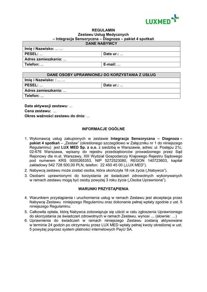 REGULAMIN Zestawu Usług Medycznych – Integracja Sensoryczna – Diagnoza – pakiet 4 spotkań DANE NABYWCY Imię i Nazwisko: ... ... PESEL: ... Data ur.: ... Adres zamieszkania: ... Telefon: ... E-mail: ... DANE OSOBY UPRAWNIONEJ DO KORZYSTANIA Z USŁUG Imię i Nazwisko: : ... ... PESEL: ... Data ur.: ... Adres zamieszkania: ... Telefon: ... Data aktywacji zestawu: ... Cena zestawu: ... Okres ważności zestawu do dnia: ... INFORMACJE OGÓLNE 1. Wykonawcą usług zakupionych w zestawie Integracja Sensoryczna – Diagnoza – pakiet 4 spotkań – „Zestaw” (określonego szczegółowo w Załączniku nr 1 do niniejszego Regulaminu) jest LUX MED Sp. z o.o. z siedzibą w Warszawie, adres: ul. Postępu 21c, 02-676 Warszawa, wpisany do rejestru przedsiębiorców prowadzonego przez Sąd Rejonowy dla m.st. Warszawy, XIII Wydział Gospodarczy Krajowego Rejestru Sądowego pod numerem KRS 0000265353, NIP 5272523080, REGON 140723603, kapitał zakładowy 542 728 500,00 PLN, telefon: 22 450 45 00 („LUX MED”). 2. Nabywcą zestawu może zostać osoba, która ukończyła 18 rok życia („Nabywca”). 3. Osobami uprawnionymi do korzystania ze świadczeń zdrowotnych wykonywanych w ramach zestawu mogą być osoby powyżej 3 roku życia („Osoba Uprawniona”). WARUNKI PRZYSTĄPIENIA 4. Warunkiem przystąpienia i uruchomienia usług w ramach Zestawu jest akceptacja przez Nabywcę Zestawu niniejszego Regulaminu oraz dokonanie pełnej wpłaty zgodnie z ust. 5 niniejszego Regulaminu. 5. Całkowita opłata, którą Nabywca zobowiązuje się uiścić w celu zgłoszenia Uprawnionego do skorzystania ze świadczeń zdrowotnych w ramach Zestawu, wynosi … (słownie: …) 6. Uprawnienia do świadczeń w ramach niniejszego Zestawu zostaną aktywowane w terminie 24 godzin po otrzymaniu przez LUX MED wpłaty pełnej kwoty określonej w ust. 5 powyżej poprzez system płatności internetowych PayU SA. ODSTĄPIENIE I REZYGNACJA Z ZESTAWU 7. W ciągu 14 dni od dnia zaakceptowania niniejszego Regulaminu, Nabywca może odstąpić od Umowy o udzielanie świadczeń zdrowotnych na podstawie niniejszego Regulaminu bez podania przyczyny, składając LUX MED oświadczenie na piśmie według wzoru stanowiącego Załącznik nr 2 do niniejszego Regulaminu i przesyłając je na adres: [email protected]. 8. Prawo odstąpienia od umowy zawartej na odległość nie przysługuje Nabywcy w przypadku wykonania przez LUX MED usług w ramach Zestawu na rzecz Osoby Uprawnionej. 9. Nabywca ma obowiązek zapłaty za świadczenia spełnione przez LUX MED do chwili odstąpienia od umowy, jeżeli Nabywca odstąpi od Umowy po zgłoszeniu LUX MED przez Osobę Uprawnioną żądania wykonania usług w ramach Zestawu przed upływem 14 dni od zawarcia Umowy. WARUNKI REALIZACJI ZESTAWU 10. Zestaw usług Integracja Sensoryczna – Diagnoza – pakiet 4 spotkań przeznaczony jest dla osób (dzieci) powyżej 3 roku życia, które dotychczas nie miały kontaktu z zajęciami Integracji Sensorycznej i nie były dotąd diagnozowane. Podczas 4 spotkań dostępnych w ramach zestawu zostanie postawiona i omówiona diagnoza wykluczająca bądź potwierdzająca zaburzenia wynikające z poszczególnych układów i zmysłów oraz w razie wskazań medycznych przedstawiony harmonogram dalszej terapii w ramach zajęć Integracji Sensorycznej. Czas każdego spotkania wynosi 40 minut. 11. Harmonogram spotkań w ramach Zestawu: Spotkanie pierwsze – w spotkaniu biorą udział rodzice/rodzic bez dziecka, ma ono na celu przeprowadzenie specjalistycznego wywiadu z rodzicem, mającego na celu uzyskanie niezbędnych informacji z zakresu historii medycznej dziecka, rozwoju w okresie niemowlęcym, aktualnych umiejętności z zakresu motoryki dużej i małej oraz weryfikację obaw/podejrzeń rodzica/opiekuna, będących przyczyną wykupienia zestawu Spotkanie drugie i trzecie – w spotkaniu bierze udział dziecko BEZ rodzica , ma ono na celu ocenę aktywności motorycznej dziecka w oparciu o przeprowadzone wystandaryzowane testy pozwalające zweryfikować poziom procesów integracji zmysłów Spotkanie czwarte – sugerowany termin – w okresie maksymalnie 2 tygodni od ostatniego spotkania, w spotkaniu biorą udział rodzice/rodzic, ma ono na celu omówienie diagnozy i propozycji pracy z dzieckiem w domu oraz po zweryfikowaniu potrzeb i problemów – ustalenie harmonogramu systematycznych zajęć Integracji Sensorycznej jeśli jest wskazanie medyczne. 12. Usługi w ramach Zestawu można zrealizować w ciągu 3 miesięcy od dnia aktywowania uprawnień, o którym mowa w ust. 6 powyżej. 13. Udzielanie świadczeń zdrowotnych w ramach Zestawu odbywa się w dedykowanej placówce Grupy LUXMED w Warszawie przy ul. Wołoskiej 7 w godzinach pracy placówki. 14. Warunkiem udzielenia świadczenia zdrowotnego w ramach Zestawu jest uprzednie uzgodnienie jego terminu z LUX MED. Termin udzielenia świadczenia uzgodnić należy z personelem odpowiedniej recepcji LUX MED osobiście lub telefonicznie pod numerem 22 434 48 48. OŚWIADCZENIE NABYWCY 1. Nabywca oświadcza, że poinformował Osobę Uprawnioną o: 1. adresie siedziby i pełnej nazwie LUX MED Sp. z o.o. jako administratora danych tej Osoby przekazanych przez Nabywcę; 2. celu i zakresie zbierania przez LUX MED Sp. z o.o. danych, o których mowa w pkt 1) powyżej; 3. źródle danych, o których mowa w pkt 1 powyżej; 4. prawie dostępu Osoby Uprawnionej do treści swoich danych przetwarzanych przez LUX MED Sp. z o.o. jako administratora danych oraz prawie do ich poprawiania; 5. uprawnieniach wynikających z art. 32 ust. 1 pkt 7 i 8 Ustawy z dnia 2 sierpnia 1997 r. o ochronie danych osobowych („Ustawa”) tj. a) wniesienia, w przypadkach wymienionych w art. 23 ust. 1 pkt 4 i 5 Ustawy, pisemnego, umotywowanego żądania zaprzestania przetwarzania jej danych ze względu na jej szczególną sytuację, b) wniesienia sprzeciwu wobec przetwarzania jej danych w przypadkach, wymienionych w art. 23 ust. 1 pkt 4 i 5 Ustawy, gdy ad