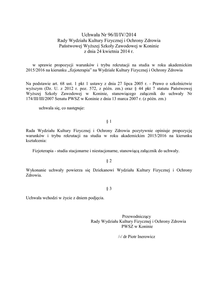 Uchwała Nr 96/II/IV/2014 Rady Wydziału Kultury Fizycznej i Ochrony Zdrowia Państwowej Wyższej Szkoły Zawodowej w Koninie z dnia 24 kwietnia 2014 r. w sprawie propozycji warunków i trybu rekrutacji na studia w roku akademickim 2015/2016 na kierunku „fizjoterapia” na Wydziale Kultury Fizycznej i Ochrony Zdrowia Na podstawie art. 68 ust. 1 pkt 1 ustawy z dnia 27 lipca 2005 r. - Prawo o szkolnictwie wyższym (Dz. U. z 2012 r. poz. 572, z późn. zm.) oraz § 44 pkt 7 statutu Państwowej Wyższej Szkoły Zawodowej w Koninie, stanowiącego załącznik do uchwały Nr 174/III/III/2007 Senatu PWSZ w Koninie z dnia 13 marca 2007 r. (z późn. zm.) uchwala się, co następuje: §1 Rada Wydziału Kultury Fizycznej i Ochrony Zdrowia pozytywnie opiniuje propozycję warunków i trybu rekrutacji na studia w roku akademickim 2015/2016 na kierunku kształcenia: Fizjoterapia - studia stacjonarne i niestacjonarne, stanowiącą załącznik do uchwały. §2 Wykonanie uchwały powierza się Dziekanowi Wydziału Kultury Fizycznej i Ochrony Zdrowia. §3 Uchwała wchodzi w życie z dniem podjęcia. Przewodniczący Rady Wydziału Kultury Fizycznej i Ochrony Zdrowia PWSZ w Koninie /-/ dr Piotr Inerowicz