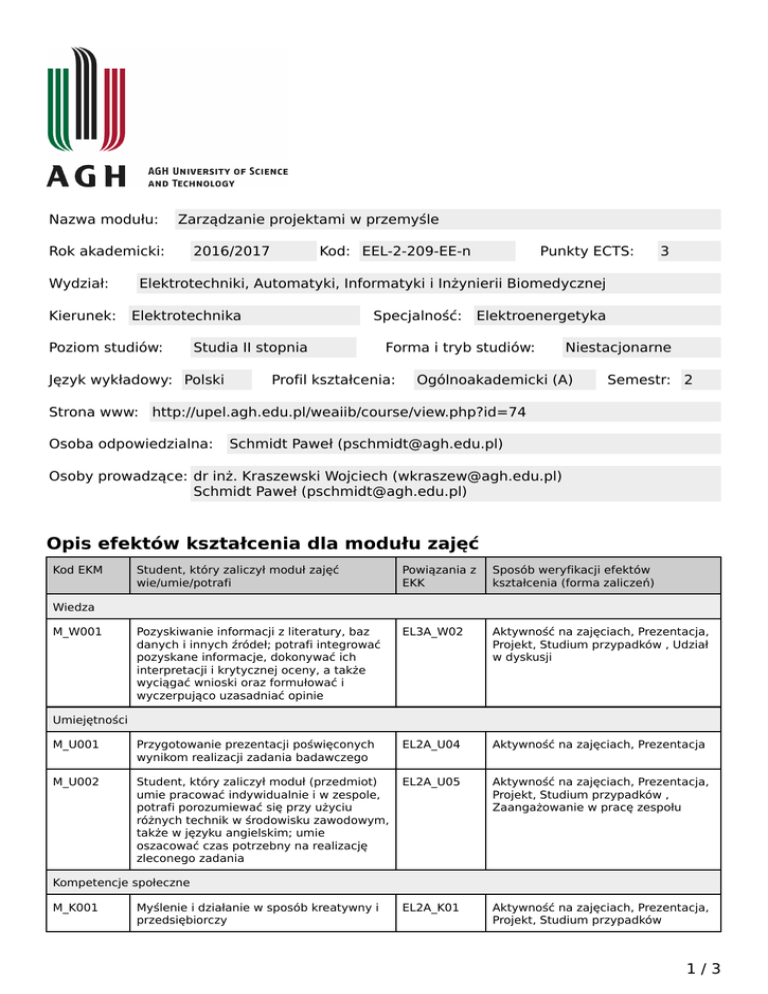 Nazwa modułu: Zarządzanie projektami w przemyśle Rok akademicki: Wydział: Kierunek: 2016/2017 Kod: EEL-2-209-EE-n Punkty ECTS: 3 Elektrotechniki, Automatyki, Informatyki i Inżynierii Biomedycznej Elektrotechnika Poziom studiów: Specjalność: Studia II stopnia Język wykładowy: Polski Elektroenergetyka Forma i tryb studiów: Profil kształcenia: Niestacjonarne Ogólnoakademicki (A) Semestr: 2 Strona www: http://upel.agh.edu.pl/weaiib/course/view.php?id=74 Osoba odpowiedzialna: Schmidt Paweł ([email protected]) Osoby prowadzące: dr inż. Kraszewski Wojciech ([email protected]) Schmidt Paweł ([email protected]) Opis efektów kształcenia dla modułu zajęć Kod EKM Student, który zaliczył moduł zajęć wie/umie/potrafi Powiązania z EKK Sposób weryfikacji efektów kształcenia (forma zaliczeń) Pozyskiwanie informacji z literatury, baz danych i innych źródeł; potrafi integrować pozyskane informacje, dokonywać ich interpretacji i krytycznej oceny, a także wyciągać wnioski oraz formułować i wyczerpująco uzasadniać opinie EL3A_W02 Aktywność na zajęciach, Prezentacja, Projekt, Studium przypadków , Udział w dyskusji M_U001 Przygotowanie prezentacji poświęconych wynikom realizacji zadania badawczego EL2A_U04 Aktywność na zajęciach, Prezentacja M_U002 Student, który zaliczył moduł (przedmiot) umie pracować indywidualnie i w zespole, potrafi porozumiewać się przy użyciu różnych technik w środowisku zawodowym, także w języku angielskim; umie oszacować czas potrzebny na realizację zleconego zadania EL2A_U05 Aktywność na zajęciach, Prezentacja, Projekt, Studium przypadków , Zaangażowanie w pracę zespołu EL2A_K01 Aktywność na zajęciach, Prezentacja, Projekt, Studium przypadków Wiedza M_W001 Umiejętności Kompetencje społeczne M_K001 Myślenie i działanie w sposób kreatywny i przedsiębiorczy 1/3 Karta modułu - Zarządzanie projektami w przemyśle Matryca efektów kształcenia w odniesieniu do form zajęć Konwersatori um Zajęcia seminaryjne Zajęcia praktyczne Zajęcia terenowe Zajęcia warsztatowe + - + - - - - - - - - M_U001 Przygotowanie prezentacji poświęconych wynikom realizacji zadania badawczego + - + - - - - - - - - M_U002 Student, który zaliczył moduł (przedmiot) umie pracować indywidualnie i w zespole, potrafi porozumiewać się przy użyciu różnych technik w środowisku zawodowym, także w języku angielskim; umie oszacować czas potrzebny na realizację zleconego zadania + - + - - - - - - - - + - + - - - - - - - - E-learning Ćwiczenia projektowe Pozyskiwanie informacji z literatury, baz danych i innych źródeł; potrafi integrować pozyskane informacje, dokonywać ich interpretacji i krytycznej oceny, a także wyciągać wnioski oraz formułować i wyczerpująco uzasadniać opinie Inne Ćwiczenia laboratoryjne Forma zajęć Ćwiczenia audytoryjne Student, który zaliczył moduł zajęć wie/umie/potrafi Wykład Kod EKM Wiedza M_W001 Umiejętności Kompetencje społeczne M_K001 Myślenie i działanie w sposób kreatywny i przedsiębiorczy Treść modułu zajęć (program wykładów i pozostałych zajęć) Wykład Wykład Wykład obejmuje zagadnienia związane z metodykami i technikami zarządzania projektami ze szczególnym uwzględnieniem projektów przemysłowych oraz badawczorozwojowych, rekomendowanymi przez organizację International Project Managemen Association. W zakres wykładu wchodzą: podstawy zarządzania projektami, cykl życia projektu, podstawy metodyk PMBoK®, PCM oraz PRINCE2®, techniki planowania działań i zasobów (WBS, diagram sieciowy, ścieżka krytyczna, analiza PERT), zarządzanie zakresem, zarządzanie ryzykiem, zarządzanie zmianą, zarządzanie komunikacją, elementy analizy biznesowej (symbolika ICOM oraz BPMN), elementy metodyk „zwinnych” (Agile), podstawy rachunkowości zarządczej, techniki monitorowania projektu. Ćwiczenia laboratoryjne 2/3 Karta modułu - Zarządzanie projektami w przemyśle Ćwiczenia laboratoryjne Laboratorium prowadzone w formie interaktywnych warsztatów (praca grupowa) oraz indywidualnych ćwiczeń przy wykorzystaniu oprogramowania komputerowego wspierającego zarządzanie projektami i analizę biznesową, obejmujące: praktyczne sesje analizy i planowania projektu, monitorowanie projektu, modelowanie procesów biznesowych, podstawy rachunkowości zarządczej. Oprogramowanie komputerowe: Microsoft Project, Microsoft Excel, Microsoft Visio Sposób obliczania oceny końcowej Ocena pracy końcowej zawierającej analizę studium przypadku w zakresie materiału omawianego na wykładzie i ćwiczeniach Wymagania wstępne i dodatkowe Nie podano wymagań wstępnych lub dodatkowych. Zalecana literatura i pomoce naukowe [1] PRINCE2® – Skuteczne Zarządzanie Projektami, TSO, 2009, Wydanie polskie II 2010 [2] DeMarco T., Zdążyć przed terminem – opowieść o zarządzaniu projektami, Studio Emka, Warszawa 2002 [3] Goldratt E. M., Łańcuch krytyczny, Wydawnictwo Werbel, 2000 [4] Pritchard C.L., Zarządzanie ryzykiem w projektach. Teoria i praktyka, IG-Press, Warszawa 2002 [5] Project Management Institute, PMBOK Guide Fourth Edition – Kompendium wiedzy o zarządzaniu projektami, MT&DC, 2009 [6] Wysocki R., McGary K., Efektywne zarządzanie projektami, OnePress, 2005 Oprogramowanie: - Microsoft Project - Microsoft Excel - Microsoft Visio Publikacje naukowe osób prowadzących zajęcia związane z tematyką modułu Nie podano dodatkowych publikacji Informacje dodatkowe Brak Nakład pracy studenta (bilans punktów ECTS) Forma aktywności studenta Obciążenie studenta Udział w wykładach 30 godz Udział w ćwiczeniach audytoryjnych 30 godz Przygotowanie sprawozdania, pracy pisemnej, prezentacji, itp. 30 godz Przygotowanie do zajęć 10 godz Sumaryczne obciążenie pracą studenta 100 godz Punkty ECTS za moduł 3 ECTS 3/3