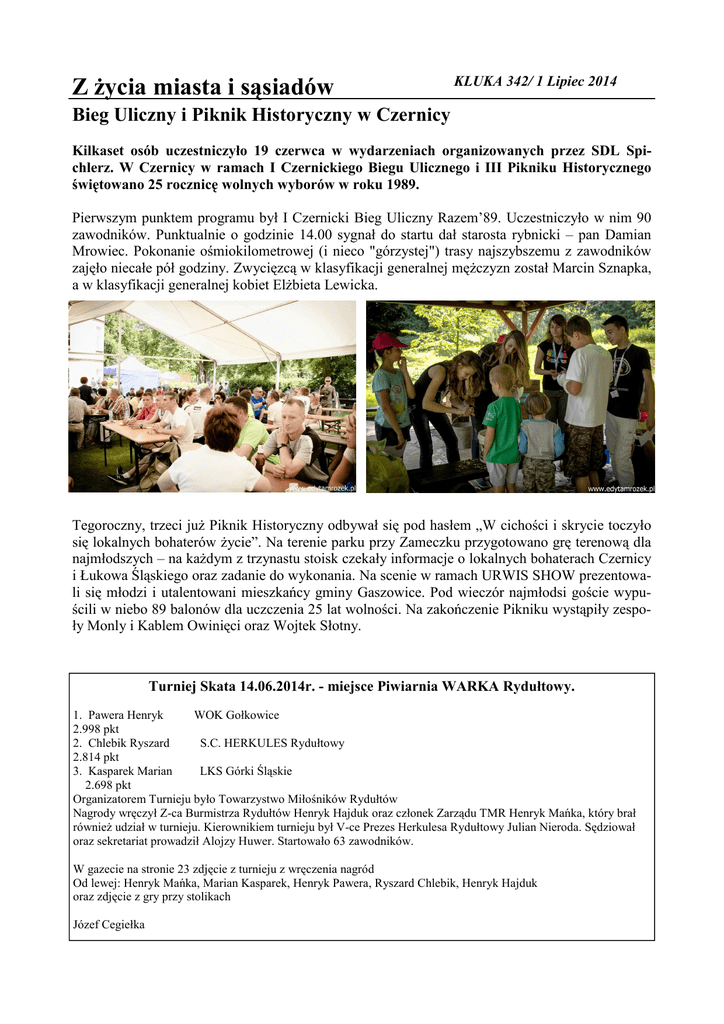 Z Ŝycia miasta i sąsiadów KLUKA 342/ 1 Lipiec 2014 Bieg Uliczny i Piknik Historyczny w Czernicy Kilkaset osób uczestniczyło 19 czerwca w wydarzeniach organizowanych przez SDL Spichlerz. W Czernicy w ramach I Czernickiego Biegu Ulicznego i III Pikniku Historycznego świętowano 25 rocznicę wolnych wyborów w roku 1989. Pierwszym punktem programu był I Czernicki Bieg Uliczny Razem’89. Uczestniczyło w nim 90 zawodników. Punktualnie o godzinie 14.00 sygnał do startu dał starosta rybnicki – pan Damian Mrowiec. Pokonanie ośmiokilometrowej (i nieco "górzystej") trasy najszybszemu z zawodników zajęło niecałe pół godziny. Zwycięzcą w klasyfikacji generalnej męŜczyzn został Marcin Sznapka, a w klasyfikacji generalnej kobiet ElŜbieta Lewicka. Tegoroczny, trzeci juŜ Piknik Historyczny odbywał się pod hasłem „W cichości i skrycie toczyło się lokalnych bohaterów Ŝycie”. Na terenie parku przy Zameczku przygotowano grę terenową dla najmłodszych – na kaŜdym z trzynastu stoisk czekały informacje o lokalnych bohaterach Czernicy i Łukowa Śląskiego oraz zadanie do wykonania. Na scenie w ramach URWIS SHOW prezentowali się młodzi i utalentowani mieszkańcy gminy Gaszowice. Pod wieczór najmłodsi goście wypuścili w niebo 89 balonów dla uczczenia 25 lat wolności. Na zakończenie Pikniku wystąpiły zespoły Monly i Kablem Owinięci oraz Wojtek Słotny. Turniej Skata 14.06.2014r. - miejsce Piwiarnia WARKA Rydułtowy. 1. Pawera Henryk WOK Gołkowice 2.998 pkt 2. Chlebik Ryszard S.C. HERKULES Rydułtowy 2.814 pkt 3. Kasparek Marian LKS Górki Śląskie 2.698 pkt Organizatorem Turnieju było Towarzystwo Miłośników Rydułtów Nagrody wręczył Z-ca Burmistrza Rydułtów Henryk Hajduk oraz członek Zarządu TMR Henryk Mańka, który brał równieŜ udział w turnieju. Kierownikiem turnieju był V-ce Prezes Herkulesa Rydułtowy Julian Nieroda. Sędziował oraz sekretariat prowadził Alojzy Huwer. Startowało 63 zawodników. W gazecie na stronie 23 zdjęcie z turnieju z wręczenia nagród Od lewej: Henryk Mańka, Marian Kasparek, Henryk Pawera, Ryszard Chlebik, Henryk Hajduk oraz zdjęcie z gry przy stolikach Józef Cegiełka Kandydaci na Rydułtowika roku KLUKA 341/1 Czerwiec 2014 Stefan DroŜdŜok Urodziłem się 20.03.1966 r. w Rydułtowach. Jestem absolwentem Wydziału PedagogicznoArtystycznego Uniwersytetu Śląskiego w Katowicach. Swoją karierę zawodową rozpoczynałem w Szkołach Podstawowych w Nędzy i Babicach, jako nauczyciel muzyki i wychowania fizycznego. W roku 2000 rozpocząłem pracę w Gimnazjum nrl w Rydułtowach, w charakterze nauczyciel muzyki i wychowania fizycznego a niedługo potem w Ognisku Pracy Pozaszkolnej. Od początku mojej kariery zawodowej swoje zainteresowania i umiejętności muzyczne starałem się przekazać młodzieŜy, nie tylko, jako nauczyciel, ale teŜ, jako instruktor młodzieŜowych zespołów muzycznych. Z pod mojej ręki wyszło wielu utalentowanych muzyków-instrumentalistów jak i wokalistek. Poprzez wszystkie te lata pracy zawodowej prowadziłem wiele zespołów rockowych, instrumentalno-wokalnych, wokalnych, chórów, które godnie reprezentowały nasze miasto na skalę międzynarodową, wojewódzką i powiatową. Obecnie bazując na wychowankach Gimnazjum nrl jak i Ogniska Pracy Pozaszkolnej prowadzę cztery zespoły muzyczne. Tylko w tym roku zespoły te reprezentując Rydułtowy zdobyły laury na konkursach i festiwalach np: · „Vacuum" l miejsce na Wojewódzkim Festiwalu piosenki MłodzieŜowej w Knurowie. · „ Turbulencja" l miejsce na tym samym festiwalu w kategorii zespoły wokalne. · „ Biało Czarni" l miejsce na Wojewódzkim Przeglądzie Kolęd i Pastorałek w Chorzowie. · „ Turbulencja" l miejsce na Rydułtowskim Przeglądzie zespołów Folklorystycznych „ Witej wiosno roztomiło" · „ Turbulencja" l wyróŜnienie na Festiwalu Muzyki MłodzieŜowej w Czerwionce - Leszczynach. , To tylko niewielka część działalności tych grup muzycznych zasługuje na uwagę fakt, iŜ zespoły te systematycznie współpracują z rydułtowskimi instytucjami takimi jak: Urząd Miasta, Urząd Stanu Cywilnego, Towarzystwo Miłośników Rydułtów, ZHP, rydułtowskie szkoły dając koncerty i uświetniając imprezy miejskie, środowiskowe. Chciałbym poprzez swoją działalność kulturalno-muzyczną jeszcze przez wiele lat rozsławiać dobre imię naszego Miasta. Zgłoszenia kandydata dokonali mieszkańcy Rydułtów. (zgłoszenie w TMR) Joanna Rusok Urodziłam się 7 lutego 1956 roku w Rydułtowach, jestem Ślązaczką z urodzenia i ducha. Szkołę podstawową i liceum ukończyłam równieŜ w Rydułtowach. W latach 1972 – 1975 prowadziłam Ŝeńską druŜynę harcerską działającą przy Szkole Podstawowej nr 1. Studiowałam na Uniwersytecie Śląskim w Katowicach na Wydziale Biologii i Ochrony Środowiska i ukończyłam na tym wydziale Biologię o specjalności nauczycielskiej. Przez 19 lat pracowałam w Szkole Podstawowej Nr 1, gdzie byłam nauczycielem biologii oraz wicedyrektorem a obecnie od 13 lat jestem dyrektorem Szkoły Podstawowej nr 3 w Rydułtowach. Szczególną uwagę zwracam na ochronę środowiska – wynika to z mojej profesji, ale równie duŜą na zachowanie tradycji śląskiej. Bardzo zaleŜy mi zachowaniu gwary śląskiej, na kultywowaniu tradycji śląskich, przypomnienie dawnych zwyczajów, teraz zanikających. Uczniowie mojej szkoły na uroczystościach miejskich i szkolnych występują w strojach będących kopią strojów noszonych na naszym terenie 100 lat temu. Staram się propagować strój śląski, zamiast chętnie stosowanego „stroju cepeliowskiego” Współpracujemy z Kołem Gospodyń Wiejskich, korzystamy z ich doświadczeń i wspomnień. W projektach realizowanych w naszej szkole skupiamy się na ochronie przyrody i kultywowaniu tradycji śląskich. SłuŜyła temu równieŜ współpraca z Polską Szkołą w Orłowej. Bliskie kontakty ze Ślązakami zza Olzy bardzo