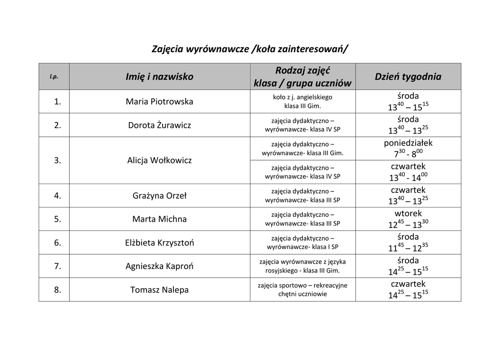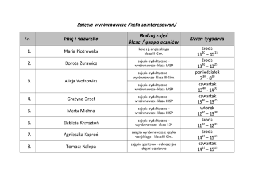 Zajęcia wyrównawcze /koła zainteresowao/ Imię i nazwisko Rodzaj zajęć klasa / grupa uczniów 1. Maria Piotrowska koło z j. angielskiego klasa III Gim. 2. Dorota Żurawicz zajęcia dydaktyczno – wyrównawcze- klasa IV SP l.p. zajęcia dydaktyczno – wyrównawcze- klasa III Gim. 3. Alicja Wołkowicz 4. Grażyna Orzeł zajęcia dydaktyczno – wyrównawcze- klasa III SP 5. Marta Michna zajęcia dydaktyczno – wyrównawcze- klasa III SP 6. Elżbieta Krzysztoo zajęcia dydaktyczno – wyrównawcze- klasa I SP 7. Agnieszka Kaproo zajęcia wyrównawcze z języka rosyjskiego - klasa III Gim. 8. Tomasz Nalepa zajęcia sportowo – rekreacyjne chętni uczniowie zajęcia dydaktyczno – wyrównawcze- klasa IV SP Dzieo tygodnia środa 13 – 1515 środa 1340 – 1325 poniedziałek 730 - 800 czwartek 1340 - 1400 czwartek 1340 – 1325 wtorek 1245 – 1330 środa 1145 – 1235 środa 1425 – 1515 czwartek 1425 – 1515 40 9. Ewa Kamioska-Rząd zajęcia wyrównawcze z biologii klasa III Gim. 10. Jolanta Zbiżek zajęcia wyrównawcze z języka polskiego - klasa III Gim. 11. Grzegorz Ciupak koło z wiedzy o społeczeostwie - Klasa III Gim. 12. Dorota Rząd zajęcia wyrównawcze z geografii - klasa III Gim. 13. Jolanta Gajór koło matematyczne – klasa II Gim. 14. Monika Brzozowska zajęcia dydaktyczno – wyrównawcze - klasa III Gim. 15. Sylwester Zarzeczny zajęcia dydaktyczno – wyrównawcze 16. Jarosław Wielgus zajęcia dydaktyczno – wyrównawcze – klasa IV wtorek 1430 – 1515 piątek 1430 – 1515 wtorek 730 – 800 poniedziałek 1340 – 1425 czwartek 1340 – 1425 piątek 1135 – 1150 Poniedziałek 1340 – 1425 Poniedziałek 735 – 755