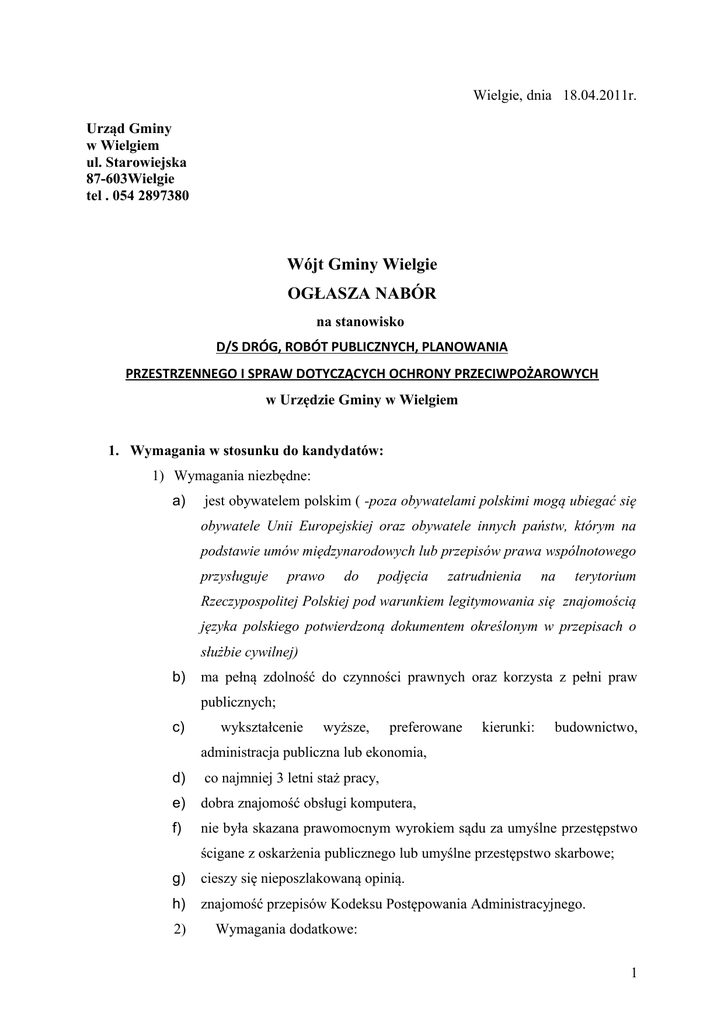 Wielgie, dnia 18.04.2011r. Urząd Gminy w Wielgiem ul. Starowiejska 87-603Wielgie tel . 054 2897380 Wójt Gminy Wielgie OGŁASZA NABÓR na stanowisko D/S DRÓG, ROBÓT PUBLICZNYCH, PLANOWANIA PRZESTRZENNEGO I SPRAW DOTYCZĄCYCH OCHRONY PRZECIWPOŻAROWYCH w Urzędzie Gminy w Wielgiem 1. Wymagania w stosunku do kandydatów: 1) Wymagania niezbędne: a) jest obywatelem polskim ( -poza obywatelami polskimi mogą ubiegać się obywatele Unii Europejskiej oraz obywatele innych państw, którym na podstawie umów międzynarodowych lub przepisów prawa wspólnotowego przysługuje prawo do podjęcia zatrudnienia na terytorium Rzeczypospolitej Polskiej pod warunkiem legitymowania się znajomością języka polskiego potwierdzoną dokumentem określonym w przepisach o służbie cywilnej) b) ma pełną zdolność do czynności prawnych oraz korzysta z pełni praw publicznych; c) wykształcenie wyższe, preferowane kierunki: budownictwo, administracja publiczna lub ekonomia, d) co najmniej 3 letni staż pracy, e) dobra znajomość obsługi komputera, f) nie była skazana prawomocnym wyrokiem sądu za umyślne przestępstwo ścigane z oskarżenia publicznego lub umyślne przestępstwo skarbowe; g) cieszy się nieposzlakowaną opinią. h) znajomość przepisów Kodeksu Postępowania Administracyjnego. 2) Wymagania dodatkowe: 1 a) umiejętność sprawnej i efektywnej organizacji pracy, b) komunikatywność, c) operatywność 2. Zakres zadań wykonywanych na stanowisku 1) Zakres zadań 1) planowanie zadań dotyczących realizacji budowy, modernizacji i utrzymania dróg gmin nych nawierzchni utwardzonej i nieutwardzonej, placów, chodników, parkingów (po zwolenia na zajęcie pasa drogowego i uzgodnienia projektu), 2) zabezpieczenie techniczne wykonawstwa remontu dróg gminnych w ramach posiadanych środków finansowych. 3) zarządzanie drogami gminnymi, 4) wydawanie zezwoleń na wycinkę drzew z pasa drogowego. 5) utrzymanie dróg w okresie gołoledzi i zaśnieżenia. 6) utrzymanie czystości na drogach. 7) wydawanie zezwoleń i naliczanie opłat za umieszczenie urządzeń w pasie drogowym dróg gminnych oraz podejmowania działań mających na celu ustalanie i egzekucję ww. opłat nieuiszczonych w trybie określonym w przepisach o postępowaniu egzekucyjnym w ad ministracji” 8) określanie szczegółowego korzystania z dróg w tym wykorzystywanie pasów drogowych na cele niekomunikacyjne, 9) współpraca z zarządem dróg wojewódzkich, powiatowych w zakresie dotyczącym utrzy mania i modernizacji dróg i chodników na odcinkach przebiegających przez teren gminy, 10) organizacja ruchu drogowego na drogach gminnych oraz prowadzenie spraw z zakresu porządku i bezpieczeństwa na drogach, 11) wydawanie pozwoleń na umieszczanie reklam w pasie dróg gminnych, 12) prowadzenie całokształtu spraw związanych z ochroną zabytków na terenie gminy. 13) prowadzenie całokształtu spraw związanych z wykonaniem remontów i napraw w gminnych zasobach mieszkaniowych, nadzór nad pracami remontowymi, zakup materiałów - sporządzenie rozliczenia zgodnie z ustawą o zamówieniach publicznych (Ustawa z dnia 29 stycznia 2004 r. – Prawo zamówień publicznych Dz.U. z 2007r. , Nr 223, poz. 1655 – z późn. zmian.) 14) wytwarzanie i przekazywanie informacji z zakresu pracy wydziału do BIP i strony interne towej urzędu, 15) wykonywanie innych zadań wynikających z przepisów szczególnych. 16) przygotowanie i skompletowanie dokumentacji technicznej oraz pozostałej dokumentacji do prowadzenia inwestycji i remontów do momentu wydania pozwolenia na budowę lub remont. 17) prowadzenie nadzoru budowlanego i inwestycyjnego w zakresie dotyczącym zadań inwe stycyjnych prowadzonych przez urząd, 18) organizowanie, koordynowanie i prowadzenie robót publicznych na terenie gminy, w tym prac finansowanych lub współfinansowanych przez powiatowy urząd pracy, 19) prowadzenie dokumentacji oraz nadzór nad osobami skazanymi przez sąd do pracy dozorowanej na cele publiczne. 20) nadzór nad przystankami PKS i szkolnymi (zakup, utrzymanie w czystości, konserwacja). 2 21) organizowanie i koordynacja prac związanych z opracowywaniem miejscowego planu za gospodarowania przestrzennego, przyjmowanie wniosków do planu, badanie spójności rozwiązań planu ze studium , wyłożenie planu do publicznego wglądu oraz podejmowa nie innych czynności wynikających z ustawy o zagospodarowaniu przestrzennym, 22) dokonywanie oceny zmian w zagospodarowaniu przestrzennym gminy, 23) prowadzenie aktualizowanego rejestru miejscowych planów zagospodarowania prze strzennego, 24) prowadzenie postępowania w sprawie wydania decyzji o warunkach zabudowy i decyzji o ustaleniu lokalizacji inwestycji celu publicznego oraz prowadzenie ewidencji tych decyzji, 25) stwierdzenie wygaśnięcia decyzji o warunkach zabudowy i zagospodarowania terenu w przypadku, gdy inny wnioskodawca uzyskał pozwolenie na budowę albo decyzja wydana została niezgodnie z planem, 26) wydawanie zaświadczeń oraz wypisów i wyrysów z miejscowego planu zagospodarowa nia przestrzennego, 27) przygotowywanie projektów postanowień opiniujących zgodność proponowanych po działów nieruchomości z ustaleniami miejscowego planu zagospodarowania przestrzen nego oraz prowadzenie rejestru wydanych postanowień, 28) przygotowanie wniosków o zmianę przeznaczenia gruntów rolnych i leśnych na cele nie rolnicze i nieleśne w czasie procedury sporządzania miejscowego planu zagospodarowa nia przestrzennego, 29) udział w opracowaniu programów i planów rozwoju gminy, projektów budżetów, spra wozdań oraz współudział w konstruowaniu wniosków do programów unijnych, 30) prowadzenie spraw związanych z ustaleniem nazw miejscowości, ulic i obiektów fizjogra ficznych oraz numeracji nieruchomości, 31) wykonywanie innych zadań doraźnych zleconych przez Wójta i Sekretarza Gminy. 32) przygotowywanie przetargów łącznie z ich prowadzeniem. 33) zakup drobnych materiałów