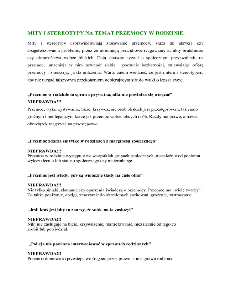 MITY I STEREOTYPY NA TEMAT PRZEMOCY W RODZINIE Mity i stereotypy usprawiedliwiają stosowanie przemocy, służą do ukrycia czy zbagatelizowania problemu, przez co utrudniają prawidłowe reagowanie na akty brutalności czy okrucieństwa wobec bliskich. Dają sprawcy sygnał o społecznym przyzwoleniu na przemoc, umacniają w nim pewność siebie i poczucie bezkarności, zniewalając ofiarę przemocy i zmuszając ja do milczenia. Warto zatem wiedzieć, co jest mitem i stereotypem, aby nie ulegać fałszywym przekonaniom odbierającym siłę do walki o lepsze życie: „Przemoc w rodzinie to sprawa prywatna, nikt nie powinien się wtrącać” NIEPRAWDA!!! Przemoc, wykorzystywanie, bicie, krzywdzenie osób bliskich jest przestępstwem, tak samo groźnym i podlegającym karze jak przemoc wobec obcych osób. Każdy ma prawo, a nawet obowiązek reagować na przestępstwo. „Przemoc zdarza się tylko w rodzinach z marginesu społecznego” NIEPRAWDA!!! Przemoc w rodzinie występuje we wszystkich grupach społecznych, niezależnie od poziomu wykształcenia lub statusu społecznego czy materialnego. „Przemoc jest wtedy, gdy są widoczne ślady na ciele ofiar” NIEPRAWDA!!! Nie tylko siniaki, złamania czy oparzenia świadczą o przemocy. Przemoc ma „wiele twarzy”. To także poniżanie, obelgi, zmuszanie do określonych zachowań, grożenie, zastraszanie. „Jeśli ktoś jest bity to znaczy, że sobie na to zasłużył” NIEPRAWDA!!! Nikt nie zasługuje na bicie, krzywdzenie, maltretowanie, niezależnie od tego co zrobił lub powiedział. „Policja nie powinna interweniować w sprawach rodzinnych” NIEPRAWDA!!! Przemoc domowa to przestępstwo ścigane przez prawo, a nie sprawa rodzinna. „Ofiary przemocy w rodzinie akceptują przemoc” NIEPRAWDA!!! Ofiary przemocy w rodzinie nie chcą być źle traktowane przez swoich bliskich. Starają się bronić siebie i innych zagrożonych przemocą członków rodziny. Chcą przerwać przemoc, ale pozostawiając w osamotnieniu, często nie potrafią tego zrobić. „To był jednorazowy incydent, który nigdy się nie powtórzy” NIEPRAWDA!!! Przemoc domowa niemal nigdy nie jest wyjątkowym, pojedynczym wydarzeniem. Przemoc ma tendencję do powtarzania się. Nie zatrzymana eskaluje i przybiera na sile. Nie wolno czekać i łudzić się, że sama się skończy. Przemoc nigdy sama nie mija – trzeba stanowczo powiedzieć NIE i podjąć konsekwentne działania by wyjść z przemocy. „Gdyby ofiara naprawdę cierpiała, odeszłaby od sprawcy” NIEPRAWDA!!! Nikt nie lubi być poniżanym i bitym. Tkwienie w związku pełnym krzywdzenia wynika między innymi z wyznawania tradycyjnych wartości takich jak miłość, trwałość małżeństwa, mylnego przeświadczenia, że sprawca jest doby dla dzieci, gdyż ich nie bije, przekonania o zależności ekonomicznej od sprawcy i niemożności samodzielnego funkcjonowania, wiary, w obietnice sprawcy, że się zmieni, nieracjonalnego obwiniania się za przemoc, czy też braku wiedzy na temat miejsca, gdzie osoba dotknięta przemocą może znaleźć bezpieczne schronienie i specjalistyczną pomoc. „Przyczyną przemocy w rodzinie jest alkohol” NIEPRAWDA!!! Nawet uzależnienie od alkoholu nie zwalnia od odpowiedzialności za działania dokonywane pod jego wpływem. Alkohol może nasilać przemoc i ułatwia jej stosowanie. Stanem nietrzeźwości sprawcy próbują usprawiedliwić fakt znęcania się nad członkami rodziny. „Gwałt w małżeństwie nie istnieje” NIEPRAWDA!!! Małżeństwo nie zmienia definicji gwałtu. Gwałt polega na zmuszeniu innej osoby do poddania się czynowi nierządnemu lub do wykonania takiego czynu. „Osoby używające przemocy muszą być chore psychicznie” NIEPRAWDA!!! Przemoc jest dążeniem do przejęcia pełniej władzy i kontroli nad innymi osobami. Nie ma żadnych danych wskazujących na istnienie bezpośredniego związku pomiędzy przemocą a chorobą psychiczną. „Nie ujawnia się tajemnic rodzinnych” NIEPRAWDA!!! Przemoc jest poważnym problemem, który niszczy nie tylko osobę, która jej doświadcza, ale również innych członków rodziny narażonych na uczestniczenie w aktach przemocy. Nie można ukrywać przemocy i pozostawać biernym. Takie zachowanie na pewno nie uzdrowi rodziny. Należy chronić przed przemocą siebie i swoich bliskich. Ujawnienie problemu i zwrócenie się po specjalistyczną pomoc nie ma nic wspólnego z ujawnianiem tajemnic rodzinnych. Przemoc domowa nie może być tajemnicą. Nie ma innej drogi do wyjścia z przemocy, niż ujawnienie jej i przeciwdziałanie. „Nie można zmienić swego przeznaczenia” NIEPRAWDA!!! Przemoc w rodzinie nie jest nikomu przeznaczona. Doznawanie przemocy przez lata nie oznacza, że tak musi być i, że trzeba się z tym pogodzić. Wręcz przeciwnie, przemocy trzeba się przeciwstawić. Nigdy nie jest za późno, aby przerwać milczenie i zwrócić się po pomoc.
