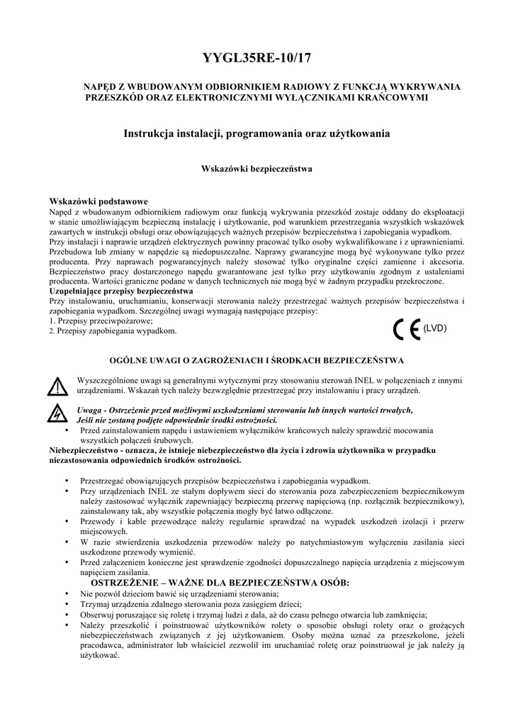 YYGL35RE-10/17 NAPĘD Z WBUDOWANYM ODBIORNIKIEM RADIOWY Z FUNKCJĄ WYKRYWANIA PRZESZKÓD ORAZ ELEKTRONICZNYMI WYŁĄCZNIKAMI KRAŃCOWYMI Instrukcja instalacji, programowania oraz użytkowania Wskazówki bezpieczeństwa Wskazówki podstawowe Napęd z wbudowanym odbiornikiem radiowym oraz funkcją wykrywania przeszkód zostaje oddany do eksploatacji w stanie umożliwiającym bezpieczną instalację i użytkowanie, pod warunkiem przestrzegania wszystkich wskazówek zawartych w instrukcji obsługi oraz obowiązujących ważnych przepisów bezpieczeństwa i zapobiegania wypadkom. Przy instalacji i naprawie urządzeń elektrycznych powinny pracować tylko osoby wykwalifikowane i z uprawnieniami. Przebudowa lub zmiany w napędzie są niedopuszczalne. Naprawy gwarancyjne mogą być wykonywane tylko przez producenta. Przy naprawach pogwarancyjnych należy stosować tylko oryginalne części zamienne i akcesoria. Bezpieczeństwo pracy dostarczonego napędu gwarantowane jest tylko przy użytkowaniu zgodnym z ustaleniami producenta. Wartości graniczne podane w danych technicznych nie mogą być w żadnym przypadku przekroczone. Uzupełniające przepisy bezpieczeństwa Przy instalowaniu, uruchamianiu, konserwacji sterowania należy przestrzegać ważnych przepisów bezpieczeństwa i zapobiegania wypadkom. Szczególnej uwagi wymagają następujące przepisy: 1. Przepisy przeciwpożarowe; 2. Przepisy zapobiegania wypadkom. OGÓLNE UWAGI O ZAGROŻENIACH I ŚRODKACH BEZPIECZEŃSTWA Wyszczególnione uwagi są generalnymi wytycznymi przy stosowaniu sterowań INEL w połączeniach z innymi urządzeniami. Wskazań tych należy bezwzględnie przestrzegać przy instalowaniu i pracy urządzeń. Uwaga - Ostrzeżenie przed możliwymi uszkodzeniami sterowania lub innych wartości trwałych, Jeśli nie zostaną podjęte odpowiednie środki ostrożności. • Przed zainstalowaniem napędu i ustawieniem wyłączników krańcowych należy sprawdzić mocowania wszystkich połączeń śrubowych. Niebezpieczeństwo - oznacza, że istnieje niebezpieczeństwo dla życia i zdrowia użytkownika w przypadku niezastosowania odpowiednich środków ostrożności. • • • • • Przestrzegać obowiązujących przepisów bezpieczeństwa i zapobiegania wypadkom. Przy urządzeniach INEL ze stałym dopływem sieci do sterowania poza zabezpieczeniem bezpiecznikowym należy zastosować wyłącznik zapewniający bezpieczną przerwę napięciową (np. rozłącznik bezpiecznikowy), zainstalowany tak, aby wszystkie połączenia mogły być łatwo odłączone. Przewody i kable przewodzące należy regularnie sprawdzać na wypadek uszkodzeń izolacji i przerw miejscowych. W razie stwierdzenia uszkodzenia przewodów należy po natychmiastowym wyłączeniu zasilania sieci uszkodzone przewody wymienić. Przed załączeniem konieczne jest sprawdzenie zgodności dopuszczalnego napięcia urządzenia z miejscowym napięciem zasilania. OSTRZEŻENIE – WAŻNE DLA BEZPIECZEŃSTWA OSÓB: • • • • Nie pozwól dzieciom bawić się urządzeniami sterowania; Trzymaj urządzenia zdalnego sterowania poza zasięgiem dzieci; Obserwuj poruszające się roletę i trzymaj ludzi z dala, aż do czasu pełnego otwarcia lub zamknięcia; Należy przeszkolić i poinstruować użytkowników rolety o sposobie obsługi rolety oraz o grożących niebezpieczeństwach związanych z jej użytkowaniem. Osoby można uznać za przeszkolone, jeżeli pracodawca, administrator lub właściciel zezwolił im uruchamiać roletę oraz poinstruował je jak należy ją użytkować. Instrukcja montażu YYGL35RE-10/17 Zasady bezpieczeństwa: Instalacja napędu musi być wykonana wyłącznie przez osoby posiadające odpowiednie uprawnienia. 1. Masa rolety nie może być większa niż udźwig napędu określony w tabeli doboru. 2. Odpowiedni sposób ułożenia kabla dodatkowo zabezpiecza napęd przed ewentualnymi szkodami wyrządzonymi przez wodę. 3. Nie dziurawić silnika na całej jego długości. 4. Chronić silnik przed kontaktem z jakimkolwiek płynem. 5. Unikać zgniecenia, uderzania w silnik i chronić silnik przed upadkiem. 6. Nie podłączać więcej niż jednego silnika do jednego wyłącznika oraz więcej niż jednego wyłącznika do jednego napędu. Montaż silnika • Przymocować uchwyt montażowy do boku rolety (A), połączyć adapter z pierścieniem napędowym silnika (C/D). • Umieścić specjalny zabierak na osi silnika i zabezpieczyć go zawleczką (E/F) i wsunąć cały silnik do rury nawojowej (G). • Połączyć rurę nawojową oraz zabierak napędu wkrętami lub nitami (H). UWAGA! Silnik jest wyposażony w wewnętrzny wyłącznik termiczny, który umożliwia ciągłą pracę przez około 4min. Po tym czasie temperatura wewnątrz silnika przekracza wartość dopuszczalną, co powoduje odcięcie zasilania. Ponowny ruch rolety możliwy jest po ostygnięciu silnika (trwa to od kilku do kilkunastu minut). Zastosowanie tego wyłącznika zwiększa wydatnie trwałość napędu. Podłączenie elektryczne. Wszelkie podłączenia przeprowadzać tylko przy odłączonym napięciu zasilania. • Żółto/ zielony ( PE ochronny) • Niebieski ( N neutralny) • Brązowy ( L1 faza) • Czarny (włącznik ręczny) • Szary (włącznik ręczny) Włącznik ręczny jednoklawiszowy monostabilny. W momencie naciśnięcia zwiera przewód czarny z szarym. Włącznik ręczny działa po ustawieniu krańcówek. ZŁY MONTAŻ POWODUJE NIEKONTROLOWANE ZATRZYMANIA SILNIKA. Do prawidłowego działania układu wykrywania przeszkód niezbędne jest: 1. Swobodne przesuwanie się pancerza w prowadnicach oraz skrzynce pod własnym ciężarem; ruch ten nie może być zaburzony (np. ociepleniem skrzynki roletowej styropianem, moskitierą zintegrowaną ze skrzynką itp.) 2. Dociążenie listwy dolnej (np. bednarką) 3. Połączenie przeciwległych boków zabieraka z rurą nawojową za pomocą dwóch wkrętów/nitów, Nie wymaga stosowania wieszaków-blokad oraz stoperów lub kątowej listw