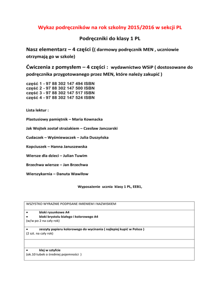 Wykaz podręczników na rok szkolny 2015/2016 w sekcji PL Podręczniki do klasy 1 PL Nasz elementarz – 4 części (( darmowy podręcznik MEN , uczniowie otrzymają go w szkole) Ćwiczenia z pomysłem – 4 części : wydawnictwo WSiP ( dostosowane do podręcznika przygotowanego przez MEN, które należy zakupić ) część 1 - 97 88 302 147 494 ISBN część 2 - 97 88 302 147 500 ISBN część 3 - 97 88 302 147 517 ISBN część 4 - 97 88 302 147 524 ISBN Lista lektur : Plastusiowy pamiętnik – Maria Kownacka Jak Wojtek został strażakiem – Czesław Janczarski Cudaczek – Wyśmiewaczek – Julia Duszyńska Kopciuszek – Hanna Januszewska Wiersze dla dzieci – Julian Tuwim Brzechwa wiersze – Jan Brzechwa Wierszykarnia – Danuta Wawiłow Wyposażenie ucznia klasy 1 PL, EEB1, WSZYSTKO WYRAZNIE PODPISANE IMIENIEM I NAZWISKIEM bloki rysunkowe A4 bloki brystolu białego i kolorowego A4 (w/w po 2 na cały rok) zeszyty papieru kolorowego do wycinania ( najlepiej kupić w Polsce ) (2 szt. na cały rok) klej w sztyfcie (ok.10 tubek o średniej pojemności ) zestaw kolorowych kredek ołówkowych (lepiej, jeśli są o szerokim obwodzie, codziennie sprawdzane i w miarę potrzeby temperowane w domu) kredki świecowe (najlepiej, żeby nie miały papierków zabezpieczających) zestaw 3 pędzli do malowania (gruby, średni i cienki; wyraźne różnice w grubości) zapas ołówków miękkich lub średnich HB (10) (zwykłych nie automatycznych! lepiej, jeśli grubsze w obwodzie) gumka ołówkowa lub/i do kredek ( najlepiej zrobić zapas kilku ) dużo !!!!! temperówka plastelina, ale nie modelina!!! ( 2 pudelka ) patyczki do liczenia !!! liczydło !!! NOŻYCZKI szkolne (proszę wybrać odpowiednie narzędzie do codziennej pracy dziecka; unikać atrapy nożyczek) Zeszyty w cienką linię czerwono niebieską 5 sztuk i cienkie w kratkę 5 sztuk Teczka A4 w miarę sztywna i nieprzemakalna typu „na gumce” ( 5 sztuk ) białe koperty A6 (ok. 5 szt.) tornister ( niezbyt wielki i niezbyt ciężki, ze sztywnymi „plecami”) worek na strój sportowy ( strój będzie do kupienia w szkole po rozpoczęciu roku szkolnego, poza tenisówkami; strój w worku będzie zostawiany w szkole ) mały plecak (na szkolne wycieczki jednodniowe) plastikowy pojemnik na drugie śniadanie Ponadto gromadzimy w domu materiały do późniejszego wykorzystania typu: wata, skrawki materiałów-tkanin o różnej fakturze, czyste pudełka papierowe i plastikowe np. po herbatach, kosmetykach, jogurtach, itp., korki plastikowe i naturalne. Klasa I "Żyjemy w Bożym świecie" Podręcznik do nauki religii Autor/Autorzy: D. Kurpiński, J. Snopek. Red. ks. K. Mielnicki, E. Kondrak Wyd.JEDNOSC ISBN: 978-83-7660-387-2 Rok wydania: 2012 Podręczniki do klasy 2 PL Nasz szkoła - 4 części ( darmowy podręcznik MEN , uczniowie otrzymają go w szkole) Ćwiczenia z pomysłem – 4 części : wydawnictwo WSiP ( dostosowane do podręcznika przygotowanego przez MEN, które należy zakupić ) ISBN : 978-83-02-15050-0 ( na razie jest dostępny tylko do 1 części, pozostałe części są na razie niedostępne ) Ćwiczenia z pomysłem ( matematyka )- 4 części : wydawnictwo WSiP ( dostosowane do podręcznika przygotowanego przez MEN, które należy zakupić ) ISBN : 978-83-02-15055-5 ( na razie jest dostępny tylko do 1 części, pozostałe części są na razie niedostępne ) Lektury: 1. J. Porazińska Szewczyk Dratewka 2. H. Lofting Doktor Dolittle i jego zwierzęta 3. A.A. Milne Kubuś Puchatek 4. A.C. Centkiewiczowie Zaczarowana zagroda 5. M. Kruger Karolcia Wyposażenie ucznia : 1. 2. 3. 4. 5. Zeszyty w linie cienkie ( 5 ) i w kratkę ( 3małe ) i 1 duży A4 w kratkę. Klej – 10 sztuk ( w sztyfcie ) Ołówki – kilka , kredki i dobra temperówka, gumki do mazania( kilka) Papier kolorowy – 2 zeszyty, nożyczki. Blok rysunkowy A 4 – 5 sztuk 6. 7. 8. 9. 10. 11. Teczki tekturowe lub plastikowe 5 sztuk Strój gimnastyczny – koszulka z logo szkoły, spodenki i trampki. Strój na basen – kąpielówki, czepek , okulary, klapki i ręcznik. Długopis lub pióro. Linijka 20 cm. Koperty ( 5 sztuk ) Klasa II "Idziemy do Jezusa" Podręcznik do nauki religii z płytą CD Autor/Autorzy: D. Kurpiński, J. Snopek. Red. ks. J. Czerkawski, E. Kondrak Wyd.JEDNOSC ISBN: 978-83-7660-483-1 Rok wydania: 2012 Podręczniki do klasy 3 PL Wesoła szkoła i przyjaciele klasa III Hanna Dobrowolska, Wojciech Dziabaszewski, Jadwiga Hanisz, Anna Konieczna, Stanisława Łukasik, Helena Petkowicz, Krystyna Wasilewska, Marta Zdrajkowska Box: - 5 podręczników - 5 kart pracy - wyprawka LEKTURY: 1. 2. 3. 4. 5. Cz. Centkiewicz – „Anaruk – chłopiec z Grenlandii” M. Jaworczakowa – „Oto jest Kasia” A. Lindgren – „Dzieci z Bullerbyn” R. Pisarski – „O psie, który jeździł koleją” H. Ch. Andersen – „Baśnie“ Klasa III „Jezus jest z nami” Zeszyt ćwiczeń Autor/Autorzy: D. Kurpiński, J. Snopek. Red. ks. J. Czerkawski, E. Kondrak Wyd.JEDNOSC ISBN: 978-83-7660-818-1 Rok wydania: 2013 Klasa III "Jezus jest z nami" Podręcznik do religii Autor/Autorzy: D. Kurpiński, J. Snopek. Red. ks. J. Czerkawski, E. Kondrak Wyd.Jednosc ISBN: 978-83-7660-816-7 Rok wydania: 2014 Podręczniki do klasy 4 PL Otrzymanie listy podręczników do następnej klasy nie jest równoznaczne z promocją ucznia do następnej klasy. O promocji decyduje rada pedagogiczna. Język polski 4: A. Łuczak, Między nami. A. Murdzek Gdańskie Wydawnictwo Oświatowe ISBN 978-83-7420-245-9 Podręcznik Nowa wersja Język polski 4: Między nami. A. Łuczak, Gdańskie Wydawnictwo Oświatowe ISBN 978-83-7420-252-7 Zeszyt ćwiczeń cz.1 A. Murdzek Wersja dwuzeszytowa Język polski 4. Między nami. A. Łuczak, A. Murdzek Gdańskie Wydawnictwo Oświatowe ISBN 978-83-7420-291-6 Gdańskie Wydawnictwo Oświatowe ISBN 978-83-7420-580-1 Gdańskie Wydawnictwo Oświatowe ISBN Zeszyt ćwiczeń cz.2 Język polski 4. Między nami. A. Łuczak, A. Murdzek Ćwiczenia. Zadania sprawdzające Wers